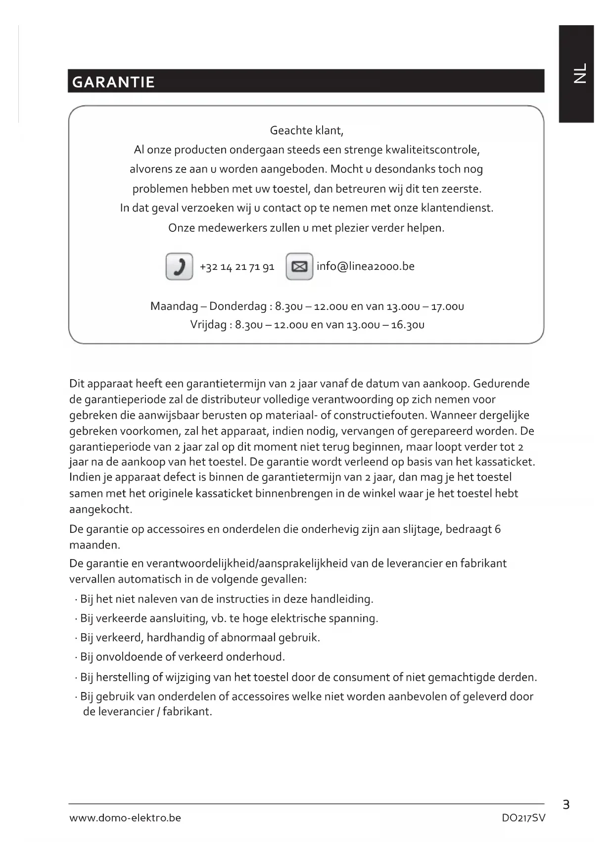 GARANTIE Geachte klant, Al onze producten ondergaan steeds een strenge kwaliteitscontrole, alvorens ze aan u worden aangeboden. Mocht u desondanks toch nog problemen hebben met uw toestel, dan betreuren wij dit ten zeerste. In dat geval verzoeken wij u contact op te nemen met onze klantendienst. Onze medewerkers zullen u met plezier verder helpen. +32 14 21 71 91 info@linea2000.be Maandag – Donderdag : 8.30u – 12.00u en van 13.00u – 17.00u Vrijdag : 8.30u – 12.00u en van 13.00u – 16.30u Dit apparaat heeft een garantietermijn van 2 jaar vanaf de datum van aankoop. Gedurende de garantieperiode zal de distributeur volledige verantwoording op zich nemen voor gebreken die aanwijsbaar berusten op materiaal- of constructiefouten. Wanneer dergelijke gebreken voorkomen, zal het apparaat, indien nodig, vervangen of gerepareerd worden. De garantieperiode van 2 jaar zal op dit moment niet terug beginnen, maar loopt verder tot 2 jaar na de aankoop van het toestel. De garantie wordt verleend op basis van het kassaticket. Indien je apparaat defect is binnen de garantietermijn van 2 jaar, dan mag je het toestel samen met het originele kassaticket binnenbrengen in de winkel waar je het toestel hebt aangekocht. De garantie op accessoires en onderdelen die onderhevig zijn aan slijtage, bedraagt 6 maanden. De garantie en verantwoordelijkheid/aansprakelijkheid van de leverancier en fabrikant vervallen automatisch in de volgende gevallen: