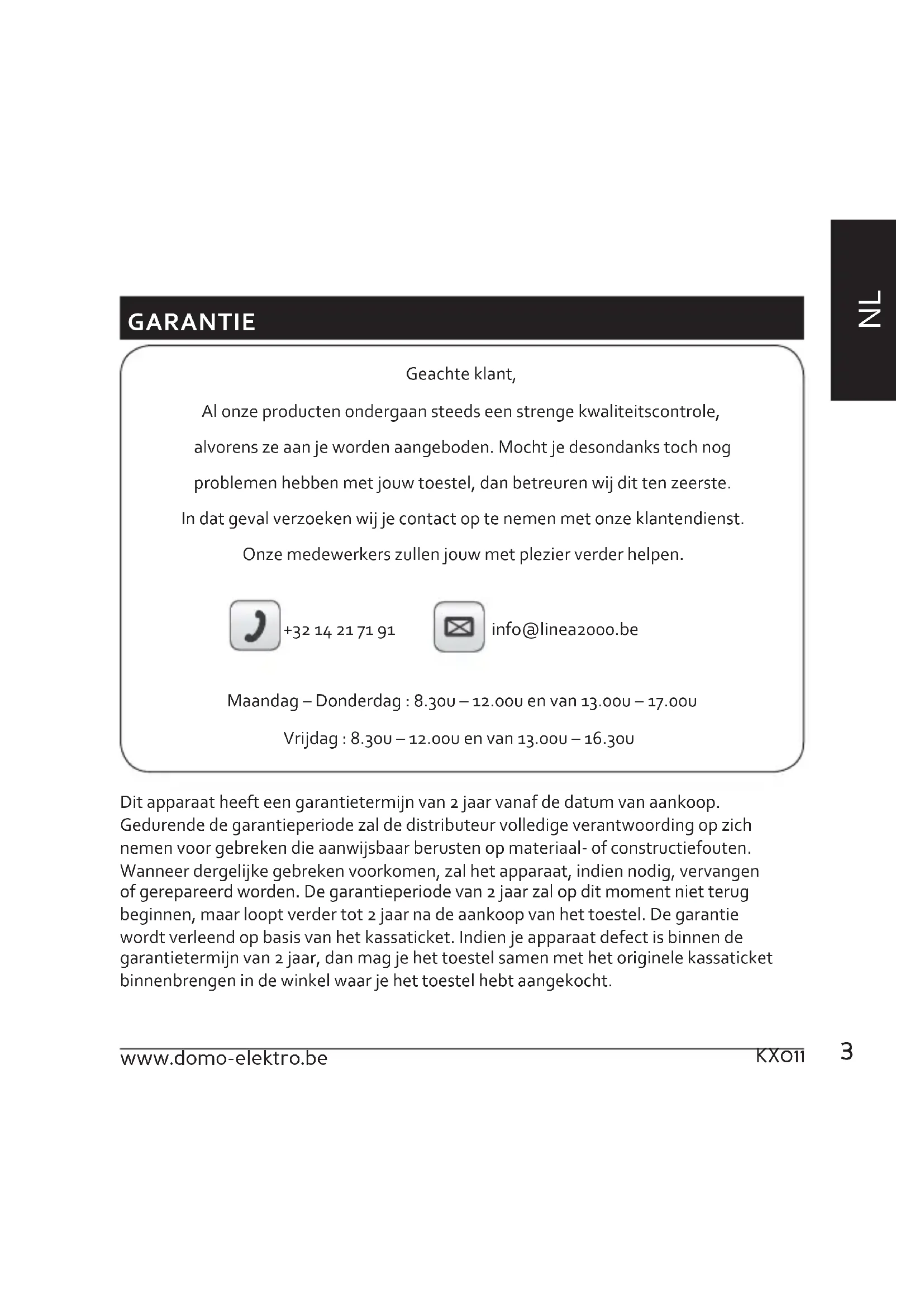 Dit apparaat heeft een garantietermijn van 2 jaar vanaf de datum van aankoop. Gedurende de garantieperiode zal de distributeur volledige verantwoording op zich nemen voor gebreken die aanwijsbaar berusten op materiaal- of constructiefouten. Wanneer dergelijke gebreken voorkomen, zal het apparaat, indien nodig, vervangen of gerepareerd worden. De garantieperiode van 2 jaar zal op dit moment niet terug beginnen, maar loopt verder tot 2 jaar na de aankoop van het toestel. De garantie wordt verleend op basis van het kassaticket. Indien je apparaat defect is binnen de garantietermijn van 2 jaar, dan mag je het toestel samen met het originele kassaticket binnenbrengen in de winkel waar je het toestel hebt aangekocht.