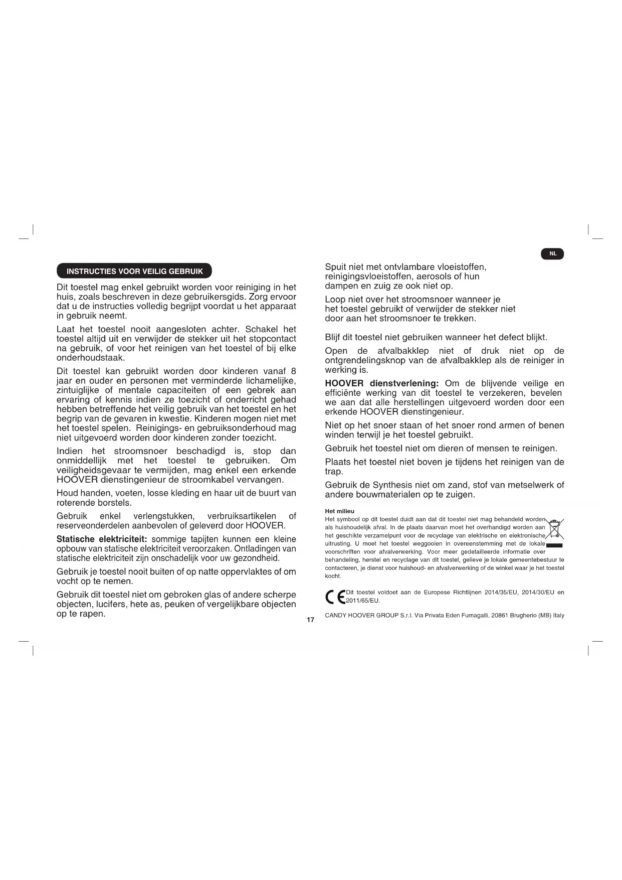 Dit toestel mag enkel gebruikt worden voor reiniging in het huis, zoals beschreven in deze gebruikersgids. Zorg ervoor dat u de instructies volledig begrijpt voordat u het apparaat in gebruik neemt. Laat het toestel nooit aangesloten achter. Schakel het toestel altijd uit en verwijder de stekker uit het stopcontact na gebruik, of voor het reinigen van het toestel of bij elke onderhoudstaak. Dit toestel kan gebruikt worden door kinderen vanaf 8 jaar en ouder en personen met verminderde lichamelijke, zintuiglijke of mentale capaciteiten of een gebrek aan ervaring of kennis indien ze toezicht of onderricht gehad hebben betreffende het veilig gebruik van het toestel en het begrip van de gevaren in kwestie. Kinderen mogen niet met het toestel spelen. Reinigings- en gebruiksonderhoud mag niet uitgevoerd worden door kinderen zonder toezicht. Indien het stroomsnoer beschadigd is, stop dan onmiddellijk met het toestel te gebruiken. Om veiligheidsgevaar te vermijden, mag enkel een erkende HOOVER dienstingenieur de stroomkabel vervangen. Houd handen, voeten, losse kleding en haar uit de buurt van roterende borstels. Gebruik enkel verlengstukken, verbruiksartikelen of reserveonderdelen aanbevolen of geleverd door HOOVER. Statische elektriciteit: sommige tapijten kunnen een kleine opbouw van statische elektriciteit veroorzaken. Ontladingen van statische elektriciteit zijn onschadelijk voor uw gezondheid. Gebruik je toestel nooit buiten of op natte oppervlaktes of om vocht op te nemen. Gebruik dit toestel niet om gebroken glas of andere scherpe objecten, lucifers, hete as, peuken of vergelijkbare objecten op te rapen. Spuit niet met ontvlambare vloeistoffen, reinigingsvloeistoffen, aerosols of hun dampen en zuig ze ook niet op. Loop niet over het stroomsnoer wanneer je het toestel gebruikt of verwijder de stekker niet door aan het stroomsnoer te trekken. Blijf dit toestel niet gebruiken wanneer het defect blijkt. Open de afvalbakklep niet of druk niet op de ontgrendelingsknop van de afvalbakklep als de reiniger in werking is. HOOVER dienstverlening: Om de blijvende veilige en efciënte werking van dit toestel te verzekeren, bevelen we aan dat alle herstellingen uitgevoerd worden door een erkende HOOVER dienstingenieur. Niet op het snoer staan of het snoer rond armen of benen winden terwijl je het toestel gebruikt. Gebruik het toestel niet om dieren of mensen te reinigen. Plaats het toestel niet boven je tijdens het reinigen van de trap. Gebruik de Synthesis niet om zand, stof van metselwerk of andere bouwmaterialen op te zuigen. Het milieu Het symbool op dit toestel duidt aan dat dit toestel niet mag behandeld worden als huishoudelijk afval. In de plaats daarvan moet het overhandigd worden aan het geschikte verzamelpunt voor de recyclage van elektrische en elektronische uitrusting. U moet het toestel weggooien in overeenstemming met de lokale voorschriften voor afvalverwerking. Voor meer gedetailleerde informatie over behandeling, herstel en recyclage van dit toestel, gelieve je lokale gemeentebestuur te contacteren, je dienst voor huishoud- en afvalverwerking of de winkel waar je het toestel kocht. Dit toestel voldoet aan de Europese Richtlijnen 2014/35/EU, 2014/30/EU en 2011/65/EU. CANDY HOOVER GROUP S.r.l. Via Privata Eden Fumagalli, 20861 Brugherio (MB) Italy NL18 A. Aan/uit-knop B. Filterbedekking pre-motor C. Hendel reservoir D. Binnenkant reservoir E. Ontgrendelingsknop reservoirklep F. Automatische volle bak detector G. Grendelknop slangeinde H. Slang