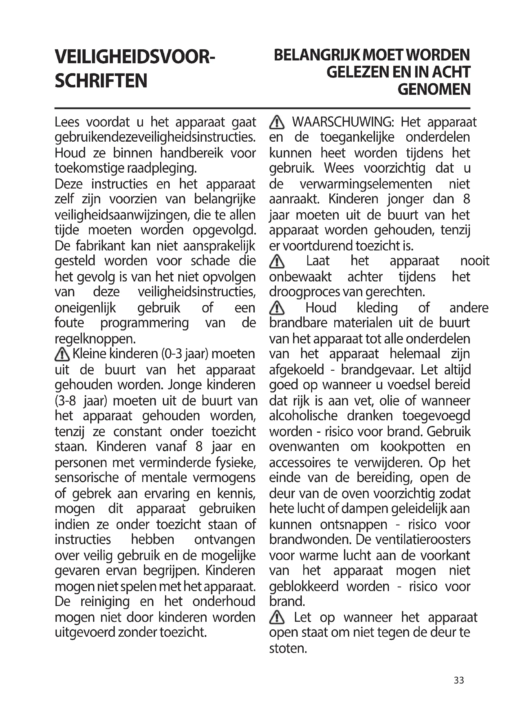 GENOMEN Lees voordat u het apparaat gaat gebruiken deze veiligheidsinstructies. Houd ze binnen handbereik voor toekomstige raadpleging. Deze instructies en het apparaat zelf zijn voorzien van belangrijke veiligheidsaanwijzingen, die te allen tijde moeten worden opgevolgd. De fabrikant kan niet aansprakelijk gesteld worden voor schade die het gevolg is van het niet opvolgen van deze veiligheidsinstructies, oneigenlijk gebruik of een foute programmering van de regelknoppen. Kleine kinderen (0-3jaar) moeten uit de buurt van het apparaat gehouden worden. Jonge kinderen (3-8 jaar) moeten uit de buurt van het apparaat gehouden worden, tenzij ze constant onder toezicht staan. Kinderen vanaf 8 jaar en personen met verminderde fysieke, sensorische of mentale vermogens of gebrek aan ervaring en kennis, mogen dit apparaat gebruiken indien ze onder toezicht staan of instructies hebben ontvangen over veilig gebruik en de mogelijke gevaren ervan begrijpen. Kinderen mogen niet spelen met het apparaat. De reiniging en het onderhoud mogen niet door kinderen worden uitgevoerd zonder toezicht. WAARSCHUWING: Het apparaat en de toegankelijke onderdelen kunnen heet worden tijdens het gebruik. Wees voorzichtig dat u de verwarmingselementen niet aanraakt. Kinderen jonger dan 8 jaar moeten uit de buurt van het apparaat worden gehouden, tenzij er voortdurend toezicht is. Laat het apparaat nooit onbewaakt achter tijdens het droogproces van gerechten. Houd kleding of andere brandbare materialen uit de buurt van het apparaat tot alle onderdelen van het apparaat helemaal zijn afgekoeld - brandgevaar. Let altijd goed op wanneer u voedsel bereid dat rijk is aan vet, olie of wanneer alcoholische dranken toegevoegd worden - risico voor brand. Gebruik ovenwanten om kookpotten en accessoires te verwijderen. Op het einde van de bereiding, open de deur van de oven voorzichtig zodat hete lucht of dampen geleidelijk aan kunnen ontsnappen - risico voor brandwonden. De ventilatieroosters voor warme lucht aan de voorkant van het apparaat mogen niet geblokkeerd worden - risico voor brand. Let op wanneer het apparaat open staat om niet tegen de deur te stoten.34 TOEGESTAAN GEBRUIK VOORZICHTIG: het apparaat is niet geschikt voor inwerkingstelling met een externe schakelaar zoals een timer, of een afzonderlijk systeem met afstandsbediening. Dit apparaat is bedoeld voor gebruik in huishoudelijke en gelijkaardige toepassingen zoals: personeelskeukens in winkels, kantoren en overige werkomgevingen; landbouwbedrijven; klanten in hotels, motels, bed & breakfast en andere residentiële omgevingen. Elk ander gebruik is verboden (bijv. als kamerverwarming). Dit apparaat is niet voor professioneel gebruik bestemd. Gebruik het apparaat niet buiten. Bewaar geen explosief of ontvlambaar materiaal (vb. benzine of spuitbussen) in of naast het apparaat - brandgevaar. INSTALLATIE Het apparaat moet verplaatst en geïnstalleerd worden door twee of meer personen - risico voor verwondingen. Gebruik beschermende handschoenen om uit te pakken en te installeren - risico voor snijwonden. Laat de installatie, m.i.v. de aansluiting op het waternet (indien van toepassing) en de elektrische aansluitingen en reparaties door een gekwaliceerd technicus verrichten. Repareer of vervang geen enkel onderdeel van het apparaat, behalve als dit expliciet aangegeven wordt in de gebruikershandleiding. Houd kinderen uit de buurt van de installatieplaats. Controleer na het uitpakken van het apparaat of het tijdens het transport geen beschadigingen heeft opgelopen. Neem in geval van problemen contact op met uw leverancier of de dichtstbijzijnde Consumentenservice. Na de installatie moet het verpakkingsmateriaal (plastic, piepschuim enz.) buiten het bereik van kinderen bewaard worden - risico voor verstikking. Het apparaat moet worden losgekoppeld van het elektriciteitsnet voordat u installatiewerkzaamheden uitvoert - risico voor elektrocutie. Tijdens de installatie dient u ervoor te zorgen dat het apparaat de voedingskabel niet beschadigt - risico voor brand of elektrocutie. Activeer het apparaat alleen als de installatie is voltooid. Voer eerst alle zaagwerkzaamheden uit en verwijder alle spaanders en zaagresten voordat u het apparaat plaatst. Haal het apparaat pas voor de installatie van de piepschuim bodem. Het onderste gedeelte van het apparaat mag niet meer toegankelijk zijn na de installatie. Installeer het apparaat niet achter een decoratieve deur - brandgevaar. ELEKTRISCHE WAARSCHUWINGEN Het typeplaatje bevindt zich op de voorrand van het apparaat (zichtbaar35 wanneer de verwarmingslade openstaat). Het moet mogelijk zijn het apparaat van het elektriciteitsnet af te koppelen door de stekker uit het stopcontact te halen of via een meerpolige netschakelaar die bovenstrooms van het stopcontact is geplaatst conform de bedradingsvoorschriften en het apparaat dient geaard te zijn conform de nationale veiligheidsnormen voor elektriciteit. Gebruik geen verlengsnoeren, meervoudige stopcontacten of adapters. Als de installatie voltooid is, mogen de elektrische onderdelen niet meer toegankelijk zijn voor de gebruiker. Gebruik het apparaat niet wanneer u natte voeten hebt of blootsvoets bent. Gebruik het apparaat niet als de stroomkabel of de stekker beschadigd is, als het apparaat niet goed werkt of als het beschadigd of gevallen is. Als het netsnoer beschadigd is, moet het vervangen worden door een identiek exemplaar door de fabrikant, een servicevertegenwoordiger of gekwaliceerd personeel om risico's te voorkomen - risico op elektrische schokken. Wend u tot een erkend servicecentrum indien de stroomkabel vervangen moet worden.