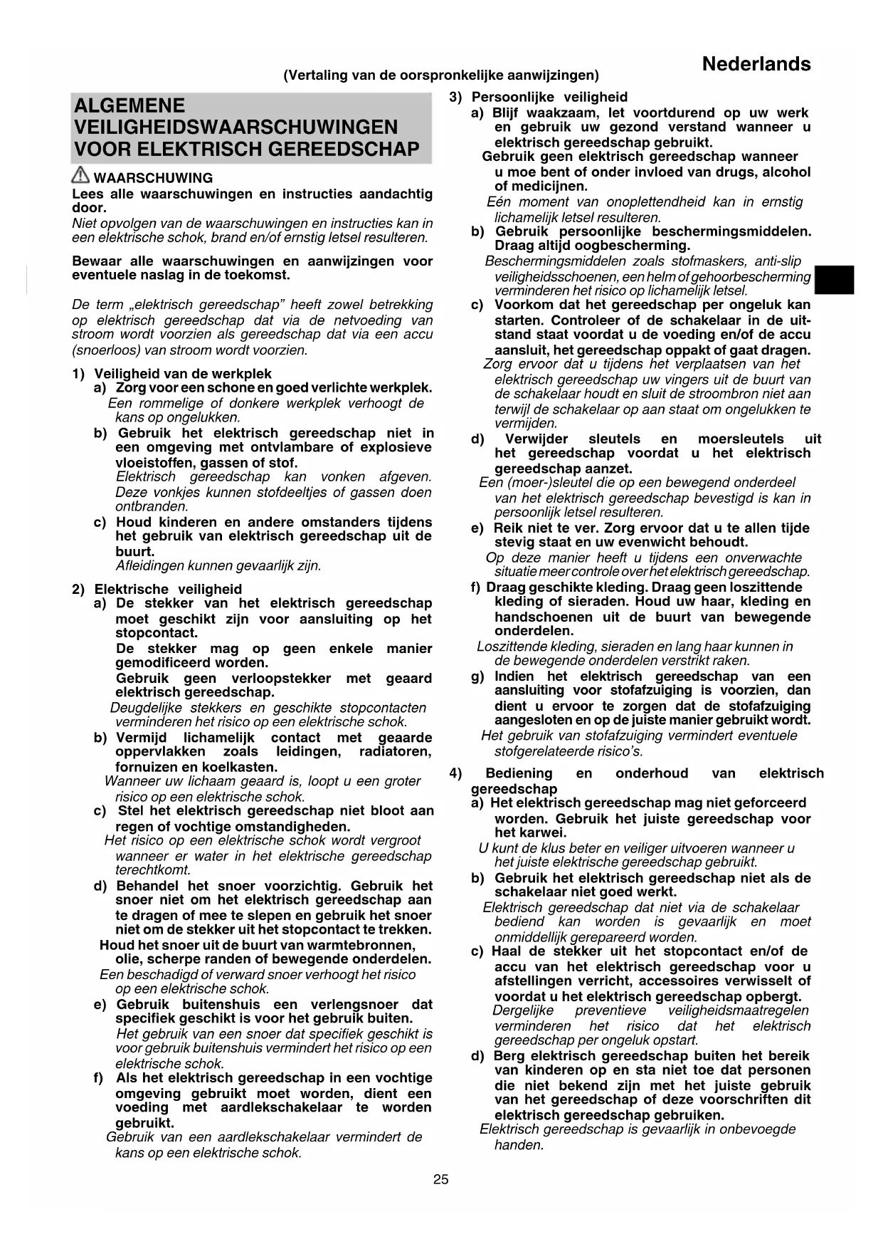 WAARSCHUWING Lees alle waarschuwingen en instructies aandachtig door. Niet opvolgen van de waarschuwingen en instructies kan in een elektrische schok, brand en/of ernstig letsel resulteren. Bewaar alle waarschuwingen en aanwijzingen voor eventuele naslag in de toekomst. De term „elektrisch gereedschap” heeft zowel betrekking op elektrisch gereedschap dat via de netvoeding van stroom wordt voorzien als gereedschap dat via een accu (snoerloos) van stroom wordt voorzien.