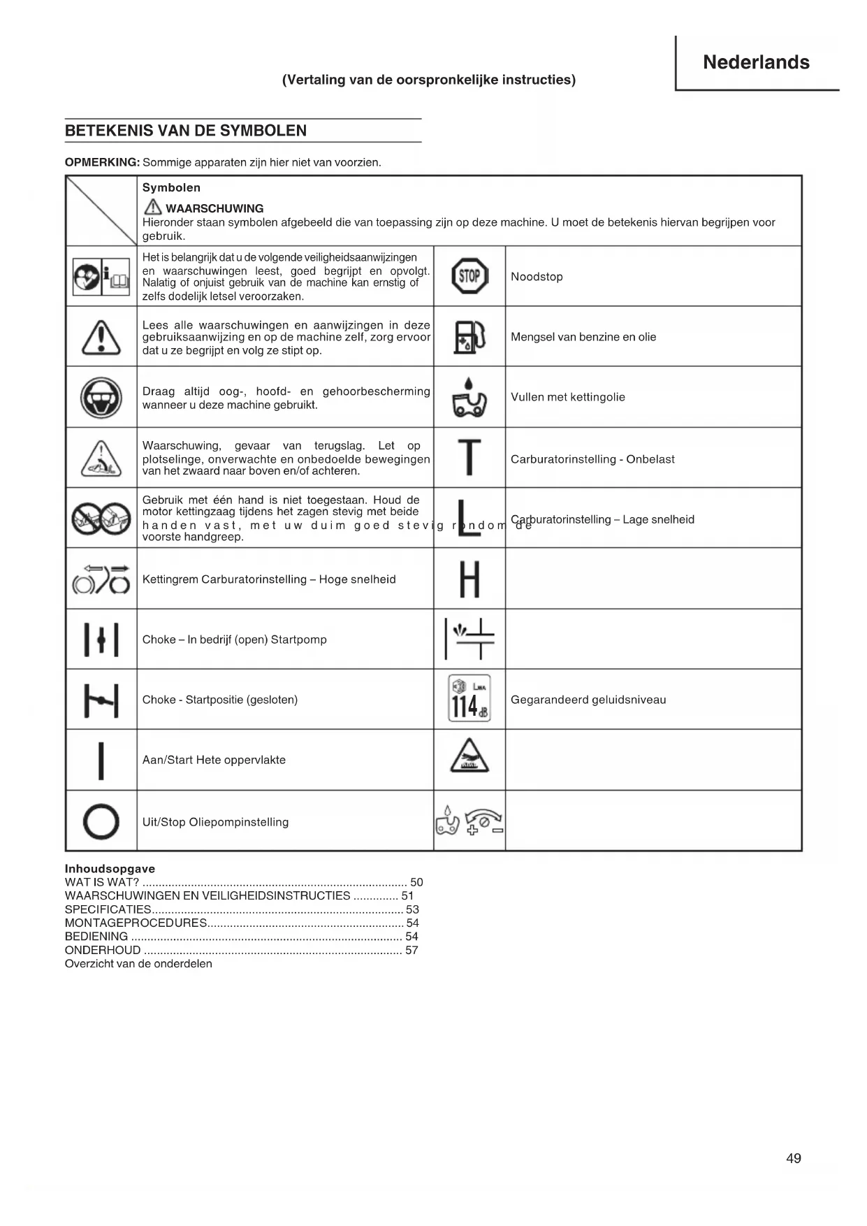 Gegarandeerd geluidsniveau Aan/Start Hete oppervlakte Uit/Stop Oliepompinstelling Inhoudsopgave