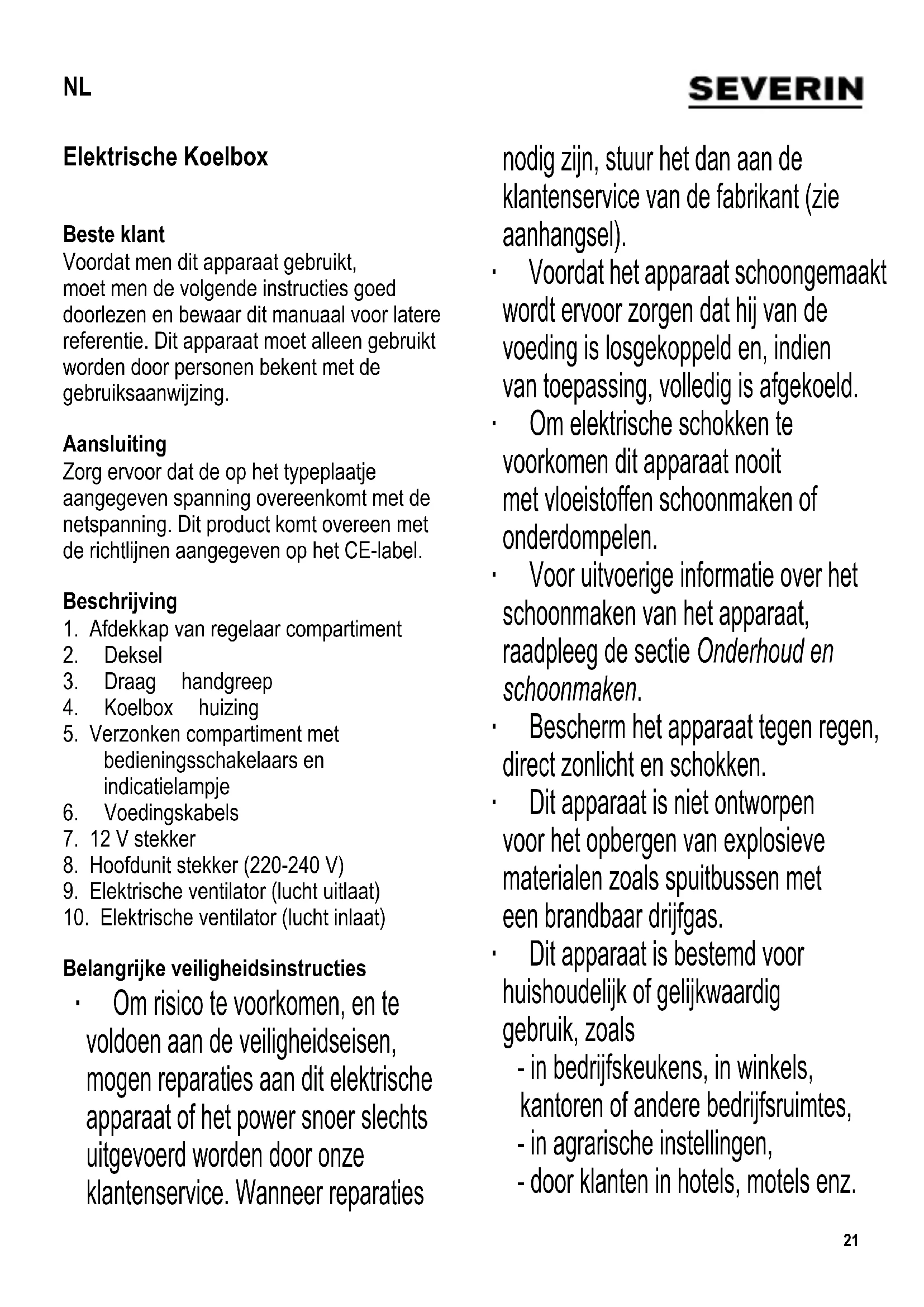 Temps de conservation des aliments en cas de panne, H -- Capacité de congélation, kg/24 H -- Classe climatique SN, N Plage de température ambiante, °C 10-32 °C Emission de bruit 35 dB(a) Dimensions (H x L x P) en mm 420 x 400 x 285 Poids, kg 4,0 Alimentation Voir plaque signalétique21 Elektrische Koelbox Beste klant Voordat men dit apparaat gebruikt, moet men de volgende instructies goed doorlezen en bewaar dit manuaal voor latere referentie. Dit apparaat moet alleen gebruikt worden door personen bekent met de gebruiksaanwijzing. Aansluiting Zorg ervoor dat de op het typeplaatje aangegeven spanning overeenkomt met de netspanning. Dit product komt overeen met de richtlijnen aangegeven op het CE-label. Beschrijving