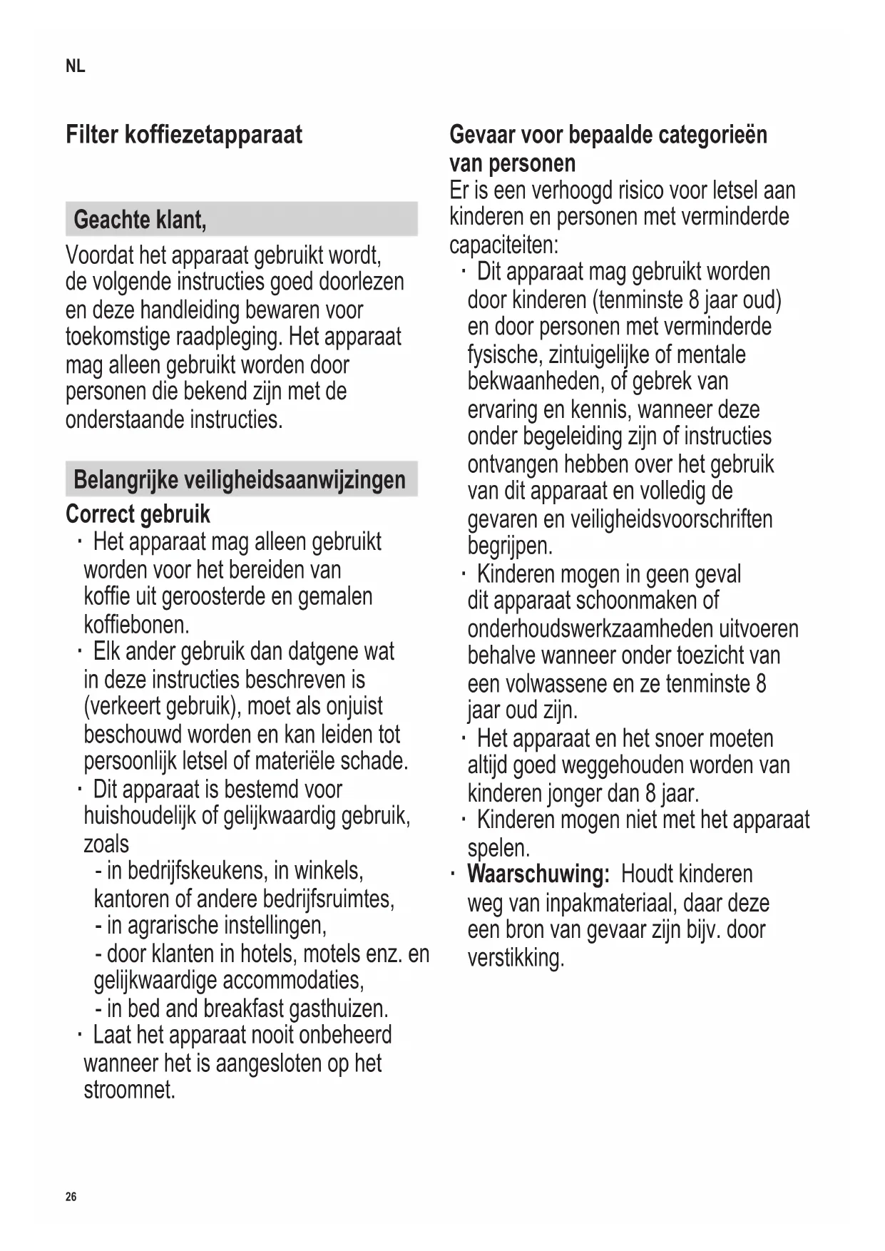 Dans le cas où vous ne pouvez résoudre le problème à l’aide de ce tableau, veuillez contacter notre Service Clientèle. Les coordonnées se trouvent dans l’appendice de ce mode d’emploi.26 142 x 208 mm Filter kofezetapparaat Geachte klant, Voordat het apparaat gebruikt wordt, de volgende instructies goed doorlezen en deze handleiding bewaren voor toekomstige raadpleging. Het apparaat mag alleen gebruikt worden door personen die bekend zijn met de onderstaande instructies. Belangrijke veiligheidsaanwijzingen Correct gebruik ∙ Het apparaat mag alleen gebruikt worden voor het bereiden van kofe uit geroosterde en gemalen kofebonen. ∙ Elk ander gebruik dan datgene wat in deze instructies beschreven is (verkeert gebruik), moet als onjuist beschouwd worden en kan leiden tot persoonlijk letsel of materiële schade. ∙ Dit apparaat is bestemd voor huishoudelijk of gelijkwaardig gebruik, zoals - in bedrijfskeukens, in winkels, kantoren of andere bedrijfsruimtes, - in agrarische instellingen, - door klanten in hotels, motels enz. en gelijkwaardige accommodaties, - in bed and breakfast gasthuizen. ∙ Laat het apparaat nooit onbeheerd wanneer het is aangesloten op het stroomnet. Gevaar voor bepaalde categorieën van personen Er is een verhoogd risico voor letsel aan kinderen en personen met verminderde capaciteiten: ∙ Dit apparaat mag gebruikt worden door kinderen (tenminste 8 jaar oud) en door personen met verminderde fysische, zintuigelijke of mentale bekwaanheden, of gebrek van ervaring en kennis, wanneer deze onder begeleiding zijn of instructies ontvangen hebben over het gebruik van dit apparaat en volledig de gevaren en veiligheidsvoorschriften begrijpen. ∙ Kinderen mogen in geen geval dit apparaat schoonmaken of onderhoudswerkzaamheden uitvoeren behalve wanneer onder toezicht van een volwassene en ze tenminste 8 jaar oud zijn. ∙ Het apparaat en het snoer moeten altijd goed weggehouden worden van kinderen jonger dan 8 jaar. ∙ Kinderen mogen niet met het apparaat spelen. ∙ Waarschuwing: Houdt kinderen weg van inpakmateriaal, daar deze een bron van gevaar zijn bijv. door verstikking. NL27 142 x 208 mm Gevaar voor elektrische schokken Het apparaat werkt op elektriciteit, dus is er altijd het risico van een elektrische schok. De volgende voorzorgsmaatregelen moeten daarvoor getroffen worden: ∙ Voordat het apparaat wordt gebruikt moet zowel de hoofdeenheid inclusief het netsnoer als gelijk welk hulpstuk dat wordt aangebracht, eerst zorgvuldig op eventuele defecten worden gecontroleerd. Ingeval het apparaat, bijvoorbeeld, op een hard oppervlak is gevallen, of wanneer men met overdadige kracht aan het netsnoer getrokken heeft, mag men het niet meer gebruiken: zelfs onzichtbare beschadiging kan ongewenste effecten hebben op de gebruiksveiligheid van het apparaat. ∙ Dit apparaat mag alleen aangesloten worden op een stopcontact wat volgens de voorschriften geïnstalleerd is. Zorg ervoor dat de op het typeplaatje aangegeven spanning overeenkomt met de netspanning. ∙ Verwijder altijd de stekker uit het stopcontact: - na gebruik, - wanneer het apparaat niet werkt, - wanneer men het apparaat schoonmaakt. ∙ Trek de stekker niet aan het snoer uit het stopcontact, trek aan de stekker zelf. ∙ De stekker niet aanraken met natte handen. ∙ Het apparaat niet in water of een andere vloeistof onderdompelen en niet schoonmaken onder de kraan. Gevaar voor brandwonden Het apparaat verwarmt het water en houdt het warm. De uitwendige oppervlakken, de karaf en warmhoudplaat worden heet tijdens het gebruik en blijven nog even heet zelfs na gebruik. Er bestaat dus gevaar voor verbranding of brandwonden. ∙ Raak deze delen niet aan tijdens gebruik: na gebruik deze eerst af laten koelen. ∙ De zwenklter niet openen tijdens gebruik. ∙ Het apparaat altijd eerst gedurende circa 5 minuten laten afkoelen na gebruik voordat het zwenklter geopend wordt of hij met kraanwater gevuld wordt. Slechte hygiëne Slechte hygiëne kan resulteren in het ontstaan van bacteriën in het apparaat: ∙ Maak het apparaat helemaal schoon voordat het voor de eerste keer wordt gebruikt. ∙ Haal altijd de stekker uit het stopcontact en laat het apparaat geheel afkoelen voordat men het schoonmaakt. ∙ De inleglter en karaf moeten dagelijks schoongemaakt worden. ∙ Laat nooit water in de container. ∙ Het apparaat moet regelmatig ontkalkt worden. ∙ Gedetailleerde informatie over het schoonmaken van het apparaat vindt u in de paragraaf: Onderhoud en28 142 x 208 mm schoonmaken. Gevaar voor beschadiging van het apparaat Onjuist gebruik van het apparaat kan schade veroorzaken