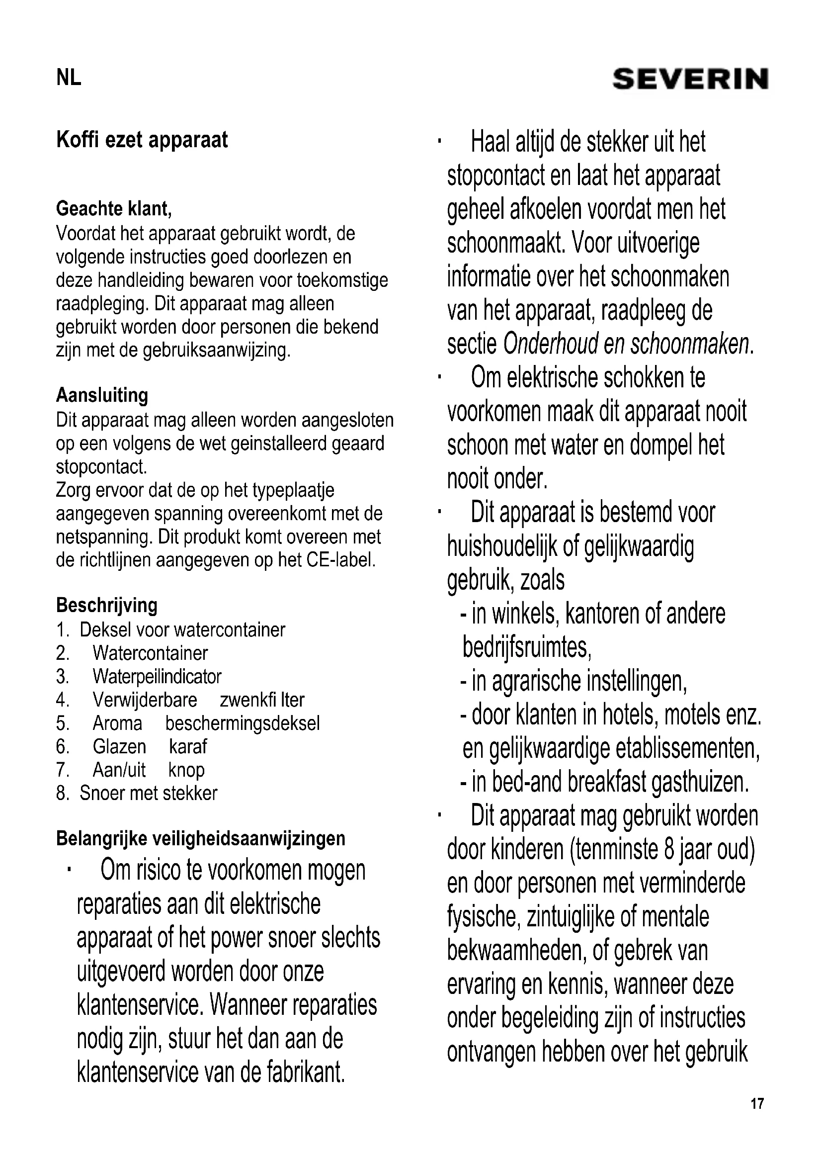 Belangrijke veiligheidsaanwijzingen ∙ Om risico te voorkomen mogen reparaties aan dit elektrische apparaat of het power snoer slechts uitgevoerd worden door onze klantenservice. Wanneer reparaties nodig zijn, stuur het dan aan de klantenservice van de fabrikant. ∙ Haal altijd de stekker uit het stopcontact en laat het apparaat geheel afkoelen voordat men het schoonmaakt. Voor uitvoerige informatie over het schoonmaken van het apparaat, raadpleeg de sectie Onderhoud en schoonmaken. ∙ Om elektrische schokken te voorkomen maak dit apparaat nooit schoon met water en dompel het nooit onder. ∙ Dit apparaat is bestemd voor huishoudelijk of gelijkwaardig gebruik, zoals - in winkels, kantoren of andere bedrijfsruimtes, - in agrarische instellingen, - door klanten in hotels, motels enz. en gelijkwaardige etablissementen, - in bed-and breakfast gasthuizen. ∙ Dit apparaat mag gebruikt worden door kinderen (tenminste 8 jaar oud) en door personen met verminderde fysische, zintuiglijke of mentale bekwaamheden, of gebrek van ervaring en kennis, wanneer deze onder begeleiding zijn of instructies ontvangen hebben over het gebruik NL18 van dit apparaat en volledig de gevaren en veiligheidsvoorschriften begrijpen. ∙ Kinderen mogen niet met het apparaat spelen. ∙ Kinderen mogen in geen geval dit apparaat schoonmaken of onderhoudswerkzaamheden uitvoeren behalve wanneer onder toezicht van een volwassene en ze tenminste 8 jaar oud zijn. ∙ Het apparaat en het snoer moeten altijd goed weggehouden worden van kinderen jonger dan 8 jaar. ∙ Waarschuwing: houdt kinderen weg van inpakmateriaal, daar deze een bron van gevaar zijn b.v. door verstikking. ∙ Voordat het apparaat wordt gebruikt moet zowel de hoofdeenheid inclusief het powersnoer als gelijk welk hulpstuk, dat wordt aangebracht, eerst zorgvuldig op eventuele defecten worden gecontroleerd. Ingeval het apparaat, bijvoorbeeld, op een hard oppervlak is gevallen, of wanneer men met overdadige kracht aan het power snoer getrokken heeft, mag men het niet meer gebruiken: zelfs onzichtbare beschadiging kan ongewenste effecten hebben op de gebruiksveiligheid van het apparaat. ∙ Voor gebruik moet men zorgen dat de handgreep van de glazen karaf is juist en veilig gemonteerd. Wanneer nodig mag de metalen ring aangedraaid worden door middel van de schroef in de handgreep. ∙ Tijdens het gebruik moet men zorgen dat het koffi ezet apparaat op een vlakke en non-slip ondergrond geplaatst is die tegen spetteren en vlekken kan. ∙ Zorg ervoor dat het apparaat en het snoer niet in aanraking komen met een hete ondergrond of andere hittebronnen. ∙ Pas op: de hete plaat word zeer heet tijdens gebruik. ∙ Om het gevaar van uitstoten van heet water of stoom te voorkomen, moet men het koffi ezetapparaat altijd uitschakelen en voldoende tijd geven om af te koelen voordat het opent of accessoires of hulpstukken verwijderd. ∙ Kinderen moeten onder begeleiding zijn om ervoor te zorgen dat ze niet met het apparaat spelen. ∙ Verwijder de stekker uit het stopcontact - in geval het niet juist functioneert, - tijdens het schoonmaken, - wanneer het apparaat niet gebruikt wordt voor een langere periode. ∙ Trek de stekker niet aan het snoer uit het stopcontact, trek aan de stekker zelf. ∙ Laat het snoer nooit los hangen: het snoer moet vrijgehouden worden van hete onderdelen van het apparaat. ∙ Wordt dit apparaat op een verkeerde manier gebruikt of worden de veiligheidsregels niet gevolgd, dan kan de fabrikant niet aansprakelijk worden gesteld voor eventuele schades. Gebruik voor de eerste keer Voordat men het apparaat voor het eerst gebruikt moet men eerst twee of drie keer het fi ltersysteem laten draaien met de maximale hoeveelheid water maar zonder het gebruik van koffi epoeder. Dit moet men19 ook doen wanneer men het apparaat voor een langere tijd gebruikt heeft, en na het ontkalken. Algemene informatie ∙ Een maat schaal op de watercontainer en op de glazen karaf helpt met het vullen van de container met de juiste hoeveelheid schoon water. Met een dubbele schaal, de linker schaal is gebruikt voor normale maat koffi ekoppen van ongeveer 125ml, terwijl de rechter schaal gebruikt wordt voor kleinere koppen. Zorg ervoor dat de maximale hoeveelheid water niet overschreden wordt. ∙ Wanneer meerdere brouwcycles nodig zijn moet men het koffi ezetapparaat na iedere cycle uitschakelen en het apparaat voor ongeveer 5 minuten laten afkoelen. ∙ Belangrijke aanwijzing: Wanneer men het apparaat vult met vers water kort nadat men een brouwcycle volbracht heeft is er gevaar van verbranding van heet water of stoom wat ontsnapt van de wateruitgang. Maken van koffi e ∙ Vullen met water: Open de watercontainerdeksel en vul de container met de gewenste hoeveelheid water en sluit de deksel. ∙ Inzetten van de papieren fi lter: Open de zwenkfi lter zijwaarts en plaats een maat-4 papieren fi lter; men moet eerst de geperforeerde kanten van de fi lter omvouwen. ∙ Vullen met gemalen koffi e: Voor een normale maat koffi ekop (125ml), een maat van ongeveer 6 g (= 1½ - 2 theelepels) fi jngemalen koffi e moet afgemeten worden. Sluit hierna de zwenkfi lter. ∙ Voorbereiden van de glazen karaf: Plaats de aromaprotectiedeksel op de karaf, en plaats dan de karaf in het apparaat. Wanneer het correct geplaatst is zal de deksel het drip-stopmechanisme in de fi lterhouder afzetten tijdens de brouwcycle. ∙ Starten van de brouwcycle: Stop de stekker in het stopcontact en gebruik de Aan/Uit knop om het koffi ezet apparaat aan te zetten. De fi ltercycle start en het water passeert door de fi lter. ∙ Verwijderen van de glazen karaf: Wacht tot al het water door de fi lter gepasseerd is voordat men de karaf verwijderd van het apparaat. ∙ Uitschakelen van het koffi ezetapparaat: De koffi e kan warmgehouden worden in de karaf door deze op de hete plaat te laten staan. De plaat wordt warmgehouden totdat het apparaat uitgeschakeld is. Schakel het apparaat altijd uit na gebruik en verwijd