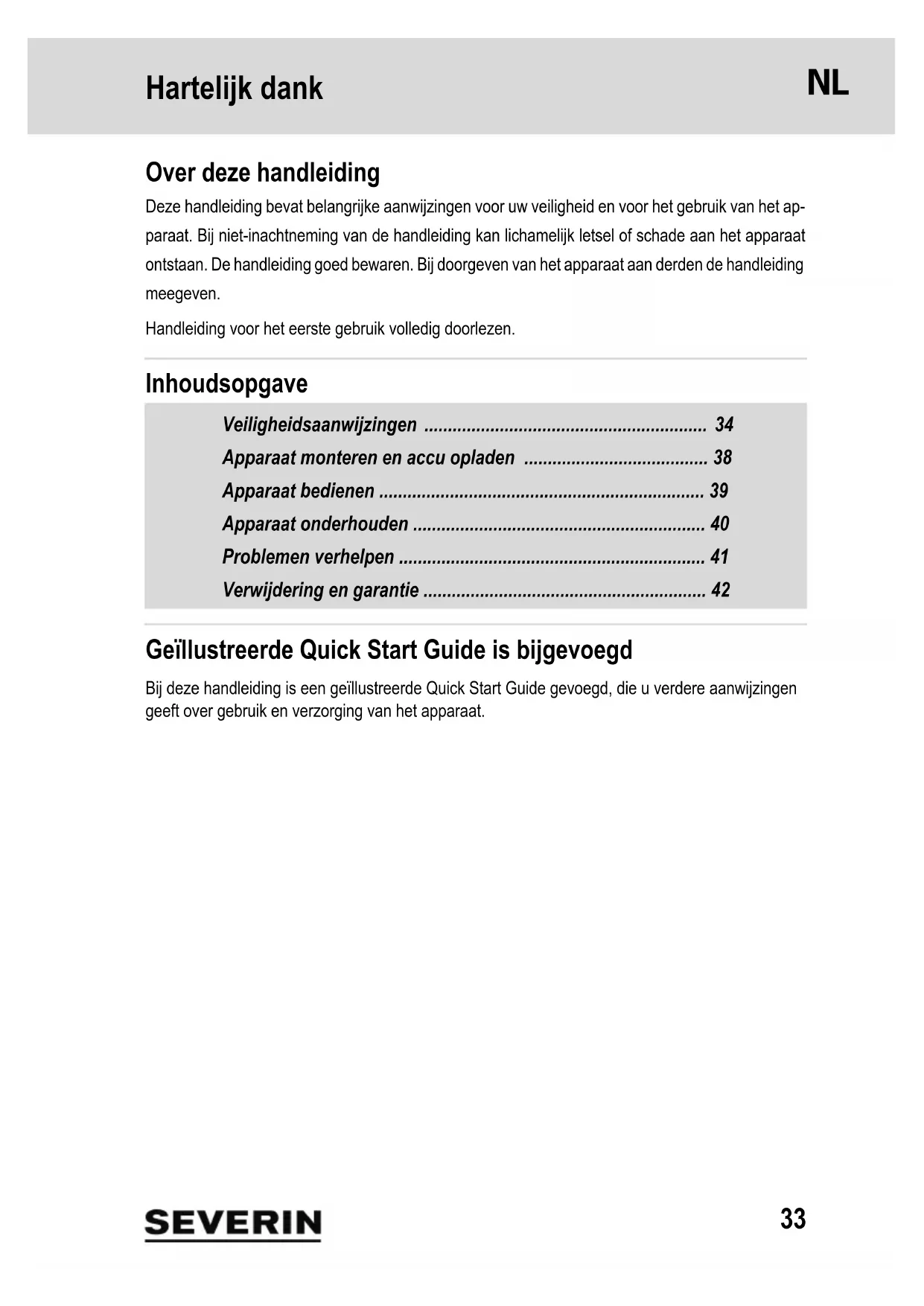 - Mise au rebut séparée de l’appareil et de la batterie Les appareils et batteries sur lesquels figurent ce symbole ne doivent pas être jetés avec les ordures ménagères. Ils contiennent des matières premières précieuses, susceptibles d’être recyclées. En les mettant au rebut de manière conforme, vous contribuez à la protection de l’environnement et de la santé d’autrui. Renseignez- vous auprès de votre administration communale ou de votre revendeur pour savoir où le mettre au rebut. Garantie Les droits de garantie légaux vis-à-vis du vendeur et d’éventuelles garanties offertes par ce dernier persistent indépendamment des clauses de garantie définies ci-après. S’il était nécessaire de réparer l’appareil, contactez notre service après-vente par téléphone ou par courriel. Vous trouverez ses coordonnées dans les annexes de cette notice. Sinon, adressez-vous directement à votre revendeur pour faire jouer la garantie. SEVERIN vous assure également la garantie du fabricant pendant deux années à partir de la date d’achat. Pendant cette période, nous réparerons gratuitement toutes les pannes imputables à un défaut de matériel ou de fabrication et qui entraveraient sensiblement le fonctionnement de l’appareil. Tout autre recours est exclu. Sont exclus de la garantie : les dommages causés par le non-respect des conditions d’utilisation, une manipulation incorrecte, l’usure normale, ainsi que les pièces fragiles (les parties en verre, en plastique ou les ampoules). Sont également exclus de la garantie les batteries et accumulateurs de- venus défectueux ou à la durée de vie réduite à la suite d’une usure normale ou d’un maniement incorrect. La garantie perd sa validité en cas d’intervention d’un réparateur non agréé par SEVERIN.33 Hartelijk dank 1 Hartelijk d ank Over deze handleiding Deze handleiding bevat belangrijke aanwijzingen voor uw veiligheid en voor het gebruik van het ap- paraat. Bij niet-inachtneming van de handleiding kan lichamelijk letsel of schade aan het apparaat ontstaan. De handleiding goed bewaren. Bij doorgeven van het apparaat aan derden de handleiding meegeven. Handleiding voor het eerste gebruik volledig doorlezen. Inhoudsopgave Veiligheidsaanwijzingen p. 34