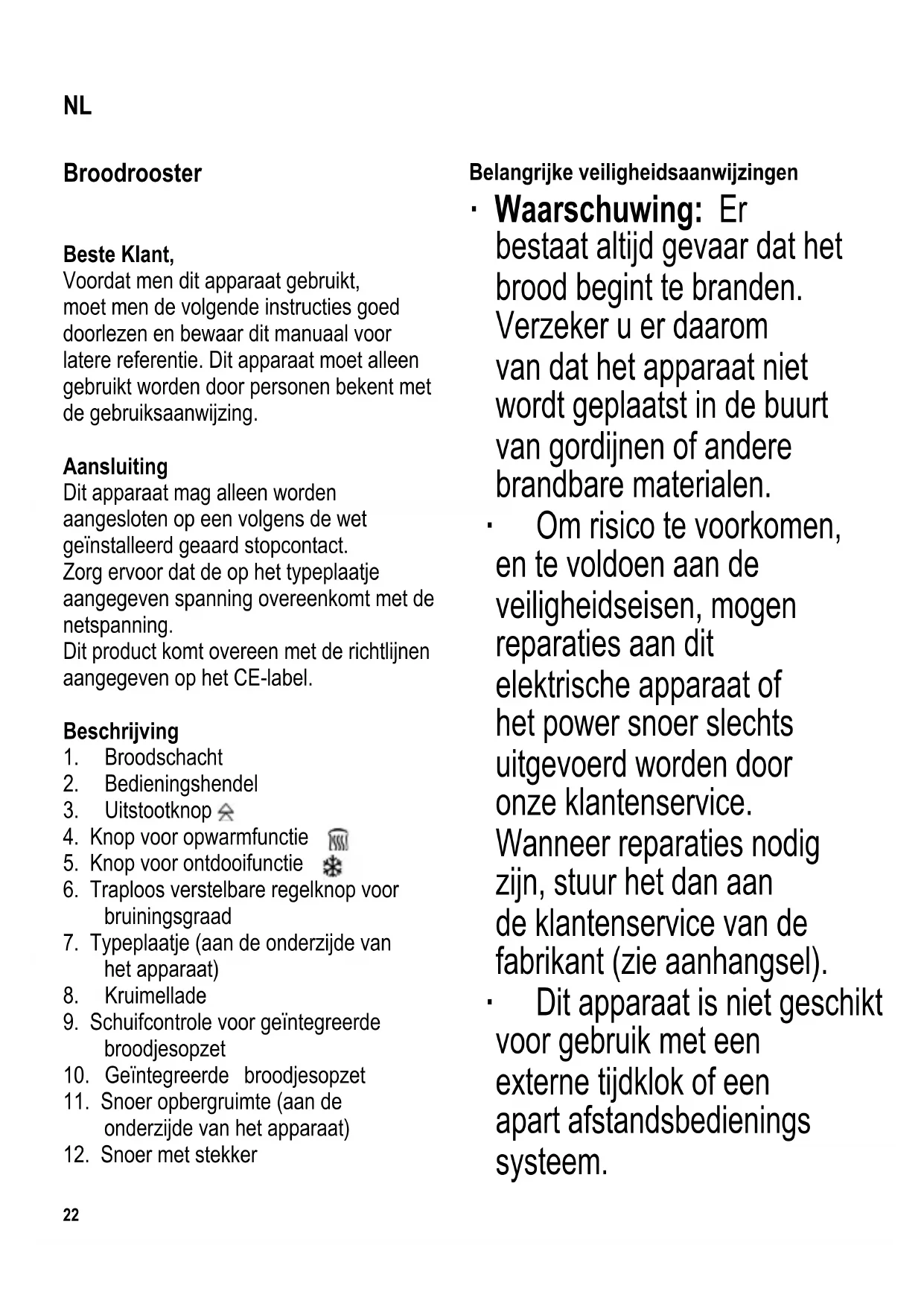 Belangrijke veiligheidsaanwijzingen ∙ Waarschuwing: Er bestaat altijd gevaar dat het brood begint te branden. Verzeker u er daarom van dat het apparaat niet wordt geplaatst in de buurt van gordijnen of andere brandbare materialen. ∙ Om risico te voorkomen, en te voldoen aan de veiligheidseisen, mogen reparaties aan dit elektrische apparaat of het power snoer slechts uitgevoerd worden door onze klantenservice. Wanneer reparaties nodig zijn, stuur het dan aan de klantenservice van de fabrikant (zie aanhangsel). ∙ Dit apparaat is niet geschikt voor gebruik met een externe tijdklok of een apart afstandsbedienings systeem. NL23 ∙ Haal altijd de stekker uit het stopcontact en laat het apparaat geheel afkoelen voordat men het schoonmaakt. ∙ Om elektrische schokken te voorkomen dit apparaat nooit met vloeistoffen schoonmaken of onderdompelen. ∙ Om de behuizing schoon te maken, is het alleen nodig om de buitenkant af te vegen met een licht- vochtige doek. ∙ Trek de kruimellade zijwaarts uit het broodrooster om deze kruimels te verwijderen en maak de kruimellade schoon. Zorg ervoor dat men de kruimellade terug plaatst voordat men de broodrooster weer gebruikt. ∙ Dit apparaat is bestemd voor huishoudelijk of gelijkwaardig gebruik, zoals - in bedrijfskeukens, in winkels, kantoren of andere bedrijfsruimtes, - in agrarische instellingen, - door klanten in hotels, motels enz. en gelijkwaardige accommodaties, - in bed and breakfast gasthuizen. ∙ Dit apparaat mag gebruikt worden door kinderen (tenminste 8 jaar oud) en door personen met verminderde fysische, zintuigelijke of mentale bekwaanheden, of gebrek van ervaring en kennis, wanneer deze onder begeleiding zijn of instructies ontvangen hebben over het gebruik van dit apparaat en volledig de gevaren en veiligheidsvoorschriften24 begrijpen. ∙ Kinderen mogen niet met het apparaat spelen. ∙ Kinderen mogen in geen geval dit apparaat schoonmaken of onderhoudswerkzaamheden uitvoeren behalve wanneer onder toezicht van een volwassene en ze tenminste 8 jaar oud zijn. ∙ Het apparaat en het snoer moeten altijd goed weggehouden worden van kinderen jonger dan 8 jaar. ∙ Waarschuwing: Houdt kinderen weg van inpakmateriaal, daar deze een bron van gevaar zijn b.v. door verstikking. ∙ Zet het apparaat altijd rechtopstaand neer op een vlak en hittebestendig oppervlak. ∙ Om beschadiging aan de huizing te voorkomen moet men het apparaat niet op of in de buurt van hete oppervlakken (b.v. het fornuis of open vuur) plaatsen of bedienen. ∙ Attentie: Tijdens gebruik kunnen nabijgelegen oppervlakken heet worden. Verbranding kan plaatsvinden bij het aanraken van hete onderdelen. ∙ Voordat het apparaat wordt gebruikt moet zowel de hoofdeenheid inclusief het powersnoer als gelijk welk hulpstuk, dat wordt aangebracht, eerst zorgvuldig op eventuele defecten worden gecontroleerd. Ingeval het apparaat, bijvoorbeeld, op een hard oppervlak is gevallen, of wanneer men met overdadige kracht aan het power snoer getrokken heeft, mag men het niet meer gebruiken: zelfs onzichtbare beschadiging kan ongewenste effecten hebben op de gebruiksveiligheid van het apparaat. ∙ Zorg dat het snoer niet in aanraking komt met een hete ondergrond. ∙ Laat het snoer nooit los hangen. ∙ Laat dit apparaat nooit onbeheerd achter. ∙ Dek de broodschacht nooit af tijdens gebruik. ∙ Plaats geen broodjes rechtstreeks op de broodrooster sleuven. ∙ Voorzichtig: Om schade aan het apparaat te voorkomen, geen sneeën brood opwarmen op de broodjes houder. ∙ Probeer nooit brood uit het broodrooster te verwijderen met de vingers. Gebruik nooit objecten zoals messen/ vorken in de broodschacht; de verwarmingselementen staan onder elektrische spanning. ∙ Verwijder altijd de stekker uit het stopcontact: - na gebruik, - wanneer het apparaat niet werkt, - wanneer men het apparaat schoonmaakt. ∙ Trek de stekker niet aan het snoer uit het stopcontact, trek aan de stekker zelf. ∙ Wordt dit apparaat op een verkeerde25 manier gebruikt of worden de veiligheidsregels niet gevolgd, dan kan de fabrikant niet aansprakelijk worden gesteld voor eventuele schades. Juist gebruik ∙ Dit apparaat is uitsluitend bestemd voor het roosteren van een enkele snee brood per broodrooster sleuf en voor het opwarmen van broodjes op de broodjes houder. ∙ Het proberen te roosteren van meerdere sneeën brood in één sleuf of het bruinen (gratineren) van andere etenswaren is niet toegestaan. ∙ Gebruik geen etenswaren met wat voor soort vulling of beleg dan ook (bijv. boter of jam) in of op dit apparaat. ∙ Elk ander gebruik dan datgene wat in deze instructies beschreven is, moet als onjuist beschouwd worden en kan leiden tot persoonlijk letsel of materiële schade. Gebruik Algemene informatie ∙ Waarschuwing: De bedieningshendel werkt alleen wanneer de stekker in het stopcontact zit. ∙ Gebruik geen sneetjes die te dik of te groot zijn. Deze kunnen vast komen zitten in het broodrooster. De dikte mag niet meer zijn dan 14 mm. ∙ Schakel het apparaat altijd uit en verwijder de stekker uit het stopcontact wanneer er een probleem is of tijdens het schoonmaken. ∙ Gebruik een bot houten voorwerp om een sneetje te verwijderen dat vast zit. Raak nooit het metalen verwarmingselement aan. Gebruik voor de eerste keer ∙ Maak het broodrooster goed schoon (zie Onderhoud en schoonmaken). ∙ Schakel het apparaat aan zonder brood en doe dit tenminste vijf keer op de hoogste temperatuurstand. ∙ Laat het broodrooster daarbij iedere keer opnieuw afkoelen. ∙ Wanneer men dit apparaat voor de eerste keer gebruikt zal het broodrooster een lichte geur afgeven (en mogelijk een beetje rook). Dit zal vanzelf weggaan na een korte periode. Men moet daarom voor voldoende ventilatie zorgen door de ramen of buitendeuren te openen. Automatische uitschakeling Dit apparaat komt met een automatische uitschakeling feature. Wanneer een sneetje brood vast komt te zitten en kan niet worden uitgestoten nadat de bruinen klaar is, 