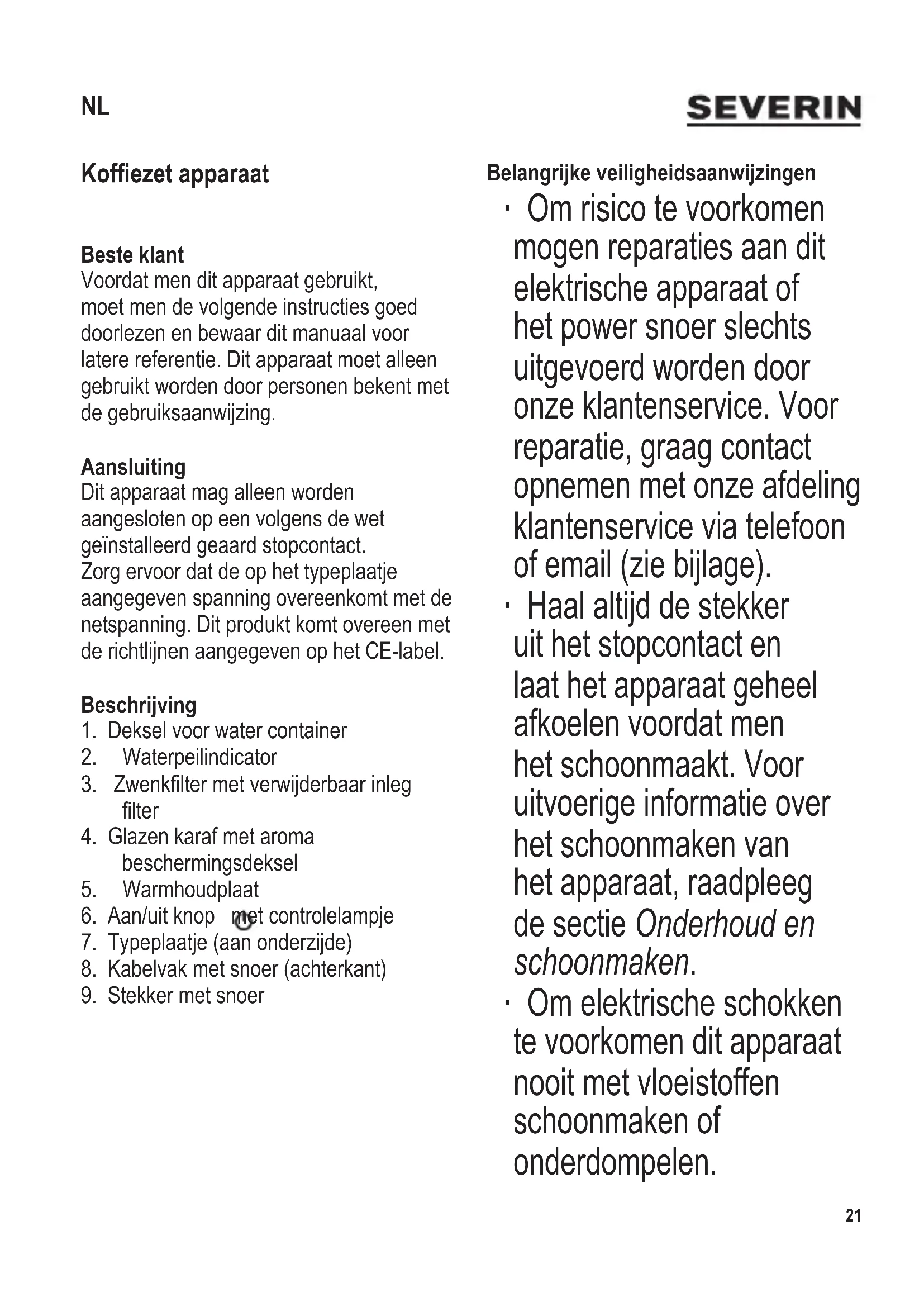Belangrijke veiligheidsaanwijzingen ∙ Om risico te voorkomen mogen reparaties aan dit elektrische apparaat of het power snoer slechts uitgevoerd worden door onze klantenservice. Voor reparatie, graag contact opnemen met onze afdeling klantenservice via telefoon of email (zie bijlage). ∙ Haal altijd de stekker uit het stopcontact en laat het apparaat geheel afkoelen voordat men het schoonmaakt. Voor uitvoerige informatie over het schoonmaken van het apparaat, raadpleeg de sectie Onderhoud en schoonmaken. ∙ Om elektrische schokken te voorkomen dit apparaat nooit met vloeistoffen schoonmaken of onderdompelen. NL22 104 x 142 mm ∙ Waarschuwing: Verkeerd gebruik van dit apparaat kan persoonlijk letsel veroorzaken. ∙ Pas op: De warmhoudplaat warmt op tijdens gebruik en zal daarna voor enige tijd warm blijven. ∙ Dit apparaat is bestemd voor huishoudelijk of gelijkwaardig gebruik, zoals - in bedrijfskeukens, in winkels, kantoren of andere bedrijfsruimtes, - in agrarische instellingen, - door klanten in hotels, motels enz. en gelijkwaardige accommodaties, - in bed and breakfast gasthuizen. ∙ Dit apparaat mag gebruikt worden door kinderen (tenminste 8 jaar oud) en door personen met verminderde fysische, zintuiglijke of mentale bekwaamheden, of gebrek van ervaring en kennis, wanneer deze onder begeleiding zijn of instructies ontvangen hebben over het gebruik van dit apparaat en volledig de gevaren en veiligheidsvoorschriften begrijpen. ∙ Kinderen mogen niet met het apparaat spelen. ∙ Kinderen mogen in geen geval dit apparaat schoonmaken of onderhoudswerkzaamheden uitvoeren behalve wanneer onder toezicht van een volwassene en ze tenminste 8 jaar oud zijn. ∙ Het apparaat en het snoer moeten altijd goed weggehouden worden van kinderen jonger dan 8 jaar.104 x 142 mm