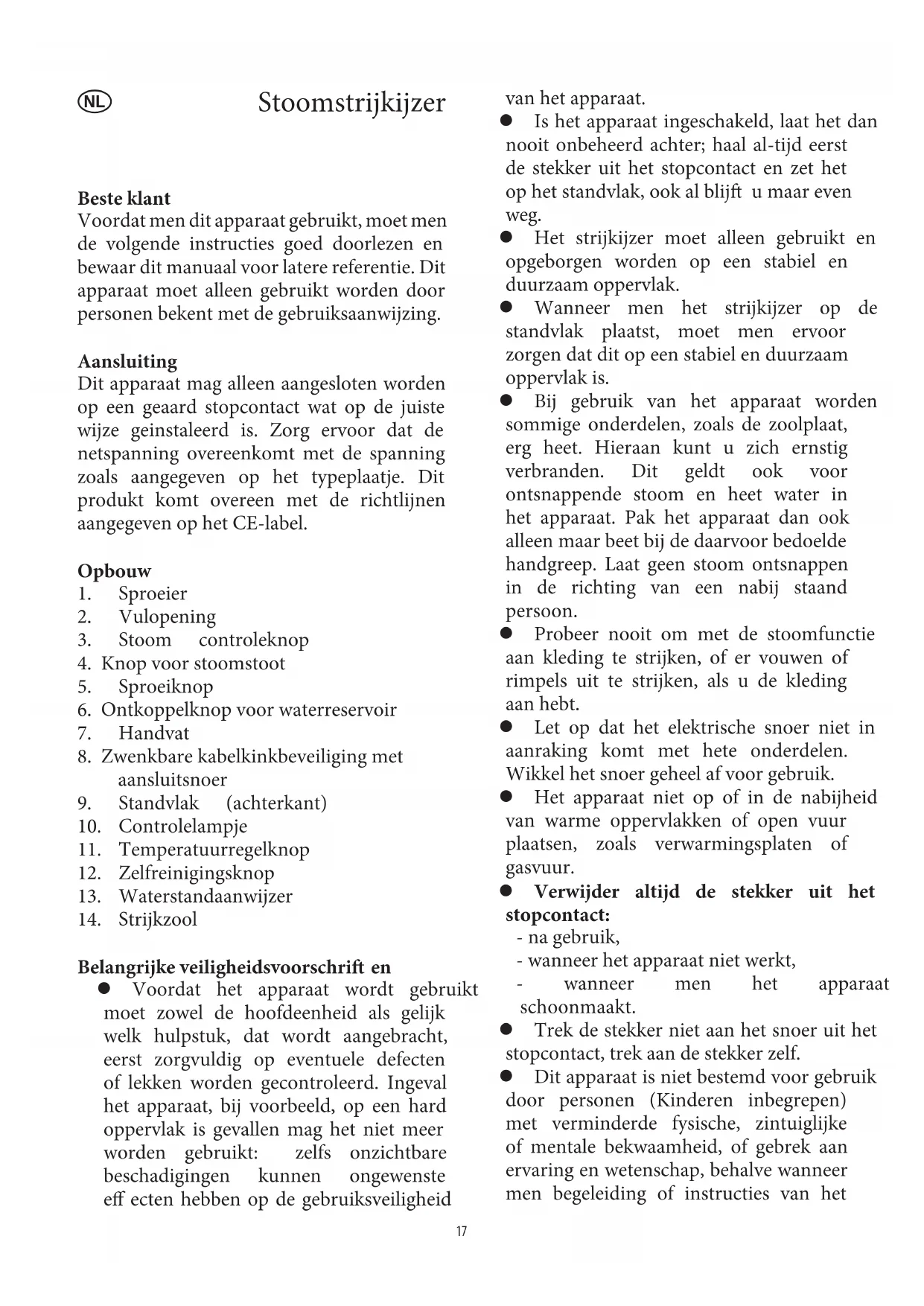 Belangrijke veiligheidsvoorschri en Voordat het apparaat wordt gebruikt moet zowel de hoofdeenheid als gelijk welk hulpstuk, dat wordt aangebracht, eerst zorgvuldig op eventuele defecten of lekken worden gecontroleerd. Ingeval het apparaat, bij voorbeeld, op een hard oppervlak is gevallen mag het niet meer worden gebruikt: zelfs onzichtbare beschadigingen kunnen ongewenste e ecten hebben op de gebruiksveiligheid van het apparaat. Is het apparaat ingeschakeld, laat het dan nooit onbeheerd achter; haal al-tijd eerst de stekker uit het stopcontact en zet het op het standvlak, ook al blij u maar even weg. Het strijkijzer moet alleen gebruikt en opgeborgen worden op een stabiel en duurzaam oppervlak. Wanneer men het strijkijzer op de standvlak plaatst, moet men ervoor zorgen dat dit op een stabiel en duurzaam oppervlak is. Bij gebruik van het apparaat worden sommige onderdelen, zoals de zoolplaat, erg heet. Hieraan kunt u zich ernstig verbranden. Dit geldt ook voor ontsnappende stoom en heet water in het apparaat. Pak het apparaat dan ook alleen maar beet bij de daarvoor bedoelde handgreep. Laat geen stoom ontsnappen in de richting van een nabij staand persoon. Probeer nooit om met de stoomfunctie aan kleding te strijken, of er vouwen of rimpels uit te strijken, als u de kleding aan hebt. Let op dat het elektrische snoer niet in aanraking komt met hete onderdelen. Wikkel het snoer geheel af voor gebruik. Het apparaat niet op of in de nabijheid van warme oppervlakken of open vuur plaatsen, zoals verwarmingsplaten of gasvuur. Verwijder altijd de stekker uit het stopcontact: - na gebruik, - wanneer het apparaat niet werkt, - wanneer men het apparaat schoonmaakt. Trek de stekker niet aan het snoer uit het stopcontact, trek aan de stekker zelf. Dit apparaat is niet bestemd voor gebruik door personen (Kinderen inbegrepen) met verminderde fysische, zintuiglijke of mentale bekwaamheid, of gebrek aan ervaring en wetenschap, behalve wanneer men begeleiding of instructies van het