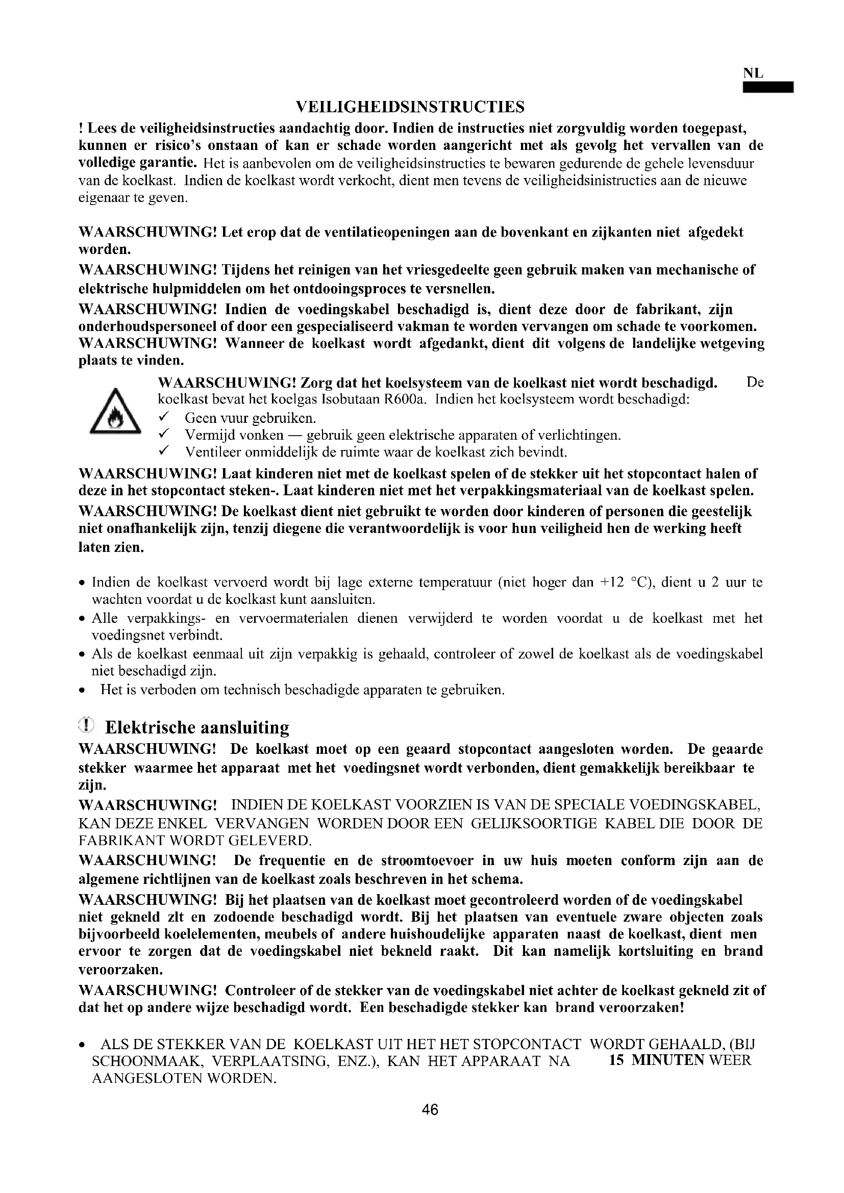45VEILIGHEIDSINSTRUCTIES ! Lees de veiligheidsinstructies aandachtig door. Indien de instructies niet zorgvuldig worden toegepast, kunnen er risico’s onstaan of kan er schade worden aangericht met als gevolg het vervallen van de volledige garantie. Het is aanbevolen om de veiligheidsinstructies te bewaren gedurende de gehele levensduur van de koelkast. Indien de koelkast wordt verkocht, dient men tevens de veiligheidsinistructies aan de nieuwe eigenaar te geven. WAARSCHUWING! Let erop dat de ventilatieopeningen aan de bovenkant en zijkanten niet afgedekt worden. WAARSCHUWING! Tijdens het reinigen van het vriesgedeelte geen gebruik maken van mechanische of elektrische hulpmiddelen om het ontdooingsproces te versnellen. WAARSCHUWING! Indien de voedingskabel beschadigd is, dient deze door de fabrikant, zijn onderhoudspersoneel of door een gespecialiseerd vakman te worden vervangen om schade te voorkomen. WAARSCHUWING! Wanneer de koelkast wordt afgedankt, dient dit volgens de landelijke wetgeving plaats te vinden. WAARSCHUWING! Zorg dat het koelsysteem van de koelkast niet wordt beschadigd.