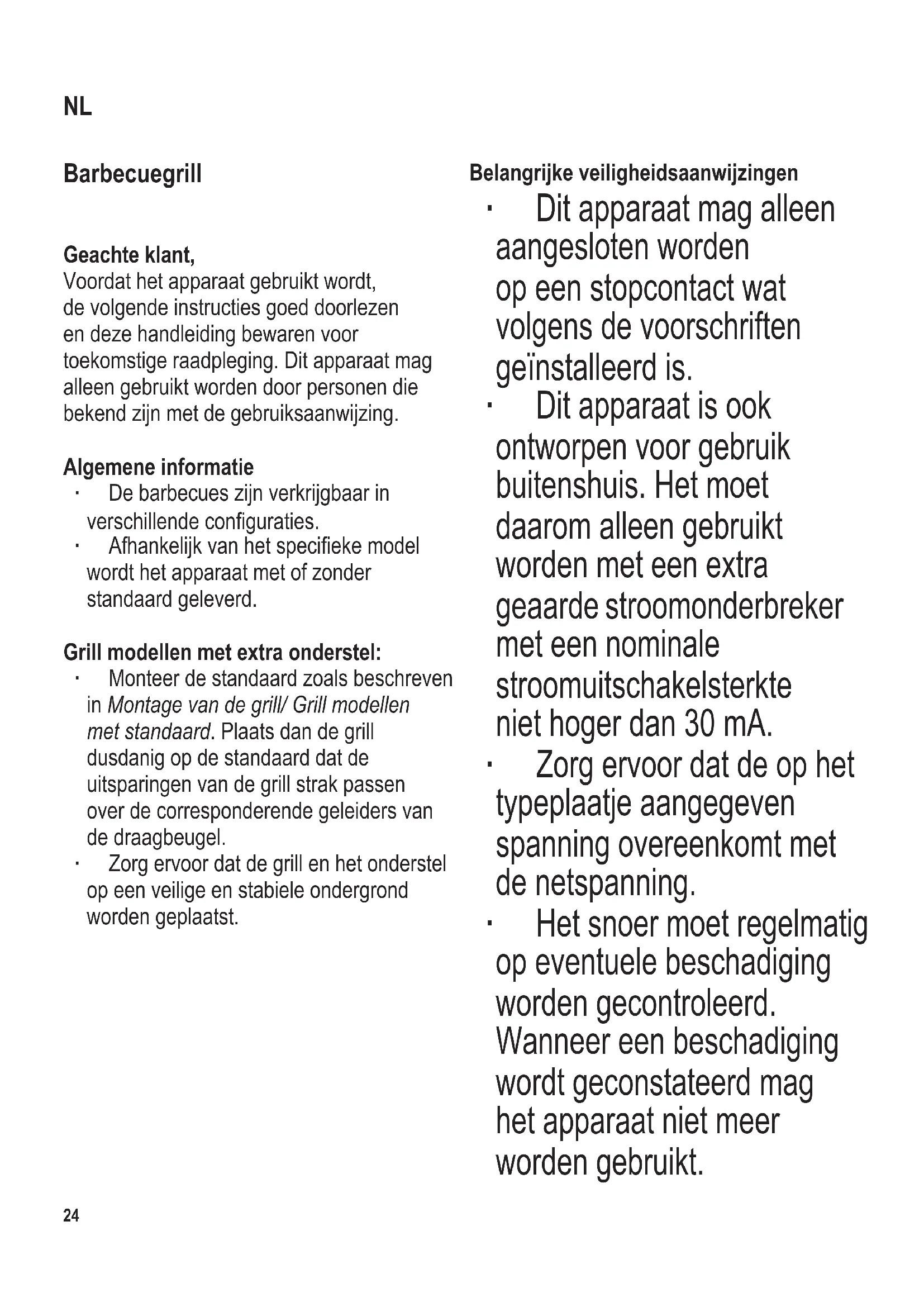 ∙ Waarschuwing: Onder geen enkele omstandigheid mag men de grillplaat volledig met aluminium folie, barbecueschotels en andere items bedekken, dit kan een opbouw van hitte tot gevolg hebben hetgeen de grill ernstig kan beschadigen. ∙ Voordat het apparaat wordt gebruikt moet zowel de hoofdeenheid als gelijk welk hulpstuk, dat wordt aangebracht, eerst zorgvuldig op eventuele defecten worden gecontroleerd. Ingeval het apparaat, bijvoorbeeld, op een hard oppervlak is gevallen mag het niet meer worden gebruikt: zelfs onzichtbare beschadiging kan ongewenste effecten hebben op de gebruiksveiligheid van het apparaat. In dit geval kunt u contact opnemen met onze klantenservice. ∙ Tijdens gebruik moet de grill altijd op een hittebestendige ondergrond geplaatst zijn die tevens bestand is tegen spetteren en vlekken. Wanneer men voedsel grilt met een hoog vetgehalte kan spetteren niet altijd voorkomen worden. ∙ Grill modellen met standaard: Zorg ervoor dat de grill en het onderstel op een veilige en stabiele ondergrond worden geplaatst. ∙ Geen windscherm gebruiken als het apparaat binnenshuis wordt gebruikt. ∙ Het snoer moet zo worden uitgelegd dat het onwaarschijnlijk is dat iemand erover zal struikelen. ∙ De grill niet bij een muur of in een hoek plaatsen, en zorg ervoor dat in de buurt ervan geen ontvlambare materialen worden opgeslagen. ∙ Voordat de grill gebruikt wordt, altijd controleren of de vet vetopvangbak correct in de barbecue grill is geplaatst. ∙ De barbecuegrill moet tijdens het gebruik steeds onder toezicht blijven. ∙ Zorg dat het snoer niet in aanraking komt met hete delen van het apparaat. ∙ Haal de stekker uit het stopcontact - na ieder gebruik, - in geval van storing, - voor het schoonmaken. ∙ Trek de stekker niet aan het snoer uit het stopcontact, trek aan de stekker zelf. ∙ Het gebruiken van een verlengkabel veroorzaakt verlies aan vermogen, mogelijk gecombineerd met een subsequente warmte-opbouw in de kabel. Het is daarom noodzakelijk de kabel geheel te ontwikkelen als een kabelhaspel wordt gebruikt. Een kabelhaspel mag buitenshuis gebruikt worden in een beschutte omgeving maar moet wel van het type zijn wat goedgekeurd is voor deze doeleinden. ∙ Voorzichtig: De grill tijdens het gebruik niet verplaatsen. Voordat de grill wordt gedragen, getransporteerd of opgeborgen moet er goed op worden gelet dat het voldoende is afgekoeld. ∙ Let erop dat de grill niet buitenshuis wordt opgeborgen, of op enig andere plaats waar het bloot kan staan aan extreme temperaturen of hoge vochtigheid. ∙ De fabrikant heeft geen verantwoordelijkheid wanneer dit apparaat verkeerd gebruikt word of wanneer de veiligheidsinstructies niet gevolgd worden.28 104 x 142 mm ∙ Dit product komt overeen met de richtlijnen aangegeven op het CE-label. Overzicht en inbegrepen onderdelen