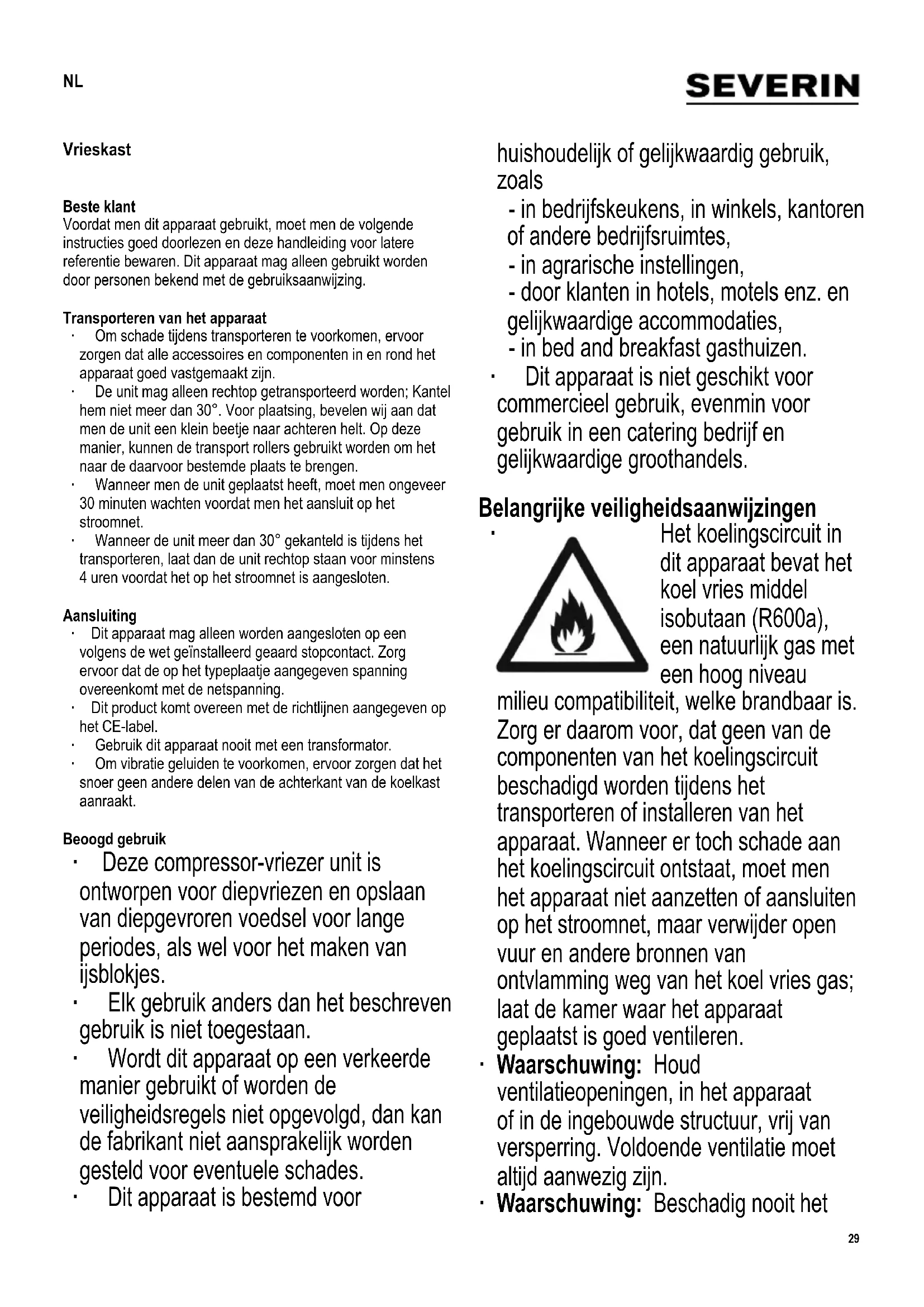 - Conformément à la directive EU 1062/2010 Annexe III ** La consommation réelle dépend de l’usage quotidien et l’emplacement de l’appareil Informations à fournir au Service Clientèle Si une réparation de l’appareil s’avère nécessaire, veuillez contacter notre Service Clientèle, en leur fournissant un résumé détaillé du défaut et le numéro d’article KS ... fi gurant sur la plaque signalétique de l’appareil (voir schéma). Ces informations nous permettront de traiter votre demande de manière effi cace. Veuillez contacter notre Service Clientèle en cas de problème ou de mal fonctionnement de l’appareil. Vous trouverez l’adresse de ce service dans l’appendice de ce manuel.29 Vrieskast Beste klant Voordat men dit apparaat gebruikt, moet men de volgende instructies goed doorlezen en deze handleiding voor latere referentie bewaren. Dit apparaat mag alleen gebruikt worden door personen bekend met de gebruiksaanwijzing. Transporteren van het apparaat ∙ Om schade tijdens transporteren te voorkomen, ervoor zorgen dat alle accessoires en componenten in en rond het apparaat goed vastgemaakt zijn. ∙ De unit mag alleen rechtop getransporteerd worden; Kantel hem niet meer dan 30°. Voor plaatsing, bevelen wij aan dat men de unit een klein beetje naar achteren helt. Op deze manier, kunnen de transport rollers gebruikt worden om het naar de daarvoor bestemde plaats te brengen. ∙ Wanneer men de unit geplaatst heeft, moet men ongeveer 30 minuten wachten voordat men het aansluit op het stroomnet. ∙ Wanneer de unit meer dan 30° gekanteld is tijdens het transporteren, laat dan de unit rechtop staan voor minstens 4 uren voordat het op het stroomnet is aangesloten. Aansluiting ∙ Dit apparaat mag alleen worden aangesloten op een volgens de wet geïnstalleerd geaard stopcontact. Zorg ervoor dat de op het typeplaatje aangegeven spanning overeenkomt met de netspanning. ∙ Dit product komt overeen met de richtlijnen aangegeven op het CE-label. ∙ Gebruik dit apparaat nooit met een transformator. ∙ Om vibratie geluiden te voorkomen, ervoor zorgen dat het snoer geen andere delen van de achterkant van de koelkast aanraakt. Beoogd gebruik ∙ Deze compressor-vriezer unit is ontworpen voor diepvriezen en opslaan van diepgevroren voedsel voor lange periodes, als wel voor het maken van ijsblokjes. ∙ Elk gebruik anders dan het beschreven gebruik is niet toegestaan. ∙ Wordt dit apparaat op een verkeerde manier gebruikt of worden de veiligheidsregels niet opgevolgd, dan kan de fabrikant niet aansprakelijk worden gesteld voor eventuele schades. ∙ Dit apparaat is bestemd voor huishoudelijk of gelijkwaardig gebruik, zoals - in bedrijfskeukens, in winkels, kantoren of andere bedrijfsruimtes, - in agrarische instellingen, - door klanten in hotels, motels enz. en gelijkwaardige accommodaties, - in bed and breakfast gasthuizen. ∙ Dit apparaat is niet geschikt voor commercieel gebruik, evenmin voor gebruik in een catering bedrijf en gelijkwaardige groothandels. Belangrijke veiligheidsaanwijzingen
