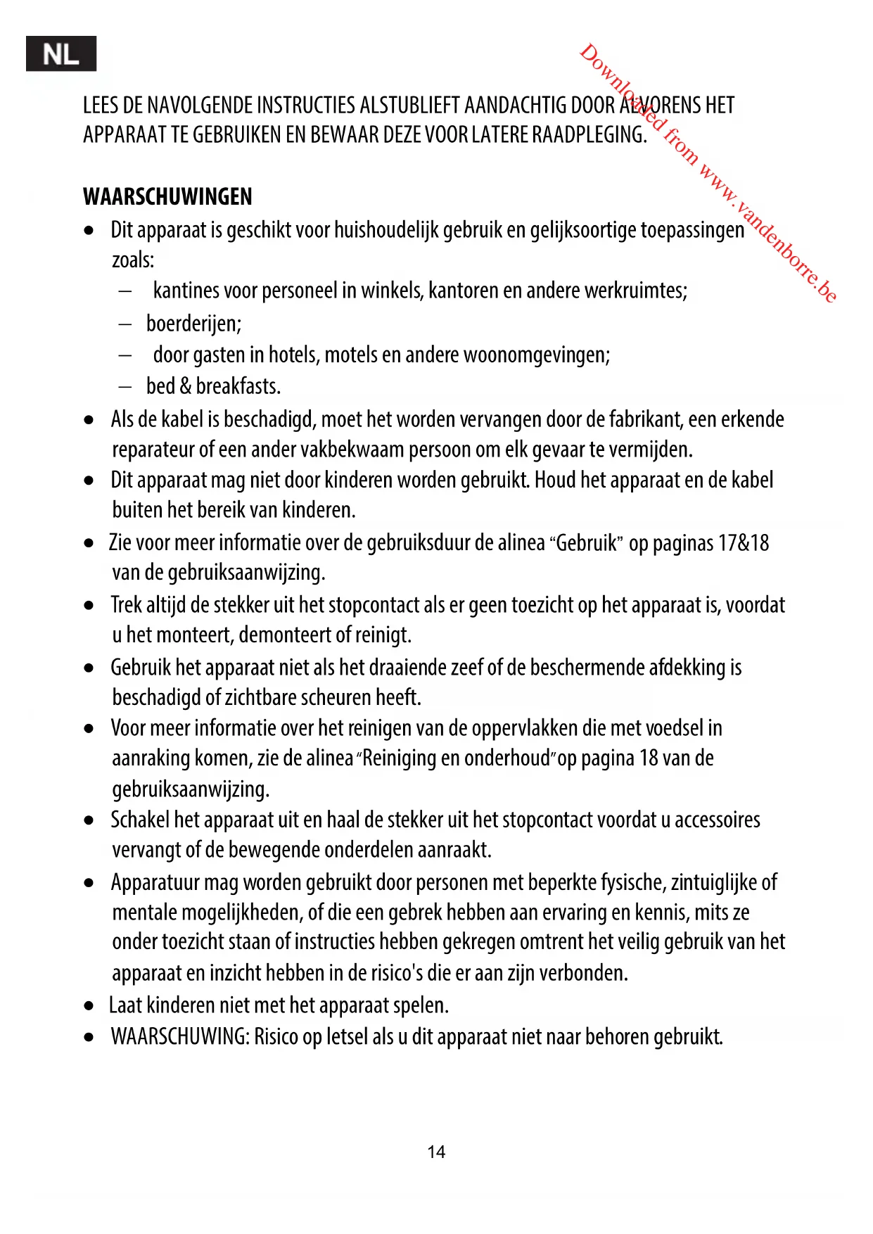 Downloaded from www.vandenborre.be14 LEES DE NAVOLGENDE INSTRUCTIES ALSTUBLIEFT AANDACHTIG DOOR ALVORENS HET APPARAAT TE GEBRUIKEN EN BEWAAR DEZE VOOR LATERE RAADPLEGING. WAARSCHUWINGEN Dit apparaat is geschikt voor huishoudelijk gebruik en gelijksoortige toepassingen zoals: kantines voor personeel in winkels, kantoren en andere werkruimtes; boerderijen; door gasten in hotels, motels en andere woonomgevingen; bed & breakfasts. Als de kabel is beschadigd, moet het worden vervangen door de fabrikant, een erkende reparateur of een ander vakbekwaam persoon om elk gevaar te vermijden. Dit apparaat mag niet door kinderen worden gebruikt. Houd het apparaat en de kabel buiten het bereik van kinderen. Zie voor meer informatie over de gebruiksduur de alinea “Gebruik” op paginas 17&18 van de gebruiksaanwijzing. Trek altijd de stekker uit het stopcontact als er geen toezicht op het apparaat is, voordat u het monteert, demonteert of reinigt. Gebruik het apparaat niet als het draaiende zeef of de beschermende afdekking is beschadigd of zichtbare scheuren heeft. Voor meer informatie over het reinigen van de oppervlakken die met voedsel in aanraking komen, zie de alinea “Reiniging en onderhoud” op pagina 18 van de gebruiksaanwijzing. Schakel het apparaat uit en haal de stekker uit het stopcontact voordat u accessoires vervangt of de bewegende onderdelen aanraakt. Apparatuur mag worden gebruikt door personen met beperkte fysische, zintuiglijke of mentale mogelijkheden, of die een gebrek hebben aan ervaring en kennis, mits ze onder toezicht staan of instructies hebben gekregen omtrent het veilig gebruik van het apparaat en inzicht hebben in de risico's die er aan zijn verbonden. Laat kinderen niet met het apparaat spelen. WAARSCHUWING: Risico op letsel als u dit apparaat niet naar behoren gebruikt. Downloaded from www.vandenborre.beBELANGRIJKE VEILIGHEIDSINSTRUCTIES Gebruik het apparaat niet buitenshuis. Bedien het apparaat niet met natte handen of als u in natte werkomgeving bent. Steek de stekker niet met kracht in het stopcontact. Zorg ervoor dat de stekker uit de buurt van welke warmtebron dan ook is en dat hij op geen enkele manier is gebogen of gedraaid. Laat de kabel niet over de rand van een tafel of aanrecht hangen en laat hem niet in contact komen met hete oppervlakken. Demonteer de basis niet. Houd de basis te allen tijde droog. Steek geen vreemde voorwerpen in het apparaat terwijl het apparaat in gebruik is. Gebruik het apparaat niet als het beschadigd is. Zet het apparaat uit en haal de stekker uit het stopcontact wanneer u het apparaat niet gebruikt en alvorens dit te monteren, te demonteren of te reinigen. Vermijd contact met de bewegende onderdelen. Het gebruik van opzetstukken die niet door de fabrikant worden verkocht of aanbevolen, kan brand, een elektrische schok of letsel veroorzaken. Gebruik het apparaat altijd op een veilige, droge en vlakke ondergrond. Zorg ervoor dat de aan-/uitschakelaar op staat voordat u de stekker van het apparaat in het stopcontact steekt. Gebruik alleen de meegeleverde stopper om het voedsel voorzichtig in de aanvoerbuis te drukken. Plaats geen handen of vingers in de slow juicer terwijl deze in gebruik is. Zorg ervoor dat alle onderdelen stevig vergrendeld zijn als het apparaat in gebruik is. Plaats het apparaat niet op of in de buurt van een heet oppervlak. Laat het apparaat nooit onbeheerd achter als het in gebruik is.