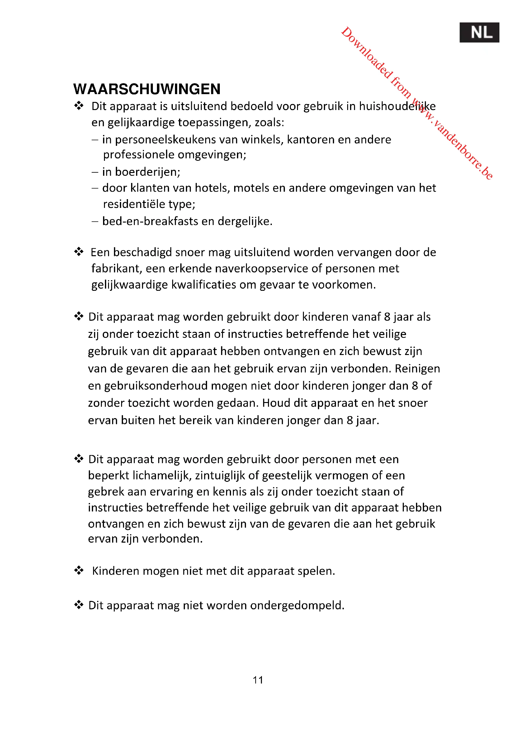 utilisez en aucun cas des produits de nettoyage chimiques ou abrasifs. Downloaded from www.vandenborre.beWAARSCHUWINGEN Dit apparaat is uitsluitend bedoeld voor gebruik in huishoudelijke en gelijkaardige toepassingen, zoals: in personeelskeukens van winkels, kantoren en andere professionele omgevingen; in boerderijen; door klanten van hotels, motels en andere omgevingen van het residentiële type; bed-en-breakfasts en dergelijke. Een beschadigd snoer mag uitsluitend worden vervangen door de fabrikant, een erkende naverkoopservice of personen met gelijkwaardige kwalificaties om gevaar te voorkomen. Dit apparaat mag worden gebruikt door kinderen vanaf 8 jaar als zij onder toezicht staan of instructies betreffende het veilige gebruik van dit apparaat hebben ontvangen en zich bewust zijn van de gevaren die aan het gebruik ervan zijn verbonden. Reinigen en gebruiksonderhoud mogen niet door kinderen jonger dan 8 of zonder toezicht worden gedaan. Houd dit apparaat en het snoer ervan buiten het bereik van kinderen jonger dan 8 jaar. Dit apparaat mag worden gebruikt door personen met een beperkt lichamelijk, zintuiglijk of geestelijk vermogen of een gebrek aan ervaring en kennis als zij onder toezicht staan of instructies betreffende het veilige gebruik van dit apparaat hebben ontvangen en zich bewust zijn van de gevaren die aan het gebruik ervan zijn verbonden. Kinderen mogen niet met dit apparaat spelen. Dit apparaat mag niet worden ondergedompeld.