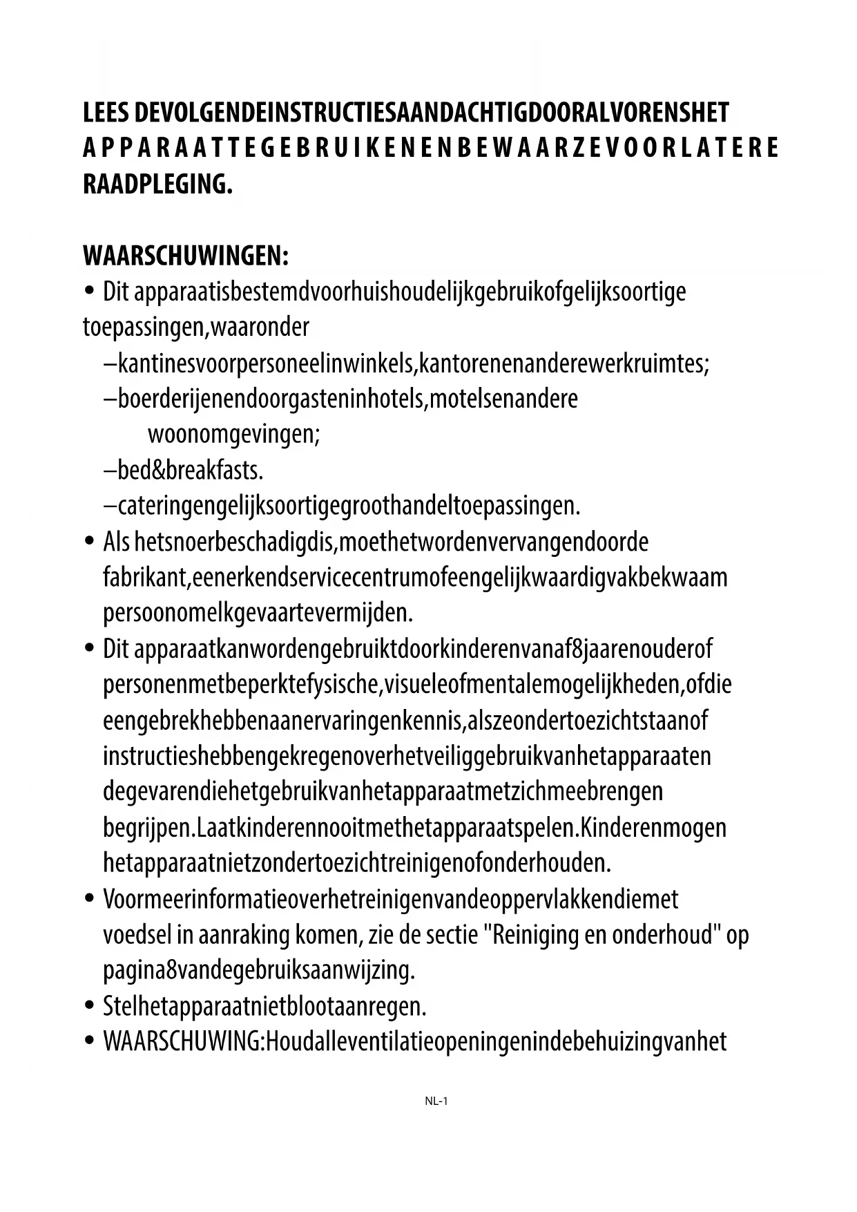 Dit apparaat kan worden gebruikt door kinderen vanaf 8 jaar en ouder of personen met beperkte fysische, visuele of mentale mogelijkheden, of die een gebrek h ebben aan ervaring en kennis, als ze onder toezicht staan of instructies hebben gekregen over het veilig gebruik van het apparaat en de gevaren die het gebruik van het apparaat met zich meebrengen begrijpen. Laat kinderen nooit met het apparaat spelen. Kinderen mogen het apparaat niet zonder toezicht reinigen of onderhouden.