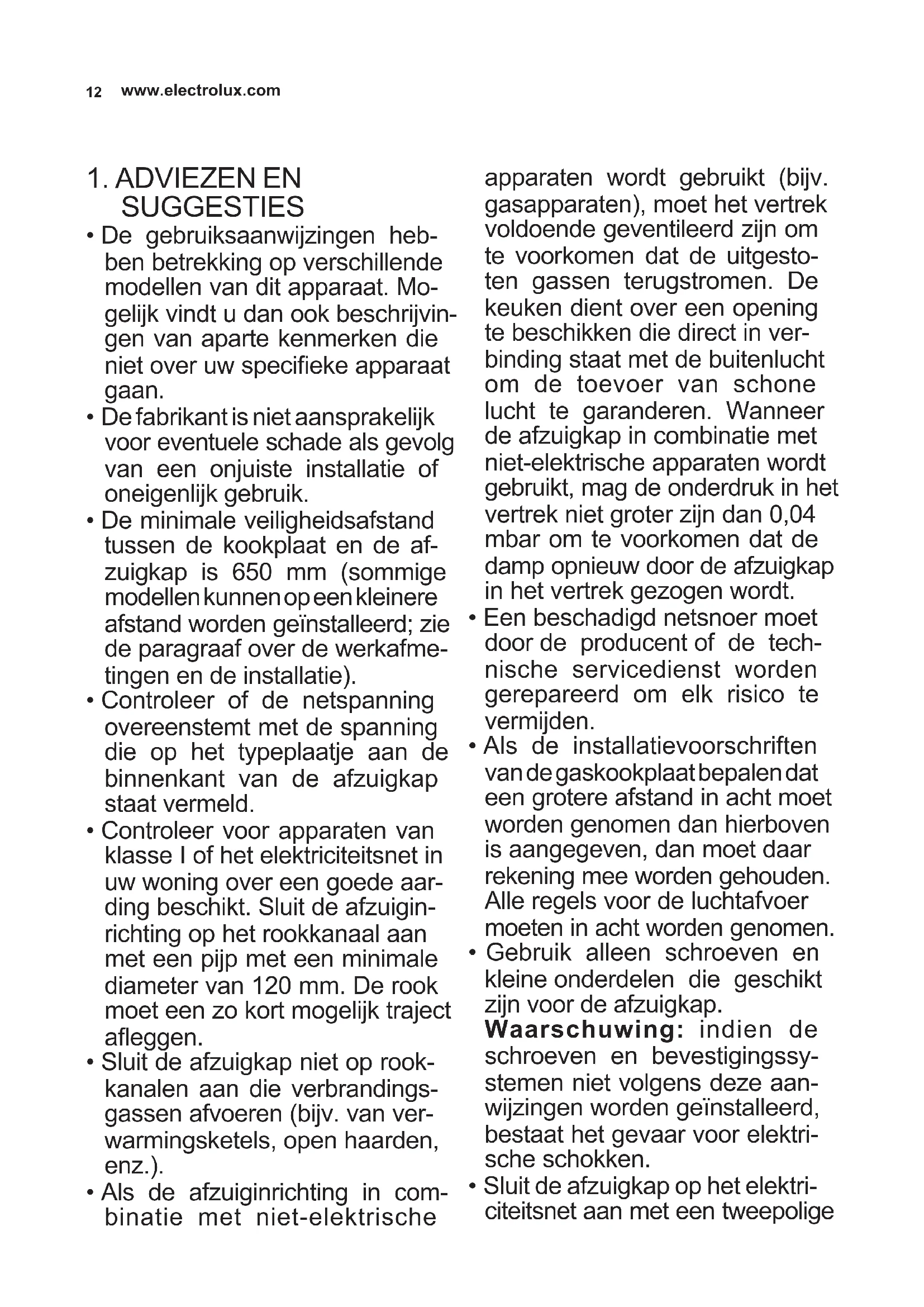 - Controleer voor apparaten van klasse I of het elektriciteitsnet in uw woning over een goede aar- ding beschikt. Sluit de afzuigin- richting op het rookkanaal aan met een pijp met een minimale diameter van 120 mm. De rook moet een zo kort mogelijk traject aeggen.
