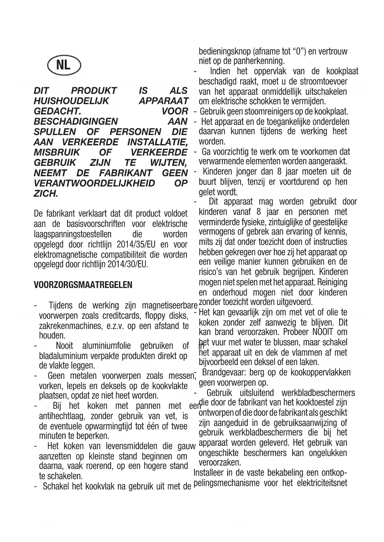 VERANTWOORDELIJKHEID OP ZICH. De fabrikant verklaart dat dit product voldoet aan de basisvoorschriften voor elektrische laagspanningstoestellen die worden opgelegd door richtlijn 2014/35/EU en voor elektromagnetische compatibiliteit die worden opgelegd door richtlijn 2014/30/EU. VOORZORGSMAATREGELEN - Tijdens de werking zijn magnetiseerbare voorwerpen zoals creditcards, floppy disks, zakrekenmachines, e.z.v. op een afstand te houden. - Nooit aluminiumfolie gebruiken of in bladaluminium verpakte produkten direkt op de vlakte leggen. - Geen metalen voorwerpen zoals messen, vorken, lepels en deksels op de kookvlakte plaatsen, opdat ze niet heet worden. - Bij het koken met pannen met een antihechtlaag, zonder gebruik van vet, is de eventuele opwarmingtijd tot één of twee minuten te beperken. - Het koken van levensmiddelen die gauw aanzetten op kleinste stand beginnen om daarna, vaak roerend, op een hogere stand te schakelen. - Schakel het kookvlak na gebruik uit met de bedieningsknop (afname tot “0”) en vertrouw niet op de panherkenning. - Indien het oppervlak van de kookplaat beschadigd raakt, moet u de stroomtoevoer van het apparaat onmiddellijk uitschakelen om elektrische schokken te vermijden. - Gebruik geen stoomreinigers op de kookplaat. - Het apparaat en de toegankelijke onderdelen daarvan kunnen tijdens de werking heet worden. - Ga voorzichtig te werk om te voorkomen dat verwarmende elementen worden aangeraakt. - Kinderen jonger dan 8 jaar moeten uit de buurt blijven, tenzij er voortdurend op hen gelet wordt. - Dit apparaat mag worden gebruikt door kinderen vanaf 8 jaar en personen met verminderde fysieke, zintuiglijke of geestelijke vermogens of gebrek aan ervaring of kennis, mits zij dat onder toezicht doen of instructies hebben gekregen over hoe zij het apparaat op een veilige manier kunnen gebruiken en de risico’s van het gebruik begrijpen. Kinderen mogen niet spelen met het apparaat. Reiniging en onderhoud mogen niet door kinderen zonder toezicht worden uitgevoerd. - Het kan gevaarlijk zijn om met vet of olie te koken zonder zelf aanwezig te blijven. Dit kan brand veroorzaken. Probeer NOOIT om het vuur met water te blussen, maar schakel het apparaat uit en dek de vlammen af met bijvoorbeeld een deksel of een laken. - Brandgevaar: berg op de kookoppervlakken geen voorwerpen op. - Gebruik uitsluitend werkbladbeschermers die door de fabrikant van het kooktoestel zijn ontworpen of die door de fabrikant als geschikt zijn aangeduid in de gebruiksaanwijzing of gebruik werkbladbeschermers die bij het apparaat worden geleverd. Het gebruik van ongeschikte beschermers kan ongelukken veroorzaken. Installeer in de vaste bekabeling een ontkop- pelingsmechanisme voor het elektriciteitsnet NLmet op alle polen een contactscheiding zodat tijdens categorie III overspanningen de voeding volledig losgekoppeld kan worden, in overeen- stemming met de bekabelingsnormen. De stekker of schakelaar moet gemakkelijk bereikbaar zijn als de apparatuur eenmaal geinstalleerd is. Dit apparaat kan niet met een aparte externe timer of afstandsbediening worden bediend. De fabrikant wijst iedere verantwoordelijkheid af in geval dat het bovenstaande en de gebrui- kelijke preventieve normen niet worden geres- pecteerd. Als de voedingskabel beschadigd is, moet deze door de fabrikant of door de technische dienst worden vervangen of in elk geval door een persoon met een soortgelijke kwalificatie, zodat elk gevaar wordt vermeden. WERKING (Afb. 1) Het berust op de elektromagnetische eigenschappen van een groot deel van de pannen. Het stroomcircuit regelt de werking van de smoorspoel (inductor) die een magnetisch veld opbouwt. De warmte wordt door de pan zelf aan de spijs overgedragen. Het koken voltrekt zich zoals beneden beschreven. - minimaal warmteverlies (hoger rendement); - het afnemen van de pan (het optillen is genoeg) leidt tot de automatische onderbreking van het systeem; - het elektronische systeem biedt uiterste flexibiliteit en nauwkeurigheid van instelling. (Afb. 1) 1 Pan 2 Inductiestroom 3 Magnetisch veld 4 Inductor 5 Stroomcircuit 6 Stroomtoevoer Instructies voor de gebruiker (Afb. 2) 1 Aan/uit 2 Slider 3 Power 4 Blokkering 5 Lampje Aan/uit 6 Lampje Slider 7 Lampje Blokkering 8 Kookzone 9 Lampje timer 10 Timer Installatie Alle handelingen met betrekking tot de installatie (elektrische verbinding) moeten worden uitgevoerd door gekwalificeerd personeel volgens de geldende normen. Zie voor de specifieke instructies het gedeelte gereserveerd voor de installateur. Functies virtuele schuif TC (touch control): Schuiven: met de sensortechnologie van de nieuwe virtuele schuif kunnen zowel de kookstanden (1 – 9) als de timer (1-99) worden ingesteld door met een vinger over het gebied in kwestie te schuiven. Naar rechts schuiven verhoogt de waarde, naar links schuiven verlaagt de waarde. Het is ook mogelijk de gewenste waarde direct te selecteren op de schuif. AAN/UIT touch-control Na aansluiting op het elektriciteitsnet duurt het een seconde totdat de TC bedrijfsklaar is. Na het resetten knipperen alle displays en LED’s gedurende een seconde. Daarna gaan alle displays en LED’s weer uit. De TC kan nu AAN worden gezet middels de AAN/UIT toets. De displays geven permanent “0“ weer. Eventuele visuele waarschuwingen voor hete kookzones [H] verschijnen afwisselend met [0] en de gelijktijdig weergegeven stip. De stippen op de displays van de kookplaat knipperen elke seconde (0,5 sec uit, 0,5 sec. aan). De elektronica blijven 20 seconden geactiveerd. Als er gedurende deze tijd geen kookstand of timer wordt geselecteerd dan gaat het apparaatautomatisch naar de uitstand. Er klinkt een geluidssignaal. De TC mag alleen worden ingeschakeld met de aan/uit-toets. Als op een andere toets wordt gedrukt (in plaats van of samen met de aan/uit-toets) dan werkt de TC niet. Staat de kinderbeveiliging aan bij het inschakelen dan geven alle kookzones “L” weer (voor LOCKED = vergrendeld). Visuele waarschuwingen voor hete