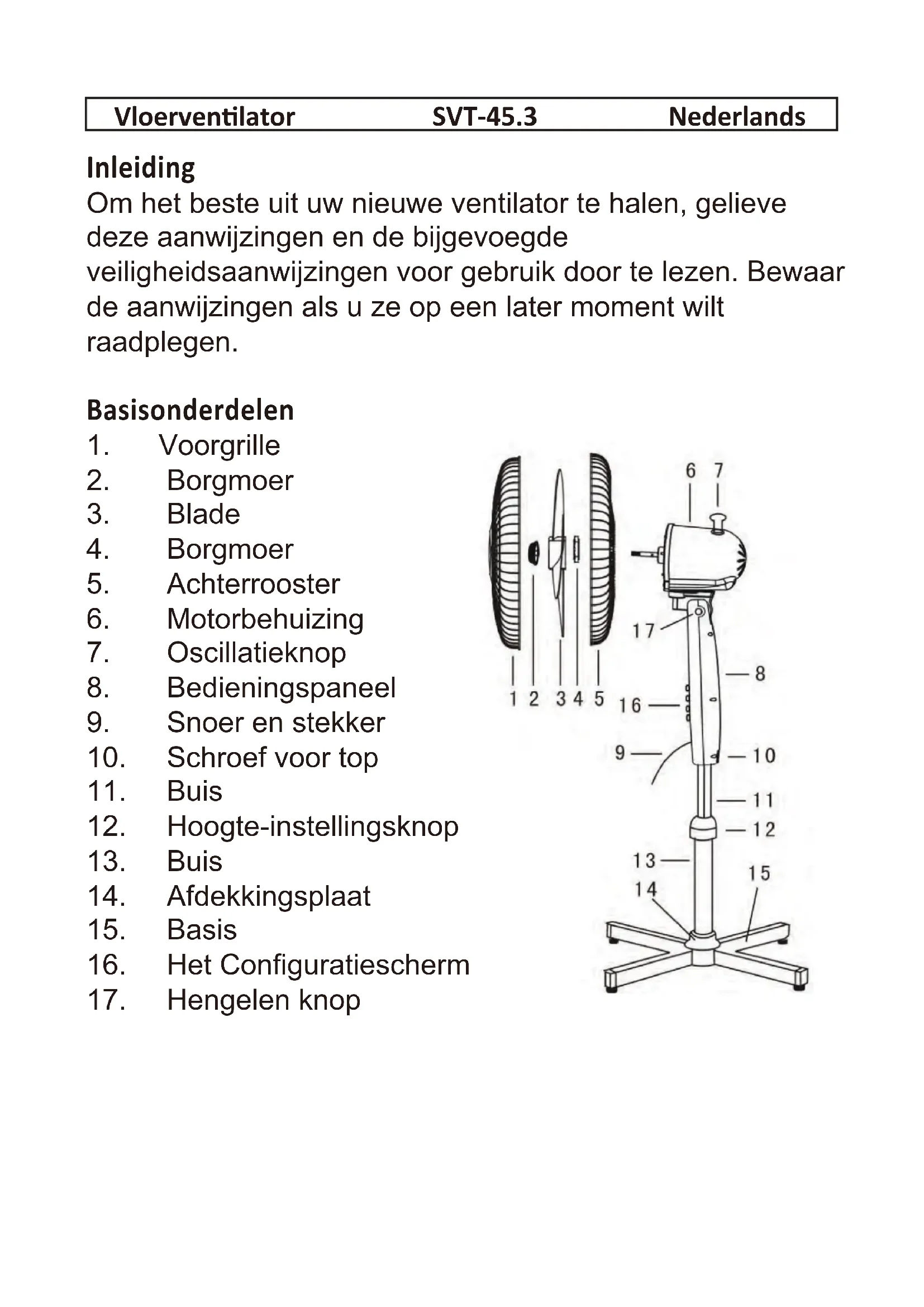 apparaat op, moet het op een veilige en droge plekworden bewaard. Het is ook belangrijk om de ventilatorkap tegen stof te beschermen. We adviseren u met klem om de ventilator op te bergen in originele doos. Montage - Monteer de 2 onderdelen van de basis (15) zo, dat ze een kruis vormen. ?_}{x%"! afdekkingsplaat naar beneden over de buis, zodat deze de verbinding tussen buis en basis afdekt. - Bevestig de motorbehuizing (6) op de telescoopas. - Bevestig het achterrooster (6) op de motorbehuizing met de borgmoer (4). - Bevestig het blad (3) en de borgmoer (2) op. - Haak het voorrooster (1) goed op het achterrooster (5) - Maak de hoogte-instellingsknop (12) losser, en zet de telescoopas op de gewenste hoogte. Maak de hoogte-instellingsknop weer vast. Gebruik