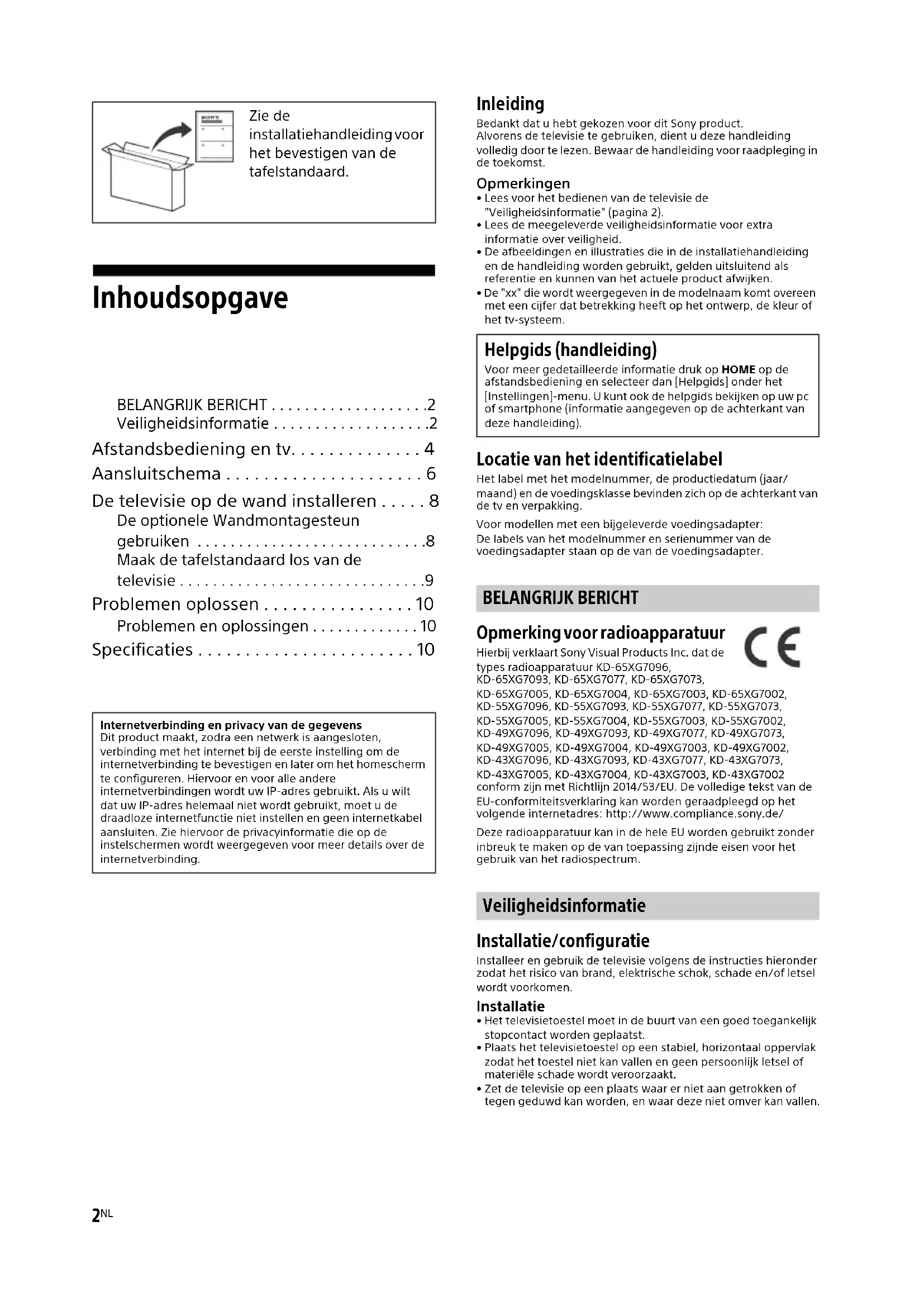 - Lees voor het bedienen van de televisie de "Veiligheidsinformatie" (pagina 2).• Lees de meegeleverde veiligheidsinformatie voor extra informatie over veiligheid.• De afbeeldingen en illustraties die in de installatiehandleiding en de handleiding worden gebruikt, gelden uitsluitend als referentie en kunnen van het actuele product afwijken.• De "xx" die wordt weergegeven in de modelnaam komt overeen met een cijfer dat betrekking heeft op het ontwerp, de kleur of het tv-systeem. Locatie van het identificatielabel Het label met het modelnummer, de productiedatum (jaar/maand) en de voedingsklasse bevinden zich op de achterkant van de tv en verpakking.Voor modellen met een bijgeleverde voedingsadapter:De labels van het modelnummer en serienummer van de voedingsadapter staan op de van de voedingsadapter. BELANGRIJK BERICHT Opmerking voor radioapparatuur Hierbij verklaart Sony Visual Products Inc. dat de types radioapparatuur KD-65XG7096, KD-65XG7093, KD-65XG7077, KD-65XG7073, KD-65XG7005, KD-65XG7004, KD-65XG7003, KD-65XG7002, KD-55XG7096, KD-55XG7093, KD-55XG7077, KD-55XG7073, KD-55XG7005, KD-55XG7004, KD-55XG7003, KD-55XG7002, KD-49XG7096, KD-49XG7093, KD-49XG7077, KD-49XG7073, KD-49XG7005, KD-49XG7004, KD-49XG7003, KD-49XG7002, KD-43XG7096, KD-43XG7093, KD-43XG7077, KD-43XG7073, KD-43XG7005, KD-43XG7004, KD-43XG7003, KD-43XG7002 conform zijn met Richtlijn 2014/53/EU. De volledige tekst van de EU-conformiteitsverklaring kan worden geraadpleegd op het volgende internetadres: http://www.compliance.sony.de/Deze radioapparatuur kan in de hele EU worden gebruikt zonder inbreuk te maken op de van toepassing zijnde eisen voor het gebruik van het radiospectrum. Veiligheidsinformatie Installatie/configuratie Installeer en gebruik de televisie volgens de instructies hieronder zodat het risico van brand, elektrische schok, schade en/of letsel wordt voorkomen. Installatie