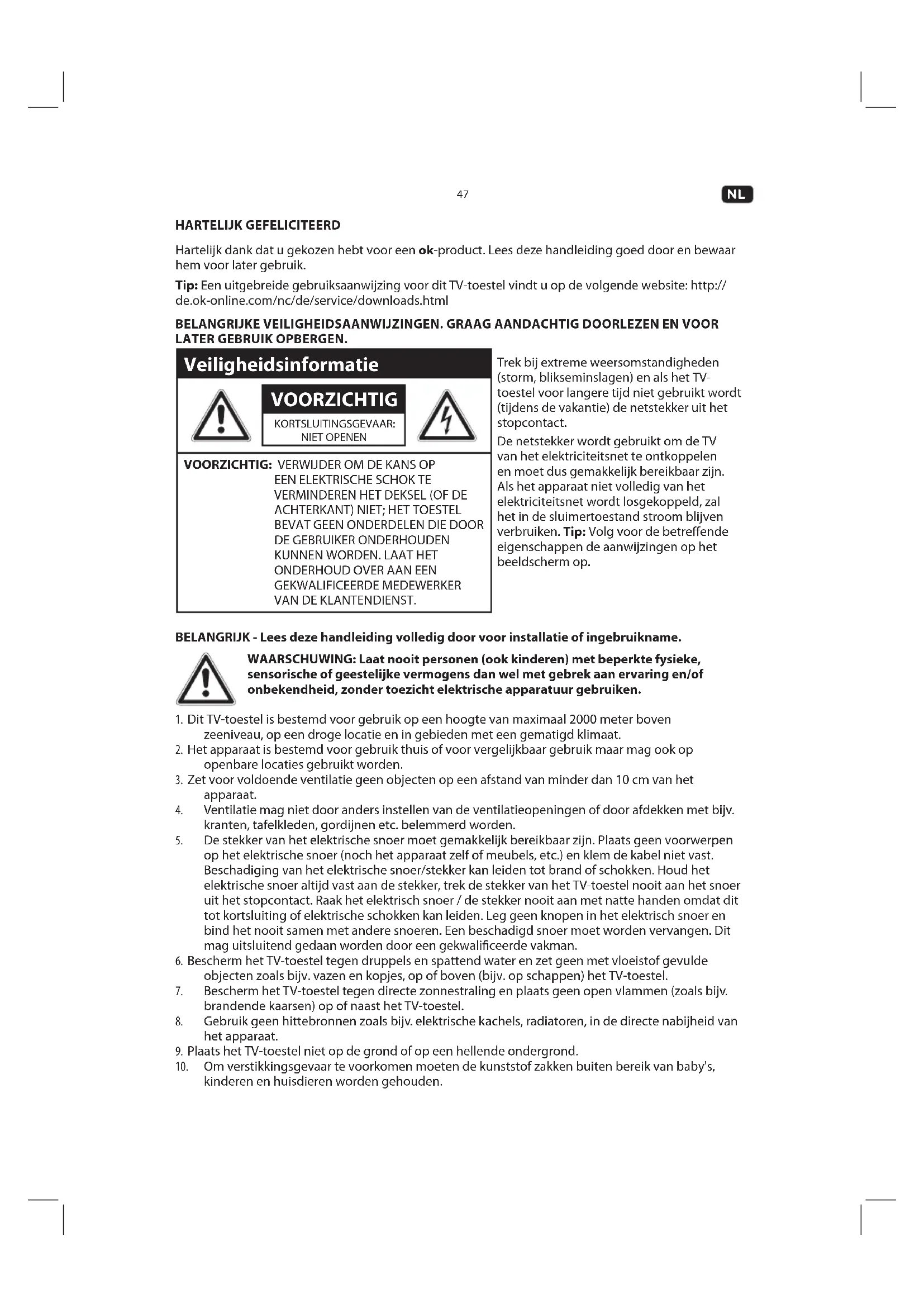 HARTELIJK GEFELICITEERD Hartelijk dank dat u gekozen hebt voor een ok-product. Lees deze handleiding goed door en bewaar hem voor later gebruik. Tip: Een uitgebreide gebruiksaanwijzing voor dit TV-toestel vindt u op de volgende website: http:// de.ok-online.com/nc/de/service/downloads.html BELANGRIJKE VEILIGHEIDSAANWIJZINGEN. GRAAG AANDACHTIG DOORLEZEN EN VOOR LATER GEBRUIK OPBERGEN. Veiligheidsinformatie Trek bij extreme weersomstandigheden (storm, blikseminslagen) en als het TV- toestel voor langere tijd niet gebruikt wordt (tijdens de vakantie) de netstekker uit het stopcontact. De netstekker wordt gebruikt om de TV van het elektriciteitsnet te ontkoppelen en moet dus gemakkelijk bereikbaar zijn. Als het apparaat niet volledig van het elektriciteitsnet wordt losgekoppeld, zal het in de sluimertoestand stroom blijven verbruiken. Tip: Volg voor de betreende eigenschappen de aanwijzingen op het beeldscherm op. VOORZICHTIG KORTSLUITINGSGEVAAR: NIET OPENEN