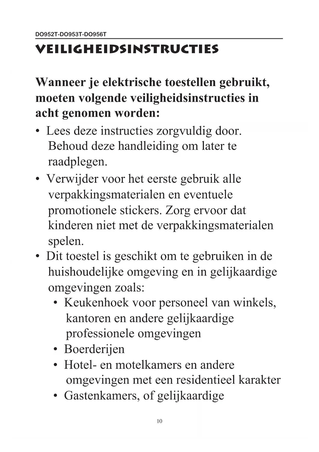 - Dit toestel mag gebruikt worden door kinderen vanaf 16 jaar en personen met een fysieke of sensoriële beperking of mensen met een beperkte mentale capaciteit of gebrek aan ervaring of kennis, op voorwaarde dat deze personen toezicht krijgen of instructies hebben gekregen over het gebruik van het toestel op een veilige manier en dat ze ook de gevaren kennen bij het gebruik van het toestel. Kinderen mogen niet met het toestel spelen. Het onderhoud en de reiniging van het toestel mag niet door kinderen gebeuren tenzij ze ouder zijn dan 8DO952T-DO953T-DO956T