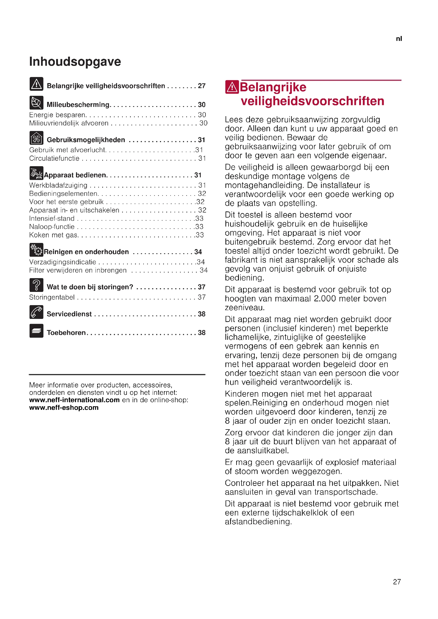 - _ Toebehoren Produktinfo Meer informatie over producten, accessoires, onderdelen en diensten vindt u op het internet: www.neff-international.com en in de online-shop: www.neff-eshop.com (Belangrijke veiligheidsvoorschriften Belangrijke veiligheidsvoorschriften Lees deze gebruiksaanwijzing zorgvuldig door. Alleen dan kunt u uw apparaat goed en veilig bedienen. Bewaar de gebruiksaanwijzing voor later gebruik of om door te geven aan een volgende eigenaar. De veiligheid is alleen gewaarborgd bij een deskundige montage volgens de montagehandleiding. De installateur is verantwoordelijk voor een goede werking op de plaats van opstelling. Dit toestel is alleen bestemd voor huishoudelijk gebruik en de huiselijke omgeving. Het apparaat is niet voor buitengebruik bestemd. Zorg ervoor dat het toestel altijd onder toezicht wordt gebruikt. De fabrikant is niet aansprakelijk voor schade als gevolg van onjuist gebruik of onjuiste bediening. Dit apparaat is bestemd voor gebruik tot op hoogten van maximaal 2.000 meter boven zeeniveau. Dit apparaat mag niet worden gebruikt door personen (inclusief kinderen) met beperkte lichamelijke, zintuiglijke of geestelijke vermogens of een gebrek aan kennis en ervaring, tenzij deze personen bij de omgang met het apparaat worden begeleid door en onder toezicht staan van een persoon die voor hun veiligheid verantwoordelijk is. Kinderen mogen niet met het apparaat spelen.Reiniging en onderhoud mogen niet worden uitgevoerd door kinderen, tenzij ze 8 jaar of ouder zijn en onder toezicht staan. Zorg ervoor dat kinderen die jonger zijn dan 8 jaar uit de buurt blijven van het apparaat of de aansluitkabel. Er mag geen gevaarlijk of explosief materiaal of stoom worden weggezogen. Controleer het apparaat na het uitpakken. Niet aansluiten in geval van transportschade. Dit apparaat is niet bestemd voor gebruik met een externe tijdschakelklok of een afstandbediening.nl Belangrijke veiligheidsvoorschriften p. 38