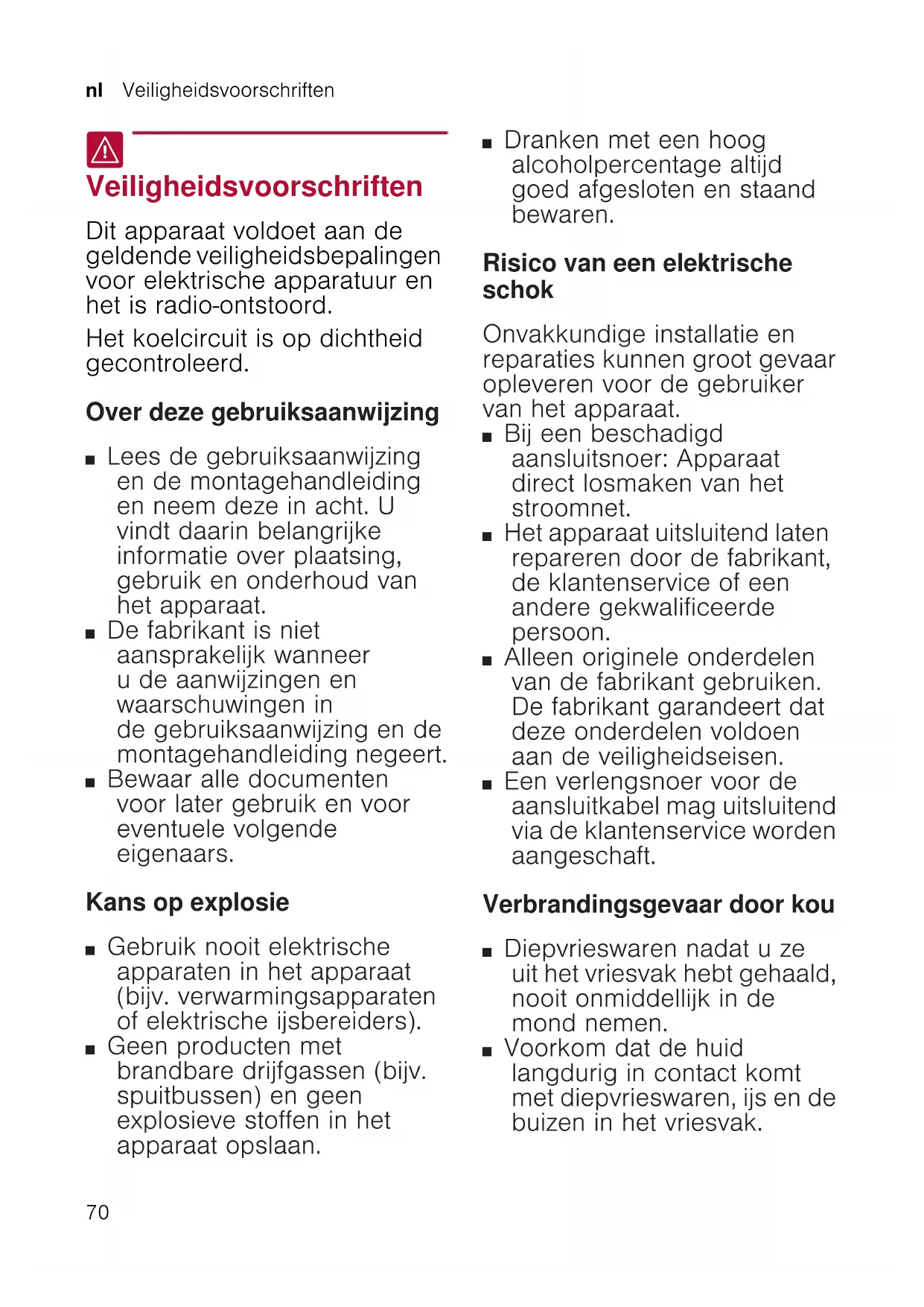 Veiligheidsvoorschriften Veiligheidsvoorschriften Dit apparaat voldoet aan de geldende veiligheidsbepalingen voor elektrische apparatuur en het is radio-ontstoord. Het koelcircuit is op dichtheid gecontroleerd. Over deze gebruiksaanwijzing ■ Lees de gebruiksaanwijzing en de montagehandleiding en neem deze in acht. U vindt daarin belangrijke informatie over plaatsing, gebruik en onderhoud van het apparaat. ■ De fabrikant is niet aansprakelijk wanneer u de aanwijzingen en waarschuwingen in de gebruiksaanwijzing en de montagehandleiding negeert. ■ Bewaar alle documenten voor later gebruik en voor eventuele volgende eigenaars. Kans op explosie ■ Gebruik nooit elektrische apparaten in het apparaat (bijv. verwarmingsapparaten of elektrische ijsbereiders). ■ Geen producten met brandbare drijfgassen (bijv. spuitbussen) en geen explosieve stoffen in het apparaat opslaan. ■ Dranken met een hoog alcoholpercentage altijd goed afgesloten en staand bewaren. Risico van een elektrische schok Onvakkundige installatie en reparaties kunnen groot gevaar opleveren voor de gebruiker van het apparaat. ■ Bij een beschadigd aansluitsnoer: Apparaat direct losmaken van het stroomnet. ■ Het apparaat uitsluitend laten repareren door de fabrikant, de klantenservice of een andere gekwalificeerde persoon. ■ Alleen originele onderdelen van de fabrikant gebruiken. De fabrikant garandeert dat deze onderdelen voldoen aan de veiligheidseisen. ■ Een verlengsnoer voor de aansluitkabel mag uitsluitend via de klantenservice worden aangeschaft. Verbrandingsgevaar door kou ■ Diepvrieswaren nadat u ze uit het vriesvak hebt gehaald, nooit onmiddellijk in de mond nemen. ■ Voorkom dat de huid langdurig in contact komt met diepvrieswaren, ijs en de buizen in het vriesvak.Veiligheidsvoorschriften nl