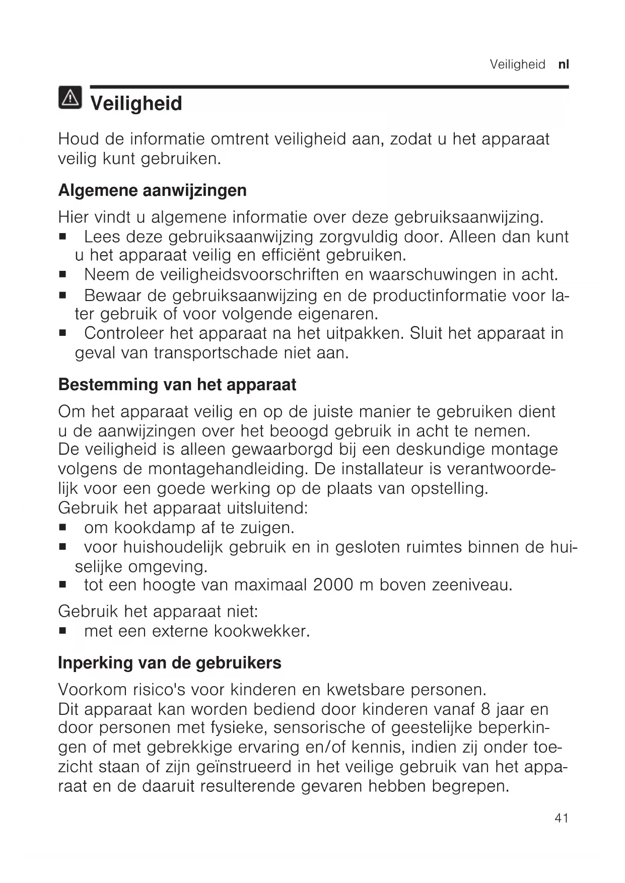 Veiligheid Houd de informatie omtrent veiligheid aan, zodat u het apparaat veilig kunt gebruiken. Algemene aanwijzingen Hier vindt u algemene informatie over deze gebruiksaanwijzing. ¡ Lees deze gebruiksaanwijzing zorgvuldig door. Alleen dan kunt u het apparaat veilig en efficiënt gebruiken. ¡ Neem de veiligheidsvoorschriften en waarschuwingen in acht. ¡ Bewaar de gebruiksaanwijzing en de productinformatie voor la- ter gebruik of voor volgende eigenaren. ¡ Controleer het apparaat na het uitpakken. Sluit het apparaat in geval van transportschade niet aan. Bestemming van het apparaat Om het apparaat veilig en op de juiste manier te gebruiken dient u de aanwijzingen over het beoogd gebruik in acht te nemen. De veiligheid is alleen gewaarborgd bij een deskundige montage volgens de montagehandleiding. De installateur is verantwoorde- lijk voor een goede werking op de plaats van opstelling. Gebruik het apparaat uitsluitend: ¡ om kookdamp af te zuigen. ¡ voor huishoudelijk gebruik en in gesloten ruimtes binnen de hui- selijke omgeving. ¡ tot een hoogte van maximaal 2000m boven zeeniveau. Gebruik het apparaat niet: ¡ met een externe kookwekker. Inperking van de gebruikers Voorkom risico's voor kinderen en kwetsbare personen. Dit apparaat kan worden bediend door kinderen vanaf 8 jaar en door personen met fysieke, sensorische of geestelijke beperkin- gen of met gebrekkige ervaring en/of kennis, indien zij onder toe- zicht staan of zijn geïnstrueerd in het veilige gebruik van het appa- raat en de daaruit resulterende gevaren hebben begrepen.nl Veiligheid