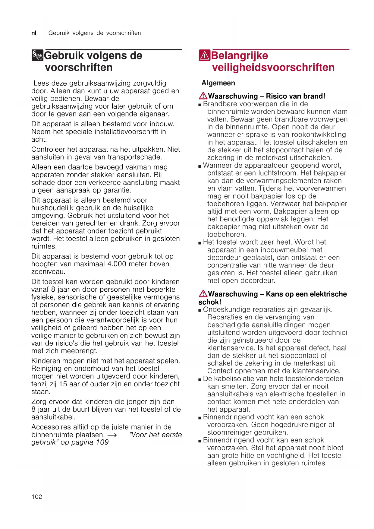 8Gebruik volgens de voorschriften Gebr ui k vol gens de voor schr i f t en Lees deze gebruiksaanwijzing zorgvuldig door. Alleen dan kunt u uw apparaat goed en veilig bedienen. Bewaar de gebruiksaanwijzing voor later gebruik of om door te geven aan een volgende eigenaar. Dit apparaat is alleen bestemd voor inbouw. Neem het speciale installatievoorschrift in acht. Controleer het apparaat na het uitpakken. Niet aansluiten in geval van transportschade. Alleen een daartoe bevoegd vakman mag apparaten zonder stekker aansluiten. Bij schade door een verkeerde aansluiting maakt u geen aanspraak op garantie. Dit apparaat is alleen bestemd voor huishoudelijk gebruik en de huiselijke omgeving. Gebruik het uitsluitend voor het bereiden van gerechten en drank. Zorg ervoor dat het apparaat onder toezicht gebruikt wordt. Het toestel alleen gebruiken in gesloten ruimtes. Dit apparaat is bestemd voor gebruik tot op hoogten van maximaal 4.000 meter boven zeeniveau. Dit toestel kan worden gebruikt door kinderen vanaf 8 jaar en door personen met beperkte fysieke, sensorische of geestelijke vermogens of personen die gebrek aan kennis of ervaring hebben, wanneer zij onder toezicht staan van een persoon die verantwoordelijk is voor hun veiligheid of geleerd hebben het op een veilige manier te gebruiken en zich bewust zijn van de risico's die het gebruik van het toestel met zich meebrengt. Kinderen mogen niet met het apparaat spelen. Reiniging en onderhoud van het toestel mogen niet worden uitgevoerd door kinderen, tenzij zij 15 aar of ouder zijn en onder toezicht staan. Zorg ervoor dat kinderen die jonger zijn dan 8 jaar uit de buurt blijven van het toestel of de aansluitkabel. Accessoires altijd op de juiste manier in de binnenruimte plaatsen. ~ "Voor het eerste gebruik" op pagina 109 (Belangrijke veiligheidsvoorschriften Bel angr i j ke veiligheidsvoorschriften Algemeen :Waarschuwing – Risico van brand! ■ Brandbare voorwerpen die in de binnenruimte worden bewaard kunnen vlam vatten. Bewaar geen brandbare voorwerpen in de binnenruimte. Open nooit de deur wanneer er sprake is van rookontwikkeling in het apparaat. Het toestel uitschakelen en de stekker uit het stopcontact halen of de zekering in de meterkast uitschakelen. Risico van brand! ■ Wanneer de apparaatdeur geopend wordt, ontstaat er een luchtstroom. Het bakpapier kan dan de verwarmingselementen raken en vlam vatten. Tijdens het voorverwarmen mag er nooit bakpapier los op de toebehoren liggen. Verzwaar het bakpapier altijd met een vorm. Bakpapier alleen op het benodigde oppervlak leggen. Het bakpapier mag niet uitsteken over de toebehoren. Risico van brand! ■ Het toestel wordt zeer heet. Wordt het apparaat in een inbouwmeubel met decordeur geplaatst, dan ontstaat er een concentratie van hitte wanneer de deur gesloten is. Het toestel alleen gebruiken met open decordeur. :Waarschuwing – Kans op een elektrische schok! ■ Ondeskundige reparaties zijn gevaarlijk. Reparaties en de vervanging van beschadigde aansluitleidingen mogen uitsluitend worden uitgevoerd door technici die zijn geïnstrueerd door de klantenservice. Is het apparaat defect, haal dan de stekker uit het stopcontact of schakel de zekering in de meterkast uit. Contact opnemen met de klantenservice. Kans op een elektrische schok! ■ De kabelisolatie van hete toestelonderdelen kan smelten. Zorg ervoor dat er nooit aansluitkabels van elektrische toestellen in contact komen met hete onderdelen van het apparaat. Kans op een elektrische schok! ■ Binnendringend vocht kan een schok veroorzaken. Geen hogedrukreiniger of stoomreiniger gebruiken. Kans op een elektrische schok! ■ Binnendringend vocht kan een schok veroorzaken. Stel het apparaat nooit bloot aan grote hitte en vochtigheid. Het toestel alleen gebruiken in gesloten ruimtes. Kans op een elektrische schok!Belangrijke veiligheidsvoorschriften nl
