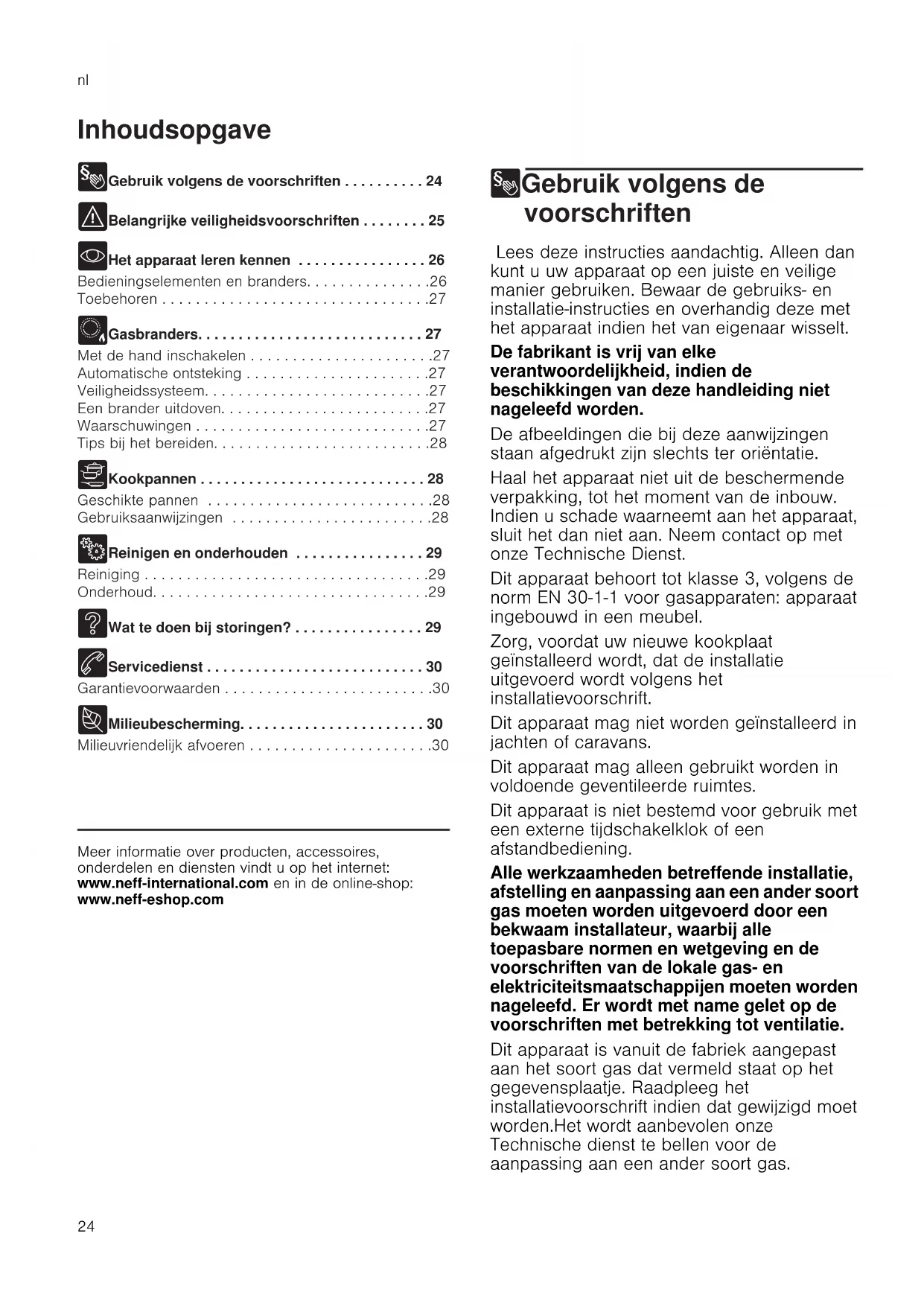 - Het apparaat leren kennen . . . . . . . . . . . . . . . . 26 Bedieningselementen en branders. . . . . . . . . . . . . . .26 Toebehoren . . . . . . . . . . . . . . . . . . . . . . . . . . . . . . . .27 Ä Gasbranders. . . . . . . . . . . . . . . . . . . . . . . . . . . . 27 Met de hand inschakelen . . . . . . . . . . . . . . . . . . . . . .27 Automatische ontsteking . . . . . . . . . . . . . . . . . . . . . .27 Veiligheidssysteem. . . . . . . . . . . . . . . . . . . . . . . . . . .27 Een brander uitdoven. . . . . . . . . . . . . . . . . . . . . . . . .27 Waarschuwingen . . . . . . . . . . . . . . . . . . . . . . . . . . . .27 Tips bij het bereiden. . . . . . . . . . . . . . . . . . . . . . . . . .28 Å Kookpannen . . . . . . . . . . . . . . . . . . . . . . . . . . . . 28 Geschikte pannen . . . . . . . . . . . . . . . . . . . . . . . . . . .28 Gebruiksaanwijzingen . . . . . . . . . . . . . . . . . . . . . . . .28 2 Reinigen en onderhouden . . . . . . . . . . . . . . . . 29 Reiniging . . . . . . . . . . . . . . . . . . . . . . . . . . . . . . . . . .29 Onderhoud. . . . . . . . . . . . . . . . . . . . . . . . . . . . . . . . .29 3 Wat te doen bij storingen? . . . . . . . . . . . . . . . . 29 4 Servicedienst . . . . . . . . . . . . . . . . . . . . . . . . . . . 30 Garantievoorwaarden . . . . . . . . . . . . . . . . . . . . . . . . .30 7 Milieubescherming. . . . . . . . . . . . . . . . . . . . . . . 30 Milieuvriendelijk afvoeren . . . . . . . . . . . . . . . . . . . . . .30 Produktinfo Meer informatie over producten, accessoires, onderdelen en diensten vindt u op het internet: www.neff-international.com en in de online-shop: www.neff-eshop.com 8Gebruik volgens de voorschriften Gebr ui k vol gens de voor schr i f t en Lees deze instructies aandachtig. Alleen dan kunt u uw apparaat op een juiste en veilige manier gebruiken. Bewaar de gebruiks- en installatie-instructies en overhandig deze met het apparaat indien het van eigenaar wisselt. De fabrikant is vrij van elke verantwoordelijkheid, indien de beschikkingen van deze handleiding niet nageleefd worden. De afbeeldingen die bij deze aanwijzingen staan afgedrukt zijn slechts ter oriëntatie. Haal het apparaat niet uit de beschermende verpakking, tot het moment van de inbouw. Indien u schade waarneemt aan het apparaat, sluit het dan niet aan. Neem contact op met onze Technische Dienst. Dit apparaat behoort tot klasse 3, volgens de norm EN 30-1-1 voor gasapparaten: apparaat ingebouwd in een meubel. Zorg, voordat uw nieuwe kookplaat geïnstalleerd wordt, dat de installatie uitgevoerd wordt volgens het installatievoorschrift. Dit apparaat mag niet worden geïnstalleerd in jachten of caravans. Dit apparaat mag alleen gebruikt worden in voldoende geventileerde ruimtes. Dit apparaat is niet bestemd voor gebruik met een externe tijdschakelklok of een afstandbediening. Alle werkzaamheden betreffende installatie, afstelling en aanpassing aan een ander soort gas moeten worden uitgevoerd door een bekwaam installateur, waarbij alle toepasbare normen en wetgeving en de voorschriften van de lokale gas- en elektriciteitsmaatschappijen moeten worden nageleefd. Er wordt met name gelet op de voorschriften met betrekking tot ventilatie. Dit apparaat is vanuit de fabriek aangepast aan het soort gas dat vermeld staat op het gegevensplaatje. Raadpleeg het installatievoorschrift indien dat gewijzigd moet worden.Het wordt aanbevolen onze Technische dienst te bellen voor de aanpassing aan een ander soort gas.Belangrijke veiligheidsvoorschriften nl