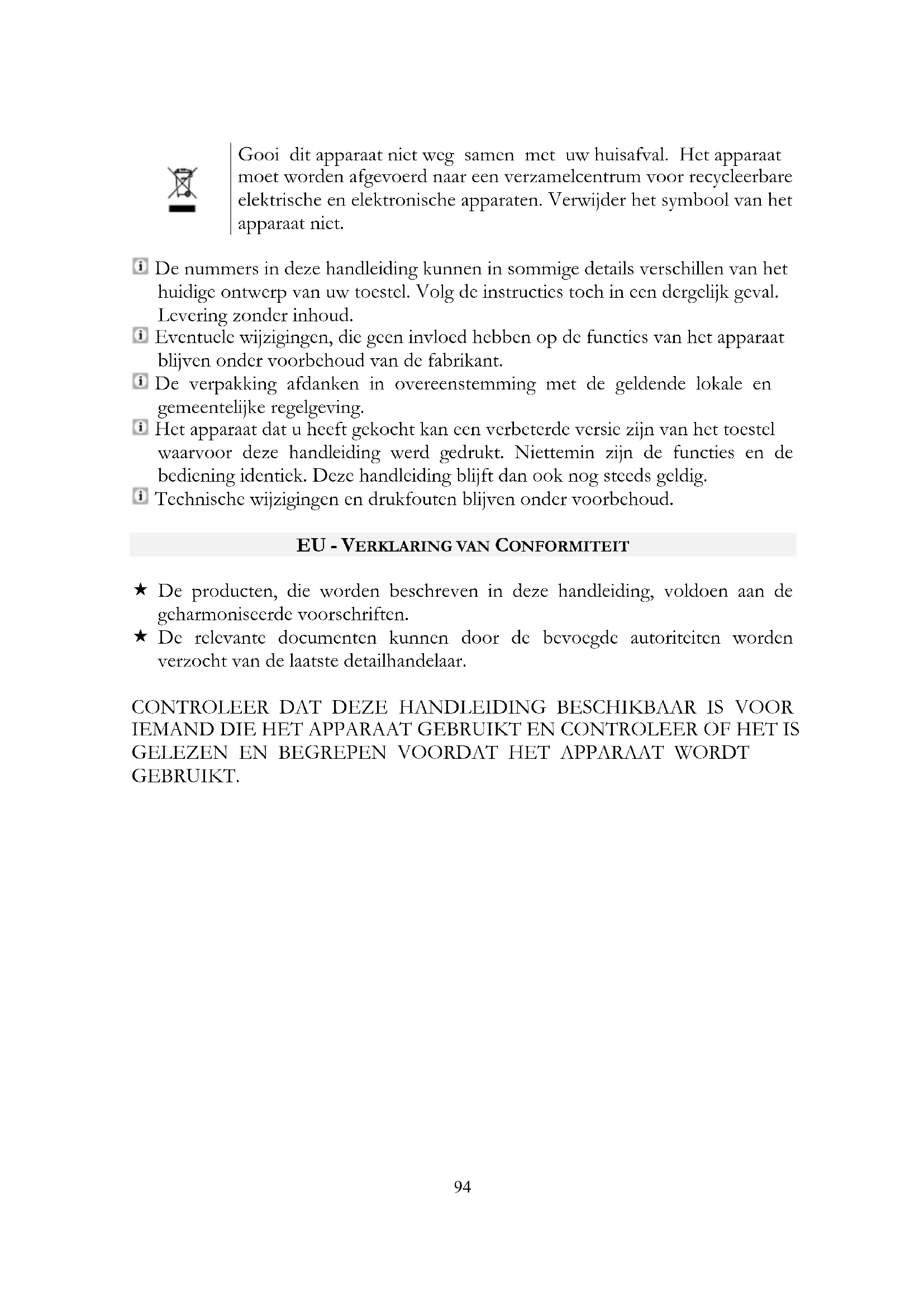 CONTROLEER DAT DEZE HANDLEIDING BESCHIKBAAR IS VOOR IEMAND DIE HET APPARAAT GEBRUIKT EN CONTROLEER OF HET IS GELEZEN EN BEGREPEN VOORDAT HET APPARAAT WORDT GEBRUIKT.