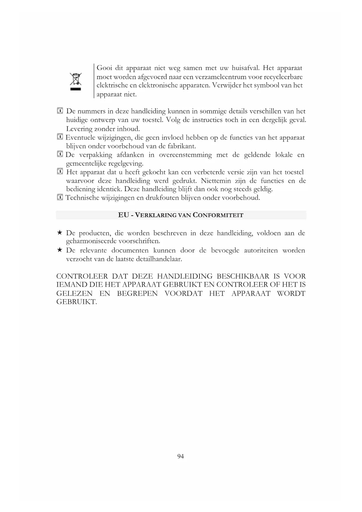 Geachte klant! Wij wilten u graag bedanken voor dc aanschaft van een productuit ons uitgebreide assortment van huishoudelijkke apparatuur. Lees de volledige handlciding voorat u het apparaat voor dc cerste keer.gaat gebruiken. Bewaar dcze handlciding op een veilige plaats voor toekomstige referentie. Als u het apparaat overdraagt aan een derde partij, overhandig dcze handlciding ook aan dc ontvanger.