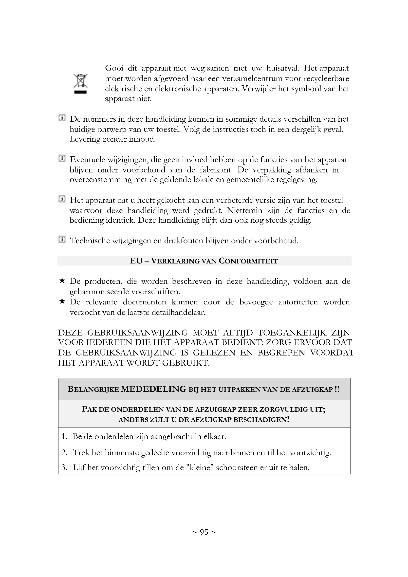 VOOR IEDEREEN DIE HET APPARAAT BEDIENT; ZORG ERVOOR DAT DE GEBRUIKSAANWIJZING IS GELEZEN EN BEGREPEN VOORDAT HET APPARAAT WORDT GEBRUIKT. BELANGRIJKE MEDEDELING BIJ HET UITPAKKEN VAN DE AFZUIGKAP !! PAK DE ONDERDELEN VAN DE AFZUIGKAP ZEER ZORGVULDIG UIT; ANDERS ZULT U DE AFZUIGKAP BESCHADIGEN!