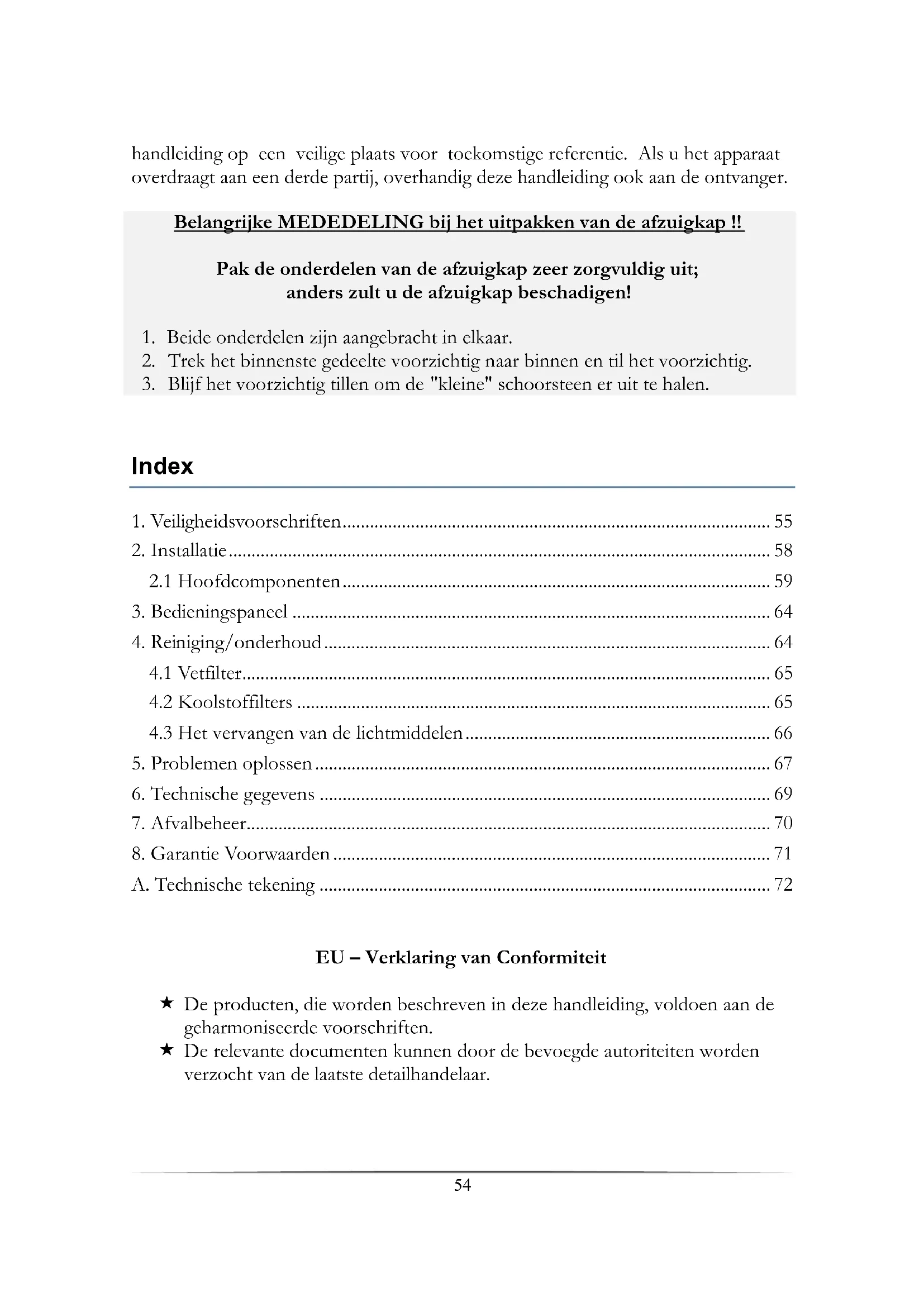 Geachte klant! Wij willen u graag bedanken voor de aanschaf van een product uit ons uitgebreide assortiment van huishoudelijke apparatuur. Lees de volledige handleiding voordat u het apparaat voor de eerste keer gaat gebruiken. Bewaar deze54 handleiding op een veilige plaats voor toekomstige referentie. Als u het apparaat overdraagt aan een derde partij, overhandig deze handleiding ook aan de ontvanger. Belangrijke MEDEDELING bij het uitpakken van de afzuigkap !! Pak de onderdelen van de afzuigkap zeer zorgvuldig uit; anders zult u de afzuigkap beschadigen!
