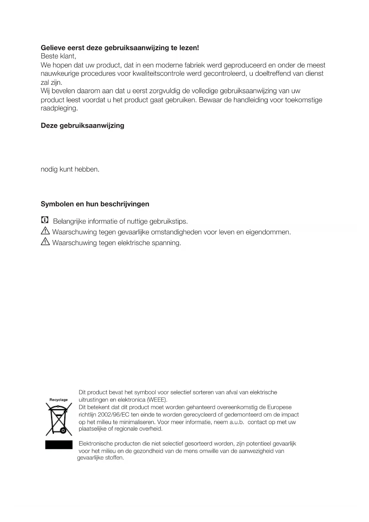 - Daarnaast dient u ook de andere documenten die bij uw product worden geleverd te lezen. Let erop dat deze gebruiksaanwijzing ook voor andere modellen kan gelden. Symbolen en hun beschrijvingen Deze instructiehandleiding bevat de volgende symbolen: C Belangrijke informatie of nuttige gebruikstips. A Waarschuwing tegen gevaarlijke omstandigheden voor leven en eigendommen. B Waarschuwing tegen elektrische spanning. Dit product bevat het symbool voor selectief sorteren van afval van elektrische uitrustingen en elektronica (WEEE). Dit betekent dat dit product moet worden gehanteerd overeenkomstig de Europese richtlijn 2002/96/EC ten einde te worden gerecycleerd of gedemonteerd om de impact op het milieu te minimaliseren. Voor meer informatie, neem a.u.b. contact op met uw plaatselijke of regionale overheid. Elektronische producten die niet selectief gesorteerd worden, zijn potentieel gevaarlijk voor het milieu en de gezondheid van de mens omwille van de aanwezigheid van gevaarlijke stoffen.NL