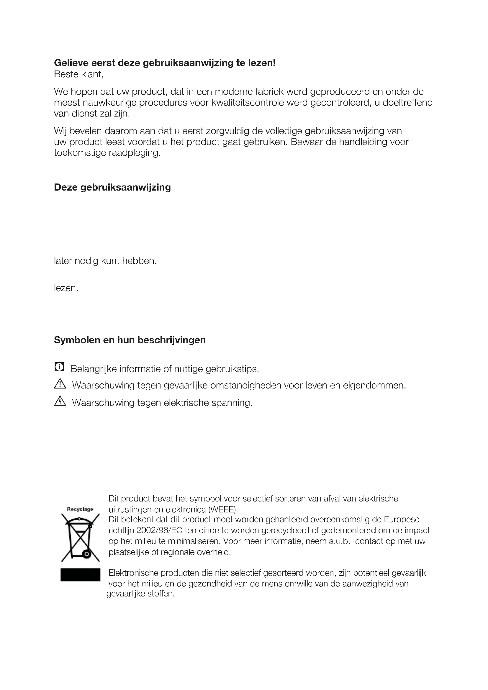 - Daarnaast dient u ook de andere documenten die bij uw product worden geleverd te lezen. Let erop dat deze gebruiksaanwijzing ook voor andere modellen kan gelden. Symbolen en hun beschrijvingen Deze instructiehandleiding bevat de volgende symbolen: C Belangrijke informatie of nuttige gebruikstips. A Waarschuwing tegen gevaarlijke omstandigheden voor leven en eigendommen. B Waarschuwing tegen elektrische spanning. Dit product bevat het symbool voor selectief sorteren van afval van elektrische uitrustingen en elektronica (WEEE). Dit betekent dat dit product moet worden gehanteerd overeenkomstig de Europese richtlijn 2002/96/EC ten einde te worden gerecycleerd of gedemonteerd om de impact op het milieu te minimaliseren. Voor meer informatie, neem a.u.b. contact op met uw plaatselijke of regionale overheid. Elektronische producten die niet selectief gesorteerd worden, zijn potentieel gevaarlijk voor het milieu en de gezondheid van de mens omwille van de aanwezigheid van gevaarlijke stoffen.FL