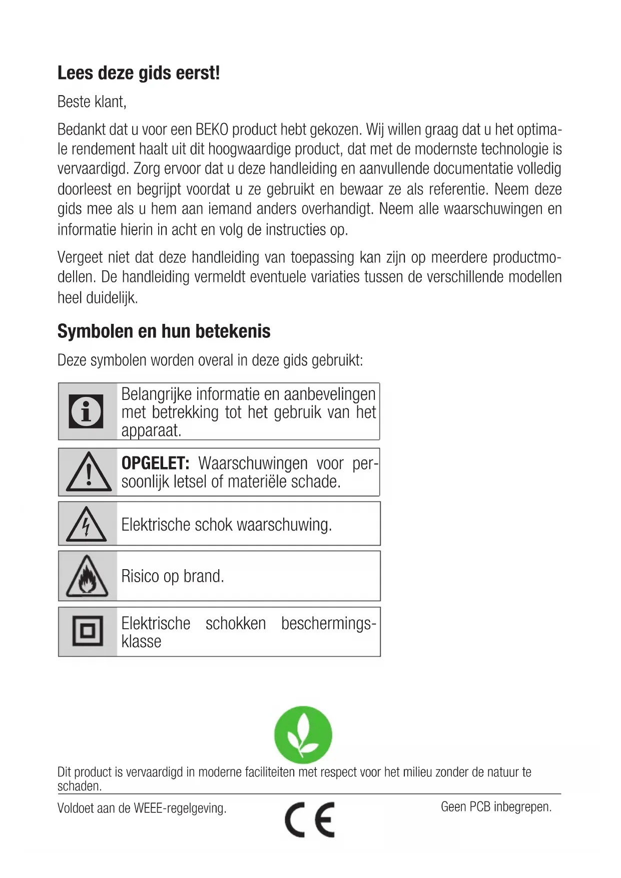 6 Решавање проблемиLees deze gids eerst! Beste klant, Bedankt dat u voor een BEKO product hebt gekozen. Wij willen graag dat u het optima- le rendement haalt uit dit hoogwaardige product, dat met de modernste technologie is vervaardigd. Zorg ervoor dat u deze handleiding en aanvullende documentatie volledig doorleest en begrijpt voordat u ze gebruikt en bewaar ze als referentie. Neem deze gids mee als u hem aan iemand anders overhandigt. Neem alle waarschuwingen en informatie hierin in acht en volg de instructies op. Vergeet niet dat deze handleiding van toepassing kan zijn op meerdere productmo- dellen. De handleiding vermeldt eventuele variaties tussen de verschillende modellen heel duidelijk. Symbolen en hun betekenis Deze symbolen worden overal in deze gids gebruikt: