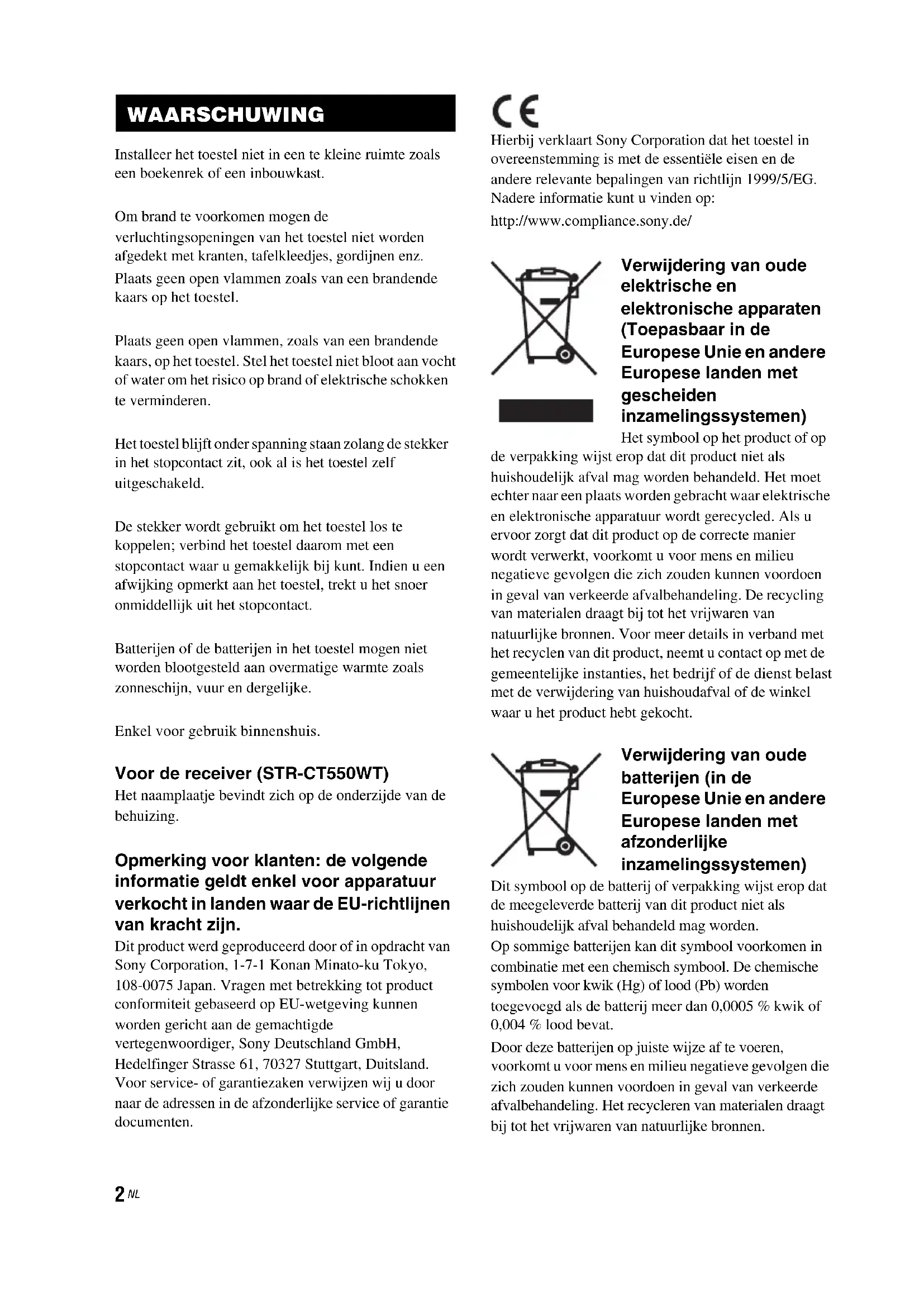 Installeer het toestel niet in een te kleine ruimte zoals een boekenrek of een inbouwkast. Om brand te voorkomen mogen de verluchtingsopeningen van het toestel niet worden afgedekt met kranten, tafelkleedjes, gordijnen enz. Plaats geen open vlammen zoals van een brandende kaars op het toestel. Plaats geen open vlammen, zoals van een brandende kaars, op het toestel. Stel het toestel niet bloot aan vocht of water om het risico op brand of elektrische schokken te verminderen. Het toestel blijft onder spanning staan zolang de stekker in het stopcontact zit, ook al is het toestel zelf uitgeschakeld. De stekker wordt gebruikt om het toestel los te koppelen; verbind het toestel daarom met een stopcontact waar u gemakkelijk bij kunt. Indien u een afwijking opmerkt aan het toestel, trekt u het snoer onmiddellijk uit het stopcontact. Batterijen of de batterijen in het toestel mogen niet worden blootgesteld aan overmatige warmte zoals zonneschijn, vuur en dergelijke. Enkel voor gebruik binnenshuis. Voor de receiver (STR-CT550WT) Het naamplaatje bevindt zich op de onderzijde van de behuizing. Opmerking voor klanten: de volgende informatie geldt enkel voor apparatuur verkocht in landen waar de EU-richtlijnen van kracht zijn. Dit product werd geproduceerd door of in opdracht van Sony Corporation, 1-7-1 Konan Minato-ku Tokyo, 108-0075 Japan. Vragen met betrekking tot product conformiteit gebaseerd op EU-wetgeving kunnen worden gericht aan de gemachtigde vertegenwoordiger, Sony Deutschland GmbH, Hedelfinger Strasse 61, 70327 Stuttgart, Duitsland. Voor service- of garantiezaken verwijzen wij u door naar de adressen in de afzonderlijke service of garantie documenten. Hierbij verklaart Sony Corporation dat het toestel in overeenstemming is met de essentiële eisen en de andere relevante bepalingen van richtlijn 1999/5/EG. Nadere informatie kunt u vinden op: http://www.compliance.sony.de/ Verwijdering van oude elektrische en elektronische apparaten (Toepasbaar in de Europese Unie en andere Europese landen met gescheiden inzamelingssystemen) Het symbool op het product of op de verpakking wijst erop dat dit product niet als huishoudelijk afval mag worden behandeld. Het moet echter naar een plaats worden gebracht waar elektrische en elektronische apparatuur wordt gerecycled. Als u ervoor zorgt dat dit product op de correcte manier wordt verwerkt, voorkomt u voor mens en milieu negatieve gevolgen die zich zouden kunnen voordoen in geval van verkeerde afvalbehandeling. De recycling van materialen draagt bij tot het vrijwaren van natuurlijke bronnen. Voor meer details in verband met het recyclen van dit product, neemt u contact op met de gemeentelijke instanties, het bedrijf of de dienst belast met de verwijdering van huishoudafval of de winkel waar u het product hebt gekocht. Verwijdering van oude batterijen (in de Europese Unie en andere Europese landen met afzonderlijke inzamelingssystemen) Dit symbool op de batterij of verpakking wijst erop dat de meegeleverde batterij van dit product niet als huishoudelijk afval behandeld mag worden. Op sommige batterijen kan dit symbool voorkomen in combinatie met een chemisch symbool. De chemische symbolen voor kwik (Hg) of lood (Pb) worden toegevoegd als de batterij meer dan 0,0005 % kwik of 0,004 % lood bevat. Door deze batterijen op juiste wijze af te voeren, voorkomt u voor mens en milieu negatieve gevolgen die zich zouden kunnen voordoen in geval van verkeerde afvalbehandeling. Het recycleren van materialen draagt bij tot het vrijwaren van natuurlijke bronnen. WAARSCHUWING3