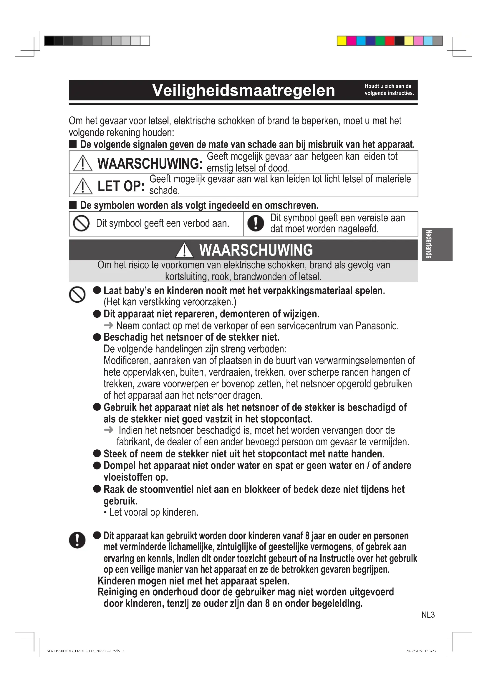 Panasonic zal geen aansprakelijkheden aannemen indien het apparaat ongepast is gebruikt of niet aan deze instructies heeft voldaan. SD-ZP2000 OI3_DZ50B2113_20220524.indb 2SD-ZP2000 OI3_DZ50B2113_20220524.indb 2 2022/5/25 13:26:312022/5/25 13:26:31NL3 Om het gevaar voor letsel, elektrische schokken of brand te beperken, moet u met het volgende rekening houden: