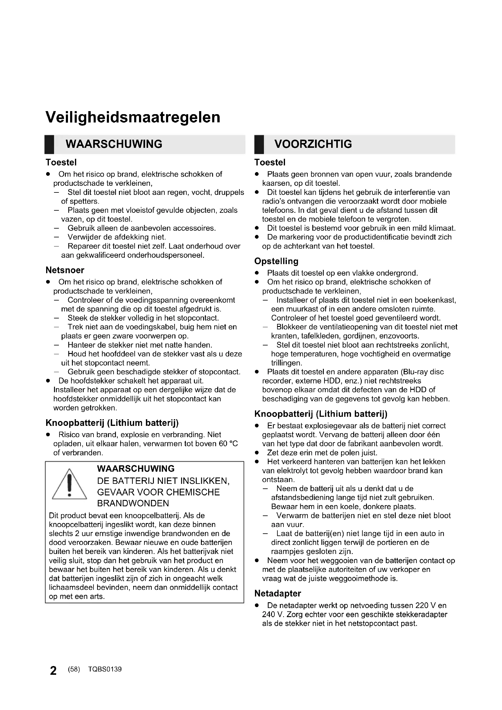 Gamma di umidità tollerata Da 20 % a 80 % di umidità relativa (senza condensa) (57) SC-SB10_EG_TQBS0139_ita.book 15 ページ 2017年4月25日 火曜日 午後3時6分2 TQBS0139Inhoudso pgave Veiligheidsmaatregelen Toestel ≥ Om het risico op brand, elektrische schokken of productschade te verkleinen, j Stel dit toestel niet bloot aan regen, vocht, druppels of spetters. j Plaats geen met vloeistof gevulde objecten, zoals vazen, op dit toestel. j Gebruik alleen de aanbevolen accessoires. j Verwijder de afdekking niet. j Repareer dit toestel niet zelf. Laat onderhoud over aan gekwalificeerd onderhoudspersoneel. Netsnoer ≥ Om het risico op brand, elektrische schokken of productschade te verkleinen, j Controleer of de voedingsspanning overeenkomt met de spanning die op dit toestel afgedrukt is. j Steek de stekker volledig in het stopcontact. j Trek niet aan de voedingskabel, buig hem niet en plaats er geen zware voorwerpen op. j Hanteer de stekker niet met natte handen. j Houd het hoofddeel van de stekker vast als u deze uit het stopcontact neemt. j Gebruik geen beschadigde stekker of stopcontact. ≥ De hoofdstekker schakelt het apparaat uit. Installeer het apparaat op een dergelijke wijze dat de hoofdstekker onmiddellijk uit het stopcontact kan worden getrokken. Knoopbatterij (Lithium batterij) ≥ Risico van brand, explosie en verbranding. Niet opladen, uit elkaar halen, verwarmen tot boven 60 xC of verbranden. Toestel ≥ Plaats geen bronnen van open vuur, zoals brandende kaarsen, op dit toestel. ≥ Dit toestel kan tijdens het gebruik de interferentie van radio’s ontvangen die veroorzaakt wordt door mobiele telefoons. In dat geval dient u de afstand tussen dit toestel en de mobiele telefoon te vergroten. ≥ Dit toestel is bestemd voor gebruik in een mild klimaat. ≥ De markering voor de productidentificatie bevindt zich op de achterkant van het toestel. Opstelling ≥ Plaats dit toestel op een vlakke ondergrond. ≥ Om het risico op brand, elektrische schokken of productschade te verkleinen, j Installeer of plaats dit toestel niet in een boekenkast, een muurkast of in een andere omsloten ruimte. Controleer of het toestel goed geventileerd wordt. j Blokkeer de ventilatieopening van dit toestel niet met kranten, tafelkleden, gordijnen, enzovoorts. j Stel dit toestel niet bloot aan rechtstreeks zonlicht, hoge temperaturen, hoge vochtigheid en overmatige trillingen. ≥ Plaats dit toestel en andere apparaten (Blu-ray disc recorder, externe HDD, enz.) niet rechtstreeks bovenop elkaar omdat dit defecten van de HDD of beschadiging van de gegevens tot gevolg kan hebben. Knoopbatterij (Lithium batterij) ≥ Er bestaat explosiegevaar als de batterij niet correct geplaatst wordt. Vervang de batterij alleen door één van het type dat door de fabrikant aanbevolen wordt. ≥ Zet deze erin met de polen juist. ≥ Het verkeerd hanteren van batterijen kan het lekken van elektrolyt tot gevolg hebben waardoor brand kan ontstaan. j Neem de batterij uit als u denkt dat u de afstandsbediening lange tijd niet zult gebruiken. Bewaar hem in een koele, donkere plaats. j Verwarm de batterijen niet en stel deze niet bloot aan vuur. j Laat de batterij(en) niet lange tijd in een auto in direct zonlicht liggen terwijl de portieren en de raampjes gesloten zijn. ≥ Neem voor het weggooien van de batterijen contact op met de plaatselijke autoriteiten of uw verkoper en vraag wat de juiste weggooimethode is. Netadapter ≥ De netadapter werkt op netvoeding tussen 220 V en 240 V. Zorg echter voor een geschikte stekkeradapter als de stekker niet in het netstopcontact past. WAARSCHUWING WAARSCHUWING DE BATTERIJ NIET INSLIKKEN,