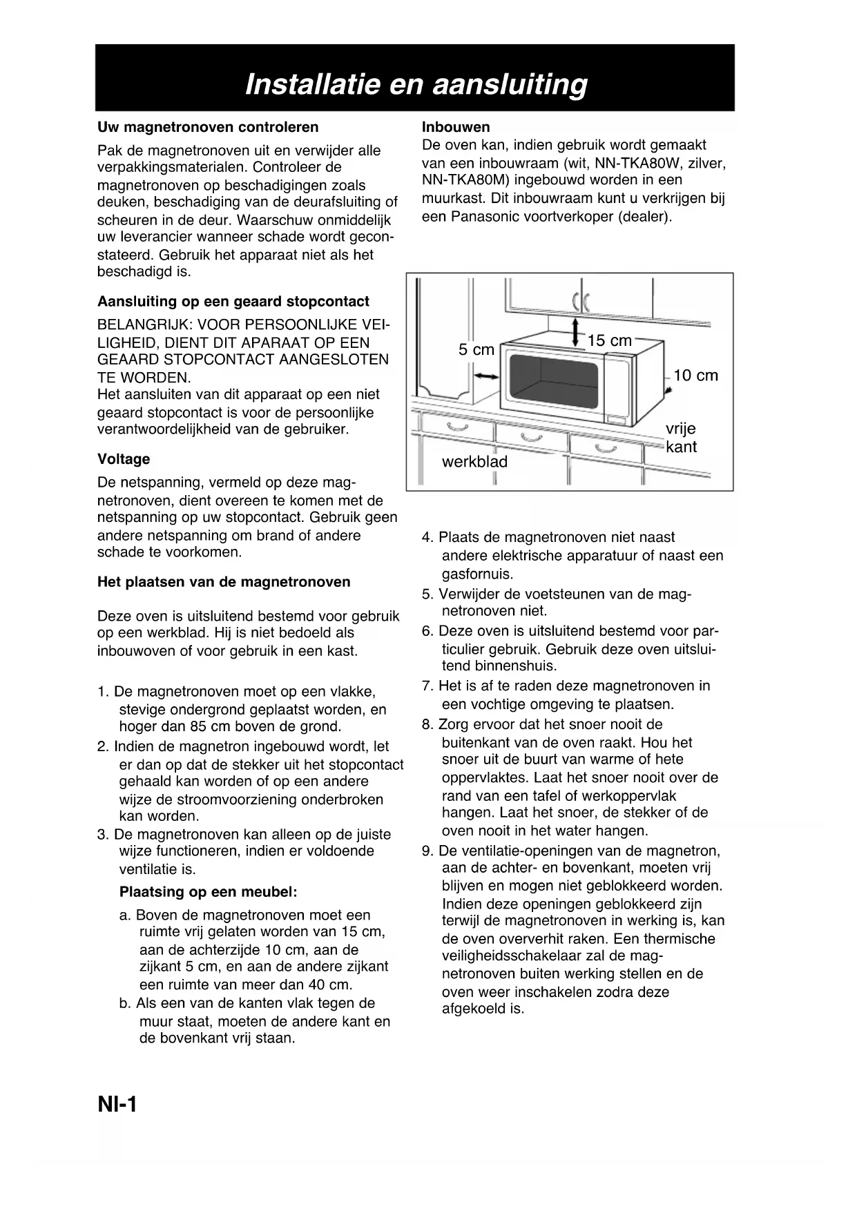 wijze functioneren, indien er voldoende ventilatie is. Plaatsing op een meubel: a. Boven de magnetronoven moet een ruimte vrij gelaten worden van 15 cm, aan de achterzijde 10 cm, aan de zijkant 5 cm, en aan de andere zijkant een ruimte van meer dan 40 cm. b. Als een van de kanten vlak tegen de muur staat, moeten de andere kant en de bovenkant vrij staan. Inbouwen De oven kan, indien gebruik wordt gemaakt van een inbouwraam (wit, NN-TKA80W, zilver, NN-TKA80M) ingebouwd worden in een muurkast. Dit inbouwraam kunt u verkrijgen bij een Panasonic voortverkoper (dealer).