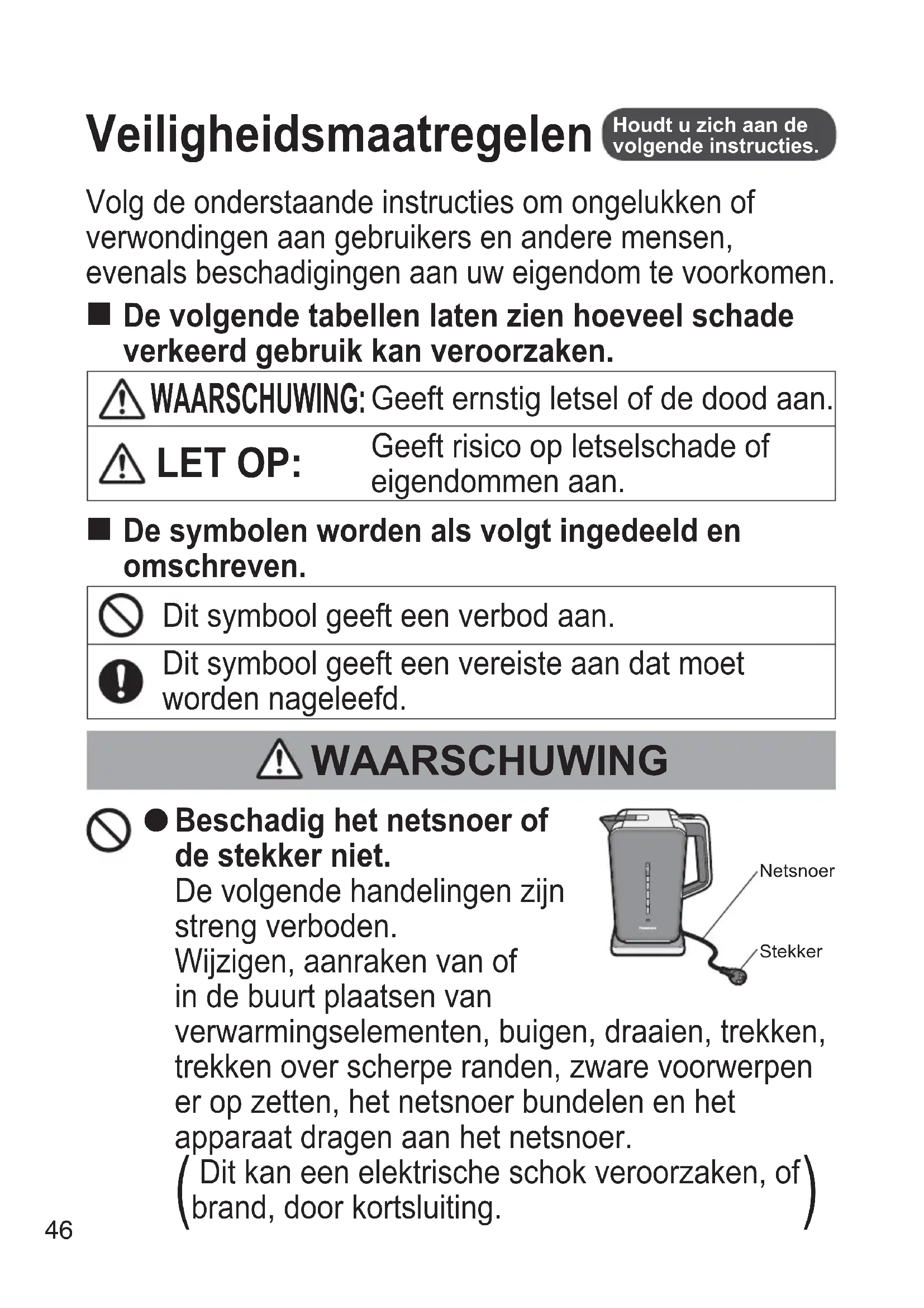 De symbolen worden als volgt ingedeeld en omschreven. Dit symbool geeft een verbod aan. Dit symbool geeft een vereiste aan dat moet worden nageleefd. WAARSCHUWING Beschadig het netsnoer of