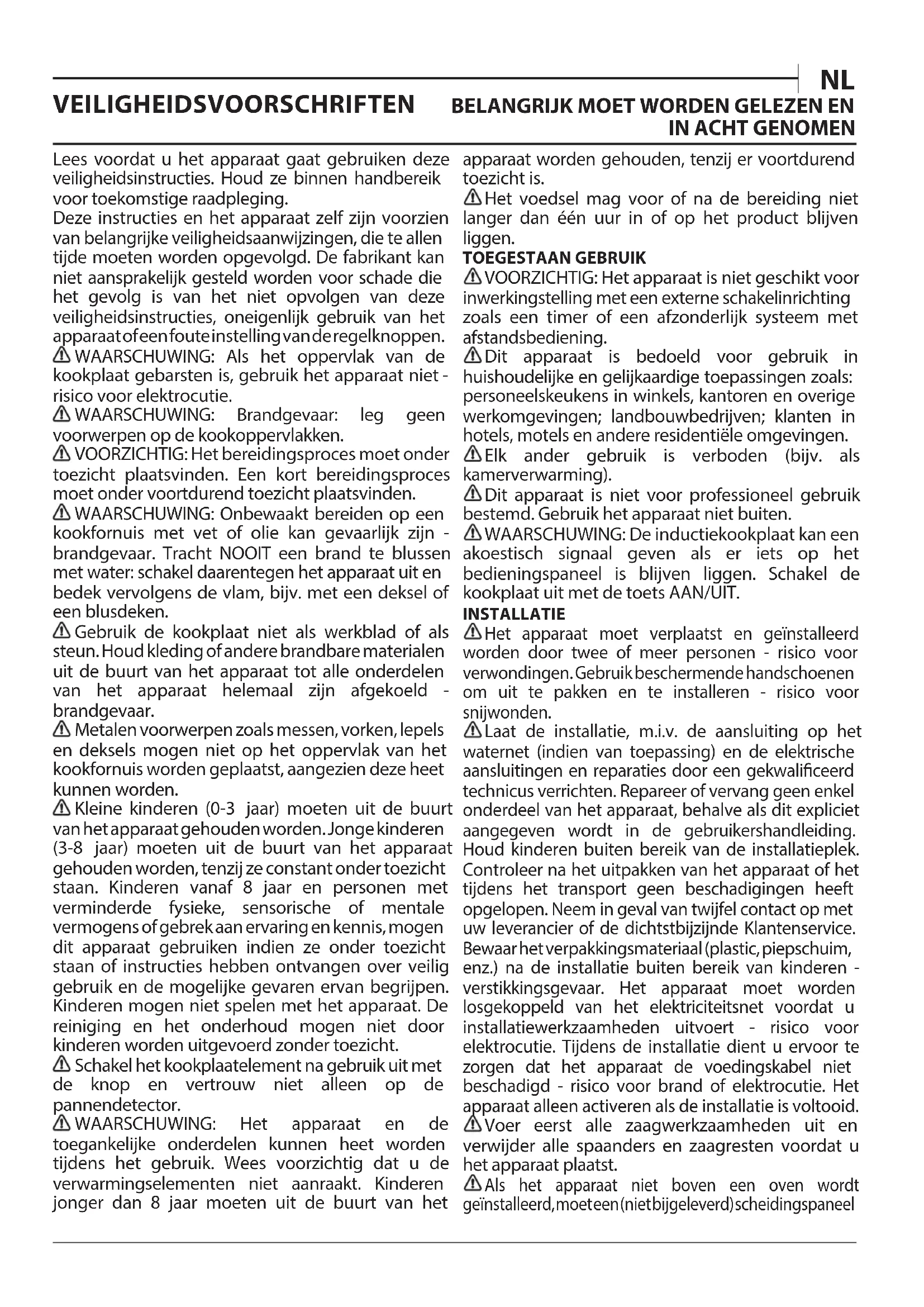 Lees voordat u het apparaat gaat gebruiken deze veiligheidsinstructies. Houd ze binnen handbereik voor toekomstige raadpleging. Deze instructies en het apparaat zelf zijn voorzien van belangrijke veiligheidsaanwijzingen, die te allen tijde moeten worden opgevolgd. De fabrikant kan niet aansprakelijk gesteld worden voor schade die het gevolg is van het niet opvolgen van deze veiligheidsinstructies, oneigenlijk gebruik van het apparaat of een foute instelling van de regelknoppen. WAARSCHUWING: Als het oppervlak van de kookplaat gebarsten is, gebruik het apparaat niet- risico voor elektrocutie. WAARSCHUWING: Brandgevaar: leg geen voorwerpen op de kookoppervlakken. VOORZICHTIG: Het bereidingsproces moet onder toezicht plaatsvinden. Een kort bereidingsproces moet onder voortdurend toezicht plaatsvinden. WAARSCHUWING: Onbewaakt bereiden op een kookfornuis met vet of olie kan gevaarlijk zijn - brandgevaar. Tracht NOOIT een brand te blussen met water: schakel daarentegen het apparaat uit en bedek vervolgens de vlam, bijv. met een deksel of een blusdeken. Gebruik de kookplaat niet als werkblad of als steun. Houd kleding of andere brandbare materialen uit de buurt van het apparaat tot alle onderdelen van het apparaat helemaal zijn afgekoeld - brandgevaar. Metalen voorwerpen zoals messen, vorken, lepels en deksels mogen niet op het oppervlak van het kookfornuis worden geplaatst, aangezien deze heet kunnen worden. Kleine kinderen (0-3 jaar) moeten uit de buurt van het apparaat gehouden worden. Jonge kinderen (3-8 jaar) moeten uit de buurt van het apparaat gehouden worden, tenzij ze constant onder toezicht staan. Kinderen vanaf 8 jaar en personen met verminderde fysieke, sensorische of mentale vermogens of gebrek aan ervaring en kennis, mogen dit apparaat gebruiken indien ze onder toezicht staan of instructies hebben ontvangen over veilig gebruik en de mogelijke gevaren ervan begrijpen. Kinderen mogen niet spelen met het apparaat. De reiniging en het onderhoud mogen niet door kinderen worden uitgevoerd zonder toezicht. Schakel het kookplaatelement na gebruik uit met de knop en vertrouw niet alleen op de pannendetector. WAARSCHUWING: Het apparaat en de toegankelijke onderdelen kunnen heet worden tijdens het gebruik. Wees voorzichtig dat u de verwarmingselementen niet aanraakt. Kinderen jonger dan 8 jaar moeten uit de buurt van het apparaat worden gehouden, tenzij er voortdurend toezicht is. Het voedsel mag voor of na de bereiding niet langer dan één uur in of op het product blijven liggen. TOEGESTAAN GEBRUIK VOORZICHTIG: Het apparaat is niet geschikt voor inwerkingstelling met een externe schakelinrichting zoals een timer of een afzonderlijk systeem met afstandsbediening. Dit apparaat is bedoeld voor gebruik in huishoudelijke en gelijkaardige toepassingen zoals: personeelskeukens in winkels, kantoren en overige werkomgevingen; landbouwbedrijven; klanten in hotels, motels en andere residentiële omgevingen. Elk ander gebruik is verboden (bijv. als kamerverwarming). Dit apparaat is niet voor professioneel gebruik bestemd. Gebruik het apparaat niet buiten. WAARSCHUWING: De inductiekookplaat kan een akoestisch signaal geven als er iets op het bedieningspaneel is blijven liggen. Schakel de kookplaat uit met de toets AAN/UIT. INSTALLATIE Het apparaat moet verplaatst en geïnstalleerd worden door twee of meer personen - risico voor verwondingen. Gebruik beschermende handschoenen om uit te pakken en te installeren - risico voor snijwonden. Laat de installatie, m.i.v. de aansluiting op het waternet (indien van toepassing) en de elektrische aansluitingen en reparaties door een gekwaliceerd technicus verrichten. Repareer of vervang geen enkel onderdeel van het apparaat, behalve als dit expliciet aangegeven wordt in de gebruikershandleiding. Houd kinderen buiten bereik van de installatieplek. Controleer na het uitpakken van het apparaat of het tijdens het transport geen beschadigingen heeft opgelopen. Neem in geval van twijfel contact op met uw leverancier of de dichtstbijzijnde Klantenservice. Bewaar het verpakkingsmateriaal (plastic, piepschuim, enz.) na de installatie buiten bereik van kinderen - verstikkingsgevaar. Het apparaat moet worden losgekoppeld van het elektriciteitsnet voordat u installatiewerkzaamheden uitvoert - risico voor elektrocutie. Tijdens de installatie dient u ervoor te zorgen dat het apparaat de voedingskabel niet beschadigd - risico voor brand of elektrocutie. Het apparaat alleen activeren als de installatie is voltooid. Voer eerst alle zaagwerkzaamheden uit en verwijder alle spaanders en zaagresten voordat u het apparaat plaatst. Als het apparaat niet boven een oven wordt geïnstalleerd, moet een (niet bijgeleverd) scheidingspaneelworden geïnstalleerd in het compartiment onder het apparaat. ELEKTRISCHE WAARSCHUWINGEN Het moet mogelijk zijn het apparaat van het elektriciteitsnet af te koppelen door de stekker uit het stopcontact te halen of via een meerpolige netschakelaar die bovenstrooms van het stopcontact is geplaatst conform de bedradingsvoorschriften en het apparaat dient geaard te zijn conform de nationale veiligheidsnormen voor elektriciteit. Gebruik geen verlengsnoeren, meervoudige stopcontacten of adapters. Als de installatie voltooid is, mogen de elektrische onderdelen niet meer toegankelijk zijn voor de gebruiker. Gebruik het apparaat niet wanneer u natte voeten hebt of blootsvoets bent. Gebruik het apparaat niet als de stroomkabel of de stekker beschadigd is, als het apparaat niet goed werkt of als het beschadigd of gevallen is. Installatie met behulp van een netsnoerstekker is niet toegestaan, tenzij het product reeds is uitgerust met de door de fabrikant geleverde stekker. Als het netsnoer beschadigd is, moet het vervangen worden door de fabrikant, een servicevertegenwoordiger of gekwaliceerd personeel om risico’s te voorkomen - risico voor elektrocutie.