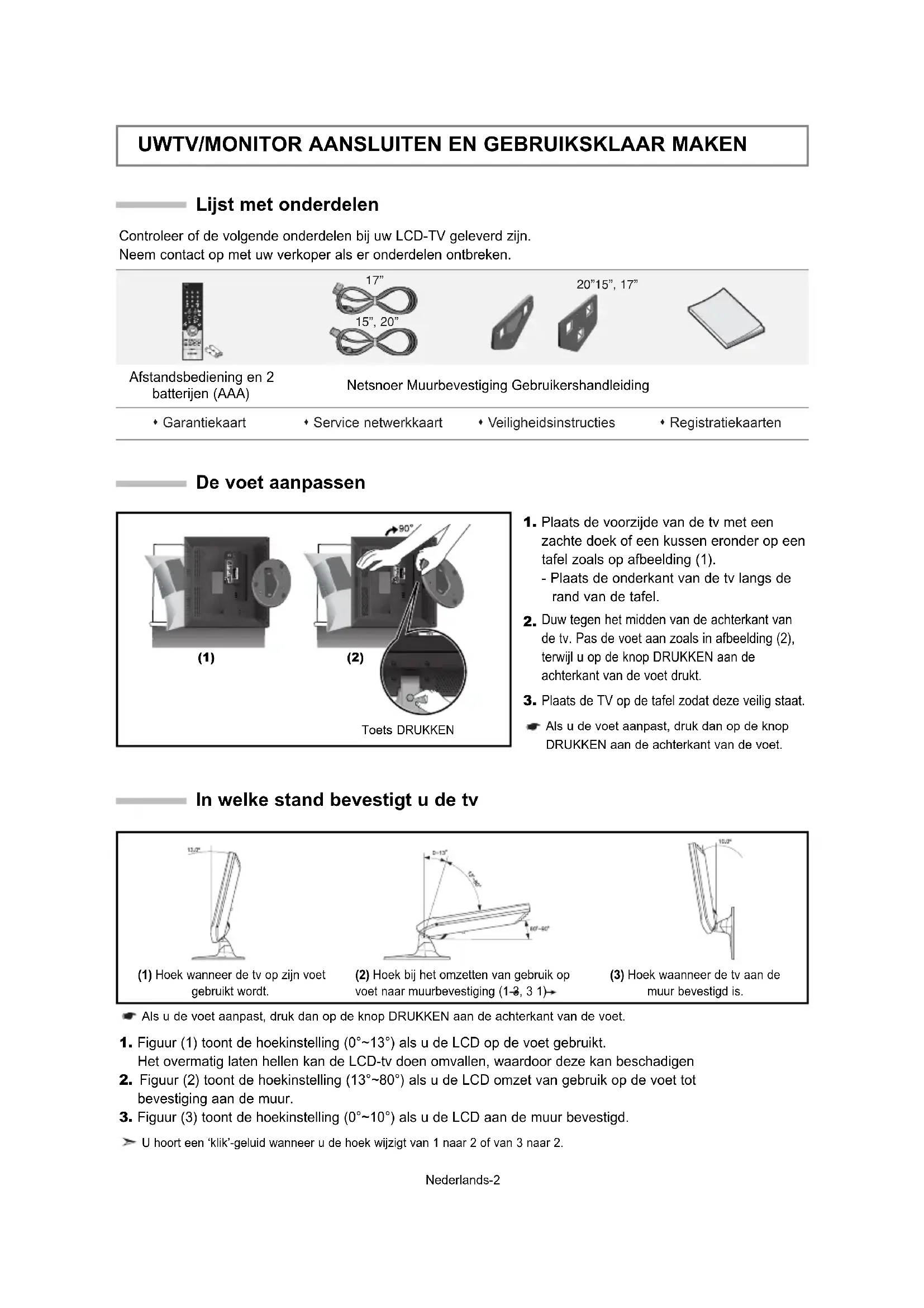 Lijst met onderdelen Controleer of de volgende onderdelen bij uw LCD-TV geleverd zijn. Neem contact op met uw verkoper als er onderdelen ontbreken. Afstandsbediening en 2 batterijen (AAA) Netsnoer Muurbevestiging Gebruikershandleiding Garantiekaart Service netwerkkaart Veiligheidsinstructies Registratiekaarten De voet aanpassen (1) (2)