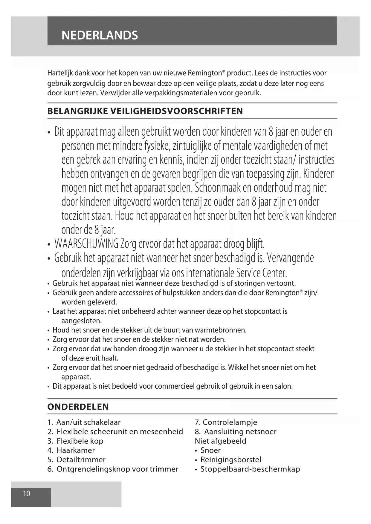 - Gebruik geen andere accessoires of hulpstukken anders dan die door Remington® zijn/ worden geleverd.