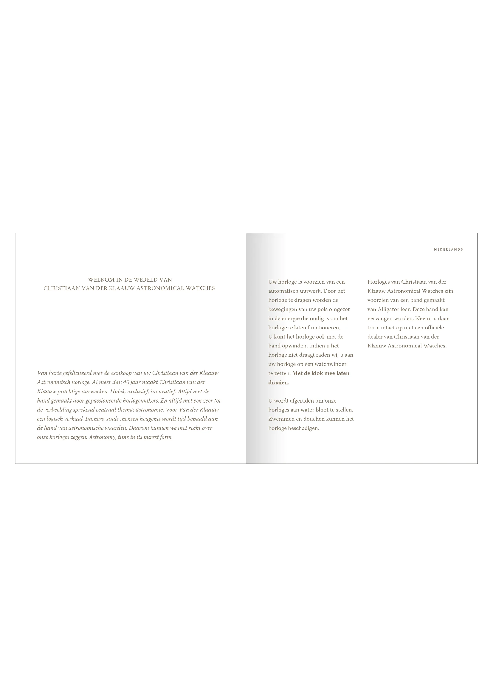 Van harte gefeliciteerd met de aankoop van uw Christiaan van der Klaauw Astronomisch horloge. Al meer dan 40 jaar maakt Christiaan van der Klaauw prachtige uurwerken Uniek, exclusief, innovatief. Altijd met de hand gemaakt door gepassioneerde horlogemakers. En altijd met een zeer tot de verbeelding sprekend centraal thema: astronomie. Voor Van der Klaauw een logisch verhaal. Immers, sinds mensen heugenis wordt tijd bepaald aan de hand van astronomische waarden. Daarom kunnen we met recht over onze horloges zeggen: Astronomy, time in its purest form. Uw horloge is voorzien van een automatisch uurwerk. Door het horloge te dragen worden de bewegingen van uw pols omgezet in de energie die nodig is om het horloge te laten functioneren. U kunt het horloge ook met de hand opwinden. Indien u het horloge niet draagt raden wij u aan uw horloge op een watchwinder te zetten. Met de klok mee laten draaien. U wordt afgeraden om onze horloges aan water bloot te stellen. Zwemmen en douchen kunnen het horloge beschadigen. Horloges van Christiaan van der Klaauw Astronomical Watches zijn voorzien van een band gemaakt van Alligator leer. Deze band kan vervangen worden. Neemt u daar- toe contact op met een ociële dealer van Christiaan van der Klaauw Astronomical Watches. NEDERLANDSSpecicaties Op de Real Moon 1980 zijn de volgende gegevens af te lezen: