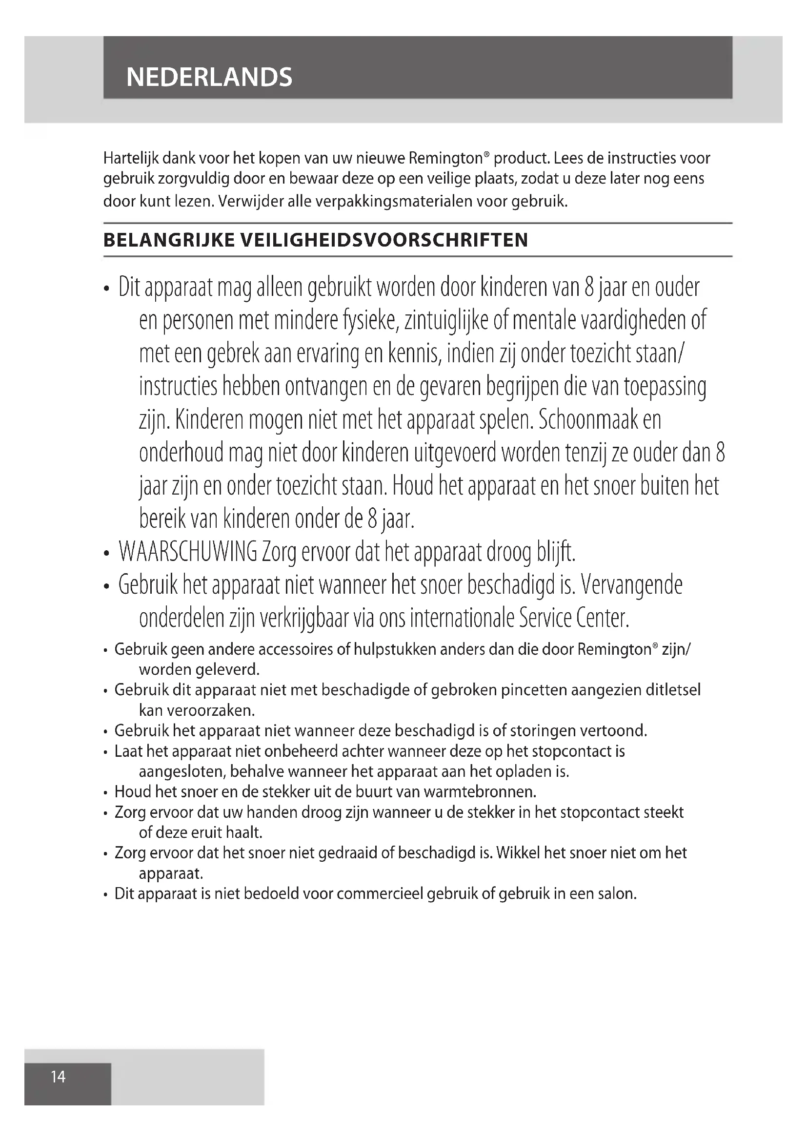 AE14 Hartelijk dank voor het kopen van uw nieuwe Remington® product. Lees de instructies voor gebruik zorgvuldig door en bewaar deze op een veilige plaats, zodat u deze later nog eens door kunt lezen. Verwijder alle verpakkingsmaterialen voor gebruik. BELANGRIJKE VEILIGHEIDSVOORSCHRIFTEN