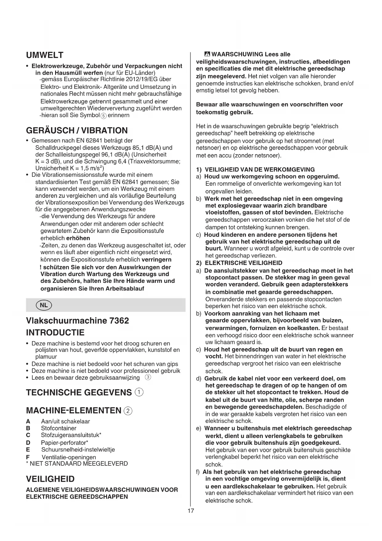 können Sie die gewünschte Schleifgeschwindigkeit einstellen17 - WAARSCHUWING Lees alle veiligheidswaarschuwingen, instructies, afbeeldingen en specicaties die met dit elektrische gereedschap zijn meegeleverd. Het niet volgen van alle hieronder genoemde instructies kan elektrische schokken, brand en/of ernstig letsel tot gevolg hebben. Bewaar alle waarschuwingen en voorschriften voor toekomstig gebruik. Het in de waarschuwingen gebruikte begrip “elektrisch gereedschap” heeft betrekking op elektrische gereedschappen voor gebruik op het stroomnet (met netsnoer) en op elektrische gereedschappen voor gebruik met een accu (zonder netsnoer).