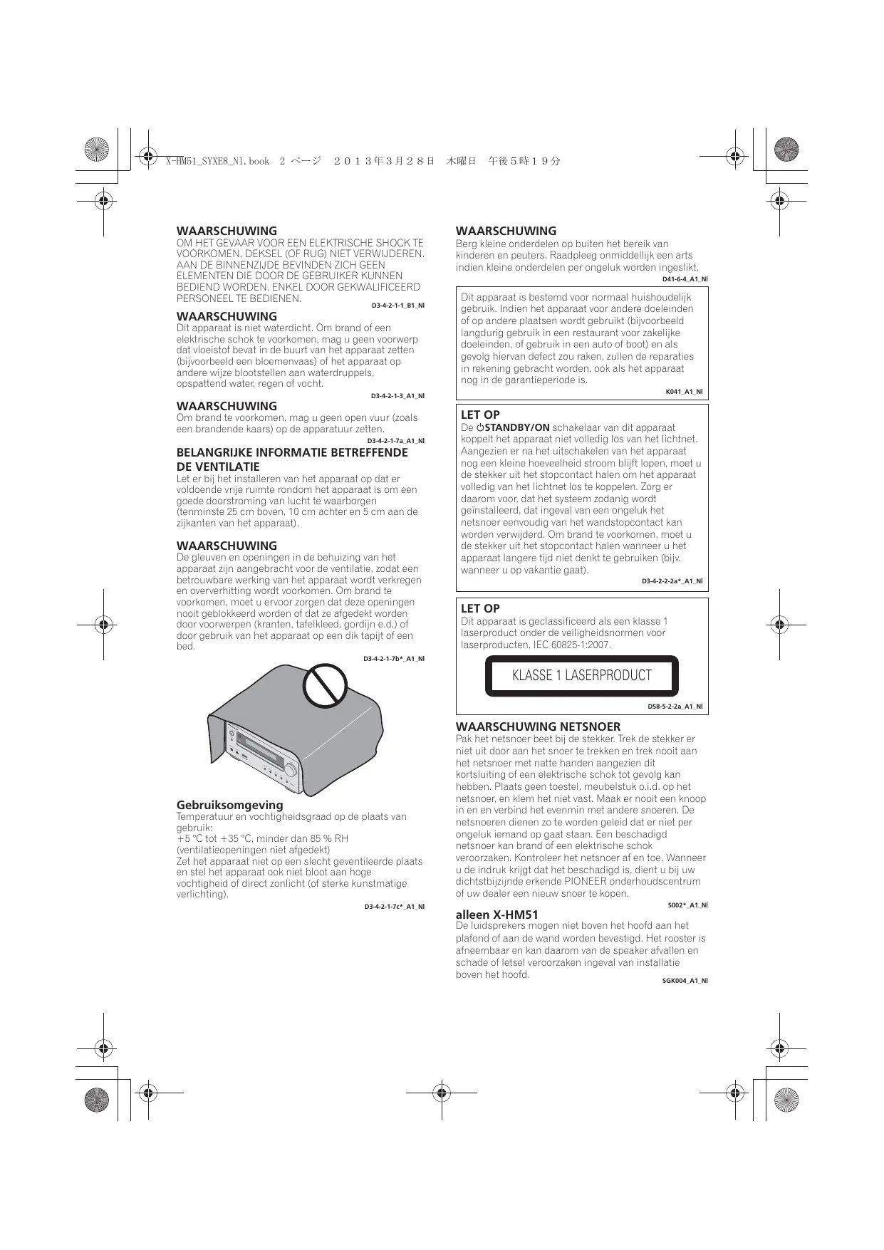Gebruiksomgeving Temperatuur en vochtigheidsgraad op de plaats van gebruik: +5 °C tot +35 °C, minder dan 85 % RH (ventilatieopeningen niet afgedekt) Zet het apparaat niet op een slecht geventileerde plaats en stel het apparaat ook niet bloot aan hoge vochtigheid of direct zonlicht (of sterke kunstmatige verlichting). D3-4-2-1-7c*_A1_Nl Pak het netsnoer beet bij de stekker. Trek de stekker er niet uit door aan het snoer te trekken en trek nooit aan het netsnoer met natte handen aangezien dit kortsluiting of een elektrische schok tot gevolg kan hebben. Plaats geen toestel, meubelstuk o.i.d. op het netsnoer, en klem het niet vast. Maak er nooit een knoop in en en verbind het evenmin met andere snoeren. De netsnoeren dienen zo te worden geleid dat er niet per ongeluk iemand op gaat staan. Een beschadigd netsnoer kan brand of een elektrische schok veroorzaken. Kontroleer het netsnoer af en toe. Wanneer u de indruk krijgt dat het beschadigd is, dient u bij uw dichtstbijzijnde erkende PIONEER onderhoudscentrum of uw dealer een nieuw snoer te kopen. S002*_A1_Nl alleen X-HM51 De luidsprekers mogen niet boven het hoofd aan het plafond of aan de wand worden bevestigd. Het rooster is afneembaar en kan daarom van de speaker afvallen en schade of letsel veroorzaken ingeval van installatie boven het hoofd. SGK004_A1_Nl