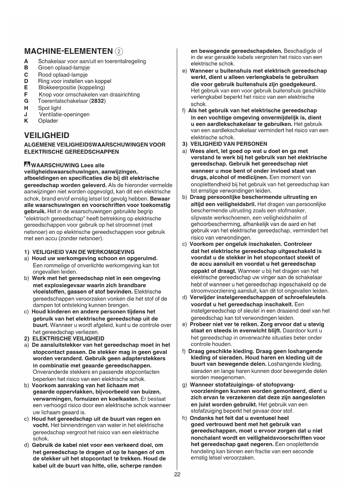 A Schakelaar voor aan/uit en toerentalregeling B Groen oplaad-lampje C Rood oplaad-lampje D Ring voor instellen van koppel E Blokkeerpositie (koppeling) F Knop voor omschakelen van draairichting G Toerentalschakelaar (2832) H Spot light J Ventilatie-openingen K Oplader VEILIGHEID